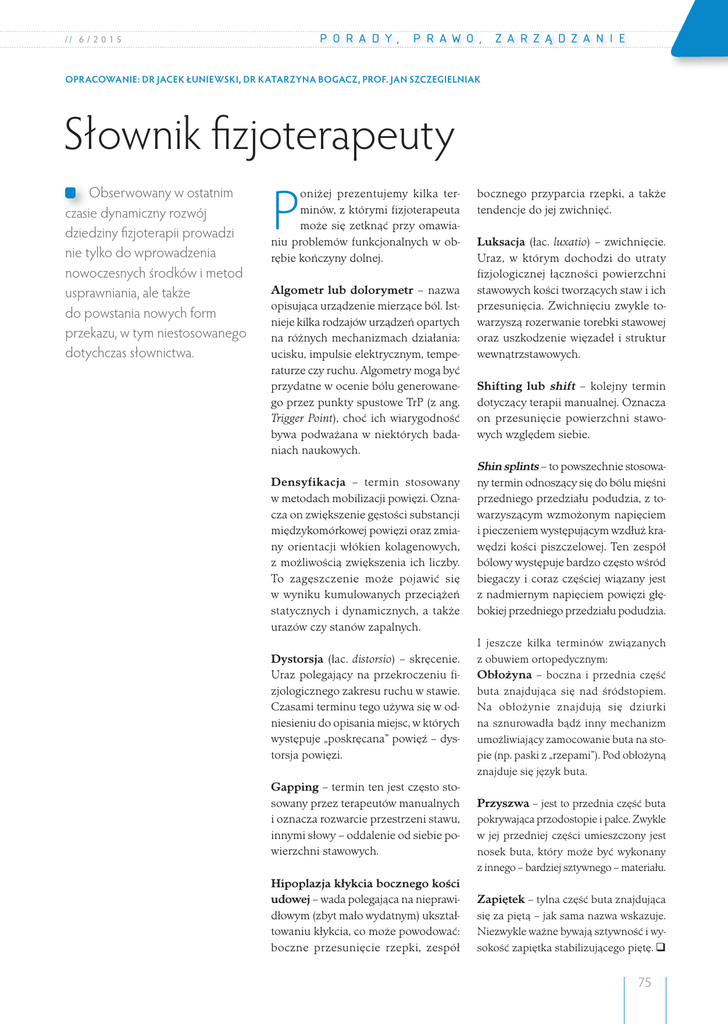 P O R A D Y, // 6 / 2 0 1 5 P R A W O , Z A R Z Ą D Z A N I E OPRACOWANIE: DR JACEK ŁUNIEWSKI, DR KATARZYNA BOGACZ, PROF. JAN SZCZEGIELNIAK Słownik fizjoterapeuty Obserwowany w ostatnim czasie dynamiczny rozwój dziedziny fizjoterapii prowadzi nie tylko do wprowadzenia nowoczesnych środków i metod usprawniania, ale także do powstania nowych form przekazu, w tym niestosowanego dotychczas słownictwa. oniżej prezentujemy kilka terminów, z którymi fizjoterapeuta może się zetknąć przy omawianiu problemów funkcjonalnych w obrębie kończyny dolnej. P Algometr lub dolorymetr – nazwa opisująca urządzenie mierzące ból. Istnieje kilka rodzajów urządzeń opartych na różnych mechanizmach działania: ucisku, impulsie elektrycznym, temperaturze czy ruchu. Algometry mogą być przydatne w ocenie bólu generowanego przez punkty spustowe TrP (z ang. Trigger Point), choć ich wiarygodność bywa podważana w niektórych badaniach naukowych. Densyfikacja – termin stosowany w metodach mobilizacji powięzi. Oznacza on zwiększenie gęstości substancji międzykomórkowej powięzi oraz zmiany orientacji włókien kolagenowych, z możliwością zwiększenia ich liczby. To zagęszczenie może pojawić się w wyniku kumulowanych przeciążeń statycznych i dynamicznych, a także urazów czy stanów zapalnych. Dystorsja (łac. distorsio) – skręcenie. Uraz polegający na przekroczeniu fizjologicznego zakresu ruchu w stawie. Czasami terminu tego używa się w odniesieniu do opisania miejsc, w których występuje „poskręcana” powięź – dystorsja powięzi. Gapping – termin ten jest często stosowany przez terapeutów manualnych i oznacza rozwarcie przestrzeni stawu, innymi słowy – oddalenie od siebie powierzchni stawowych. Hipoplazja kłykcia bocznego kości udowej – wada polegająca na nieprawidłowym (zbyt mało wydatnym) ukształtowaniu kłykcia, co może powodować: boczne przesunięcie rzepki, zespół bocznego przyparcia rzepki, a także tendencje do jej zwichnięć. Luksacja (łac. luxatio) – zwichnięcie. Uraz, w którym dochodzi do utraty fizjologicznej łączności powierzchni stawowych kości tworzących staw i ich przesunięcia. Zwichnięciu zwykle towarzyszą rozerwanie torebki stawowej oraz uszkodzenie więzadeł i struktur wewnątrzstawowych. Shifting lub shift – kolejny termin dotyczący terapii manualnej. Oznacza on przesunięcie powierzchni stawowych względem siebie. Shin splints – to powszechnie stosowany termin odnoszący się do bólu mięśni przedniego przedziału podudzia, z towarzyszącym wzmożonym napięciem i pieczeniem występującym wzdłuż krawędzi kości piszczelowej. Ten zespół bólowy występuje bardzo często wśród biegaczy i coraz częściej wiązany jest z nadmiernym napięciem powięzi głębokiej przedniego przedziału podudzia. I jeszcze kilka terminów związanych z obuwiem ortopedycznym: Obłożyna – boczna i przednia część buta znajdująca się nad śródstopiem. Na obłożynie znajdują się dziurki na sznurowadła bądź inny mechanizm umożliwiający zamocowanie buta na stopie (np. paski z „rzepami”). Pod obłożyną znajduje się język buta. Przyszwa – jest to przednia część buta pokrywająca przodostopie i palce. Zwykle w jej przedniej części umieszczony jest nosek buta, który może być wykonany z innego – bardziej sztywnego – materiału. Zapiętek – tylna część buta znajdująca się za piętą – jak sama nazwa wskazuje. Niezwykle ważne bywają sztywność i wysokość zapiętka stabilizującego piętę. 75