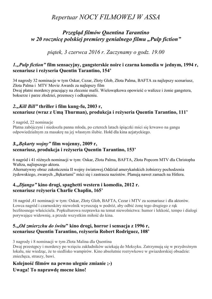 Repertuar NOCY FILMOWEJ W ASSA Przegląd filmów Quentina Tarantino w 20 rocznicę polskiej premiery genialnego filmu „Pulp fiction” piątek, 3 czerwca 2016 r. Zaczynamy o godz. 19.00 1.„Pulp fiction” film sensacyjny, gangsterskie noire i czarna komedia w jednym, 1994 r, scenariusz i reżyseria Quentin Tarantino, 154’ 34 nagrody 32 nominacje w tym Oskar, Cezar, Złoty Glob, Złota Palma, BAFTA za najlepszy scenariusz, Złota Palma i MTV Movie Awards za najlepszy film Dwaj płatni mordercy pracujący na zlecenie mafii. Wielowątkowa opowieść o walizce i żonie gangstera, bokserze i parze złodziei, przemocy i odkupieniu. 2.„Kill Bill” thriller i film kung-fu, 2003 r, scenariusz (wraz z Umą Thurman), produkcja i reżyseria Quentin Tarantino, 111’ 5 nagród, 22 nominacje Płatna zabójczyni i niedoszła panna młoda, po czterech latach śpiączki mści się krwawo na gangu odpowiedzialnym za masakrę na jej własnym ślubie. Hołd dla kina azjatyckiego. 3.„Bękarty wojny” film wojenny, 2009 r, scenariusz, produkcja i reżyseria Quentin Tarantino, 153’ 6 nagród i 41 różnych nominacji w tym: Oskar, Złota Palma, BAFTA, Złota Popcorn MTV dla Christopha Waltza, najlepszego aktora. Alternatywny obraz zakończenia II wojny światowej.Oddział amerykańskich żołnierzy pochodzenia żydowskiego, zwanych „Bękartami” mści się i zastrasza nazistów. Planują nawet zamach na Hitlera. 4.„Django” kino drogi, spaghetti western i komedia, 2012 r. scenariusz reżyseria Charlie Chaplin, 165’ 16 nagród ,41 nominacji w tym: Oskar, Złoty Glob, BAFTA, Cezar i MTV za scenariusz i dla aktorów. Łowca nagród i czarnoskóry niewolnik wyruszają w podróż, aby odbić żonę tego drugiego z rąk bezlitosnego właściciela. Popkulturowa rozprawka na temat niewolnictwa: humor i lekkość, tempo i dialogi porywające widownię, a przede wszystkim miłość do kina. 5.„Od zmierzchu do świtu” kino drogi, horror i sensacja z 1996 r, scenariusz Quentin Tarantino, reżyseria Robert Rodriguez, 108’ 3 nagrody i 8 nominacji w tym Złota Malina dla Quentina Dwaj przestępcy i mordercy po wzięciu zakładników uciekają do Meksyku. Zatrzymują się w przydrożnym lokalu, nie wiedząc, że to siedlisko wampirów. Kino absolutnie rozrywkowe w gwiazdorskiej obsadzie: zniechęca, straszy, bawi. Kolejność filmów na pewno ulegnie zmianie ;-) Uwaga! To naprawdę mocne kino!