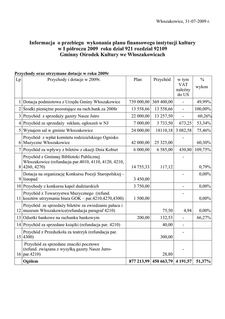 Włoszakowice, 31-07-2009 r. Informacja o przebiegu wykonania planu finansowego instytucji kultury w I półroczu 2009 roku dział 921 rozdział 92109 Gminny Ośrodek Kultury we Włoszakowicach Przychody oraz otrzymane dotacje w roku 2009r Lp Przychody i dotacje w 2009r. 1 Dotacja podmiotowa z Urzędu Gminy Włoszakowice Plan Przychód 739 000,00 369 400,00 w tym VAT należny do US % wykon - 49,99% 2 Środki pieniężne pozostające na rach.bank.za 2008r 13 558,66 13 558,66 - 100,00% 3 Przychód z sprzedaży gazety Nasze Jutro 22 000,00 13 257,50 - 60,26% 7 000,00 3 733,50 4 Przychód ze sprzedaży reklam, ogłoszeń w NJ 5 Wynajem sal w gminie Włoszakowice 24 000,00 673,25 53,34% 18110,18 3 082,58 75,46% Przychód z wpłat komitetu rodzicielskiego Ognisko 6 Muzyczne Włoszakowice 42 000,00 25 325,00 60,30% 7 Przychód za wpływy z biletów z okazji Dnia Kobiet 6 000,00 6 585,00 430,80 109,75% Przychód z Gminnej Biblioteki Publicznej Włoszakowice (refundacja par.4010, 4110, 4120, 4210, 8 4260, 4270) Dotacja na organizację Konkursu Poezji Staropolskiej 9 listopad - 14 755,33 3 750,00 Przychód z Towarzystwa Muzycznego (refund. 11 kosztów utrzymania biura GOK – par.4210,4270,4300) 1 500,00 Przychód z Przedszkola za teatrzyk (refundacja par. 15 4300) Przychód za sprzedane znaczki pocztowe (refund. związana z wysyłką gazety Nasze Jutro16 par.4210) Ogółem - 0,00% - 0,00% - Przychód ze sprzedaży biletów za zwiedzanie pałacu i 12 muzeum Włoszakowice(refundacja paragraf 4210) 14 Przychód za sprzedane książki (refundacja par. 4210) 0,79% 3 450,00 10 Przychody z konkursu kapel dudziarskich 13 Odsetki bankowe na rachunku bankowym 117,12 0,00% 75,50 200,00 4,94 132,53 - 40,00 - 0,00% 66,27% 300,00 28,80 877 213,99 450 663,79 4 191,57 51,37% Wydatki poniesione w 2009r. Wydatki poniesione w 2009r. Plan w zł Wydatki w zł. % wykon § 3020 Wydatki osobowe nie zaliczane do wynagrodzeń 5 370,00 900,00 16,76% § 3040 Nagrody i wydatki osobowe nie zaliczane do wynagr. 4 500,00 1 800,00 40,00% 215 378,40 83 393,27 30,72% 39 905,78 13 125,91 32,89% 5 296,15 1 710,02 32,29% 85 366,00 37 231,18 43,61% 192 758,66 85 591,82 44,40% § 4260 Zakup energii 31 750,00 21 637,13 68,15% § 4270 Zakup usług remontowych 61 600,00 20 493,05 33,27% § 4280 Zakup usług zdrowotnych 1 500,00 1 029,00 68,60% 143 706,30 8 407 3,95 58,50% § 4370 Zakup usług telekomunikacji stacjonarnej 4 650,00 1 005,76 21,63% § 4410 Podróże służbowe krajowe 7 932,70 4 925,60 62,09% § 4430 Różne opłaty i składki 3 000,00 1 615,00 53,83% § 4440 Odpis na ZFŚS 7 750,00 181,95 2,35% § 4740 Zakup papieru do drukarek, kser i faksu 1 500,00 771,34 51,42% 150,00 149,36 99,57% 0,00 0,00 Przekazana dotacja dla Towarzystwa Muzycznego 60 000,00 60 000,00 100,00% Podatek od towarów i usług VAT zapłacony do US 5 100,00 986,00 19,33% 877 213,99 420 620,34 47,95% § 4010 Wynagrodzenie osobowe pracowników § 4110 Składki na ubezpieczenie społeczne § 4120 Składki na Fundusz Pracy § 4170 Wynagrodzenie bezosobowe § 4210 Zakup materiałów i wyposażenia § 4300 Zakup usług pozostałych § 4950 Różnice kursowe § 6050 Wydatki inwestycyjne jednostek OGÓŁEM Wydatki w § 3020 składały się z wypłaconego ekwiwalentu za materiały biurowe. Wydatki w § 3040 składały się z nagród wypłaconych dla chórzystów Wydatki w § 4010 składały się z wynagrodzeń pracowniczych pracowników Gminnego Ośrodka Kultury. Wydatki w § 4110 składały się z zapłaconych składek na ubezpieczenie emerytalno-rentowo-wypadkowe pracowników GOK, instruktorów Ogniska Muzycznego, opiekunów sal gminnych oraz osób zatrudnionych na umowy-zlecenia związane z organizacją imprez kulturalnych. Wydatki w § 4120 składały się z zapłaconych składek na Fundusz Pracy dotyczących pracowników GOK. Wydatki w § 4170 składały się z wynagrodzeń osób zatrudnionych w GOK w ramach umów zleceń lub umów o dzieło związanych: z zatrudnieniem świetlicowych na salach w gminie, z zatrudnieniem instruktorów w Ognisku Muzycznym, z zatrudnieniem osób obsługujących imprezy GOK (obsługa jury, obsługa kuchni, obsługa nagłośnienia imprez), stroiciela instrumentów muzycznych. Wydatki w § 4210 składały się z zakupu materiałów i wyposażenia: •biuro: 11711,58 zł – materiały biurowe, cardridge, filiżanki, cukiernice. Dzbanki, talerze deserowe, łyżeczki, książka z nutami E. Piaf, paliwo – koszty używania samochodu, drukarka, art spożywcze dla gości biura, doniczki, nawóz do kwiatów, router, toner do ksero i inne •redakcja NJ: 528,60 zł – książka - nagroda, art spożywcze na paczki świąteczne dla współpracowników NJ, pucharki do lodów-nagrody w NJ •Ognisko Muzyczne: 818,00 zł - środki czystości, artykuły spożywcze na zakończenie semestru i zakończenie roku, płyty CD dla absolwentów, statuetka od SOM dla chóru •pokoje gościnne: 2498,61 zł – pościel, kołdry, prześcieradła, środki czystości •Sale: Włoszakowice 2839,15 zł – środki czystości, ręczniki do naczyń, materiały • budowlane – remont kuchni, gaz, kwiaty na rabaty, tkanina na obrusy Bukówiec Górny 596,10 zł – ręczniki papierowe zielone, środki czystości, paliwo • do kosiarki, nawóz do trawy, wąż do podlewania, • Grotniki 115,37 zł – środki czystości • Krzycko Wielkie 840,69 zł – środki czystości, paliwo do kosiarki, materiały – naprawa urządzeń sanitarnych Zbarzewo 1304,33 zł – sól pastewna, rozpałka do pieca, • wieszaki, środki czystości, samozamykacz, płyta do pieca • Boguszyn 183,14 zł – środki czystości • Dłużyna 358,30 zł – łopata, odśnieżacz, zamiatacz, paliwo do kosiarki, środki czystości, nóż do kosiarki, • Sądzia 132,95 zł – środki czystości, paliwo i olej do piły • piwnica pod salą (Muzeum Karola Kurpińskiego) 3013,05 zł – łaty sosnowe, materiały budowlane – prace przygotowawcze Muzeum KK, oprawy mosiądz, żarówki 