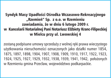 Syndyk Masy Upadłości Ośrodka Wczasowo-Rekreacyjnego „Rzemień” Sp. z o.o. w Rzemieniu zawiadamia, że w dniu 6 lutego 2009 r. w Kancelarii Notarialnej Pani Notariusz Elżbiety Kranc-Filipeckiej w Mielcu przy ul. Lwowskiej 4 zostaną podpisane umowy sprzedaży z wolnej ręki prawa wieczystego użytkowania nieruchomości oznaczonych jako działki numer 1854, 1875, 1897, 1898, 1904, 1907, 1908, 1909, 1910, 1917, 1922, 1923, 1924, 1925, 1927, 1929, 1932, 1938, 1939, 1941, 1942, położonych w Rzemieniu gmina Przecław, województwo podkarpackie.