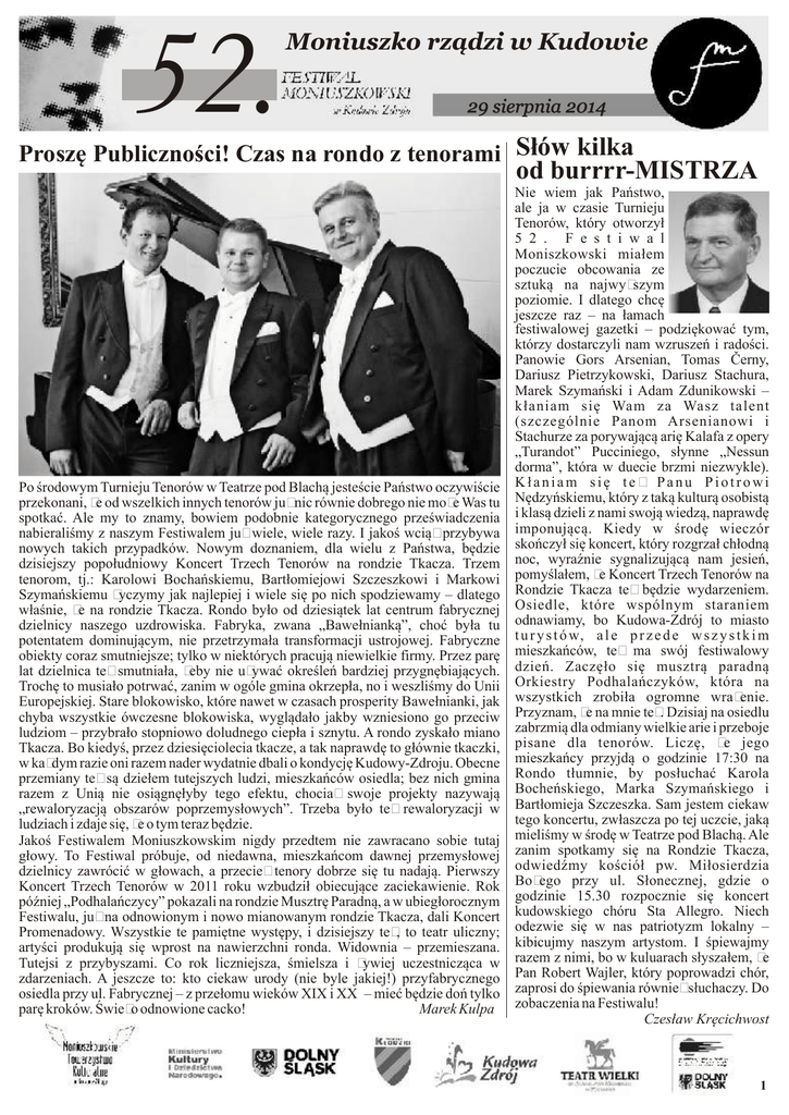 52. Moniuszko rządzi w Kudowie 29 sierpnia 2014 Proszę Publiczności! Czas na rondo z tenorami Słów kilka od burrrr-MISTRZA Po środowym Turnieju Tenorów w Teatrze pod Blachą jesteście Państwo oczywiście przekonani, że od wszelkich innych tenorów już nic równie dobrego nie może Was tu spotkać. Ale my to znamy, bowiem podobnie kategorycznego przeświadczenia nabieraliśmy z naszym Festiwalem już wiele, wiele razy. I jakoś wciąż przybywa nowych takich przypadków. Nowym doznaniem, dla wielu z Państwa, będzie dzisiejszy popołudniowy Koncert Trzech Tenorów na rondzie Tkacza. Trzem tenorom, tj.: Karolowi Bochańskiemu, Bartłomiejowi Szczeszkowi i Markowi Szymańskiemu życzymy jak najlepiej i wiele się po nich spodziewamy – dlatego właśnie, że na rondzie Tkacza. Rondo było od dziesiątek lat centrum fabrycznej dzielnicy naszego uzdrowiska. Fabryka, zwana „Bawełnianką”, choć była tu potentatem dominującym, nie przetrzymała transformacji ustrojowej. Fabryczne obiekty coraz smutniejsze; tylko w niektórych pracują niewielkie firmy. Przez parę lat dzielnica też smutniała, żeby nie używać określeń bardziej przygnębiających. Trochę to musiało potrwać, zanim w ogóle gmina okrzepła, no i weszliśmy do Unii Europejskiej. Stare blokowisko, które nawet w czasach prosperity Bawełnianki, jak chyba wszystkie ówczesne blokowiska, wyglądało jakby wzniesiono go przeciw ludziom – przybrało stopniowo doludnego ciepła i sznytu. A rondo zyskało miano Tkacza. Bo kiedyś, przez dziesięciolecia tkacze, a tak naprawdę to głównie tkaczki, w każdym razie oni razem nader wydatnie dbali o kondycję Kudowy-Zdroju. Obecne przemiany też są dziełem tutejszych ludzi, mieszkańców osiedla; bez nich gmina razem z Unią nie osiągnęłyby tego efektu, chociaż swoje projekty nazywają „rewaloryzacją obszarów poprzemysłowych”. Trzeba było też rewaloryzacji w ludziach i zdaje się, że o tym teraz będzie. Jakoś Festiwalem Moniuszkowskim nigdy przedtem nie zawracano sobie tutaj głowy. To Festiwal próbuje, od niedawna, mieszkańcom dawnej przemysłowej dzielnicy zawrócić w głowach, a przecież tenory dobrze się tu nadają. Pierwszy Koncert Trzech Tenorów w 2011 roku wzbudził obiecujące zaciekawienie. Rok później „Podhalańczycy” pokazali na rondzie Musztrę Paradną, a w ubiegłorocznym Festiwalu, już na odnowionym i nowo mianowanym rondzie Tkacza, dali Koncert Promenadowy. Wszystkie te pamiętne występy, i dzisiejszy też, to teatr uliczny; artyści produkują się wprost na nawierzchni ronda. Widownia – przemieszana. Tutejsi z przybyszami. Co rok liczniejsza, śmielsza i żywiej uczestnicząca w zdarzeniach. A jeszcze to: kto ciekaw urody (nie byle jakiej!) przyfabrycznego osiedla przy ul. Fabrycznej – z przełomu wieków XIX i XX – mieć będzie doń tylko parę kroków. Świeżo odnowione cacko! Marek Kulpa Nie wiem jak Państwo, ale ja w czasie Turnieju Tenorów, który otworzył 5 2 . F e s t i w a l Moniszkowski miałem poczucie obcowania ze sztuką na najwyższym poziomie. I dlatego chcę jeszcze raz – na łamach festiwalowej gazetki – podziękować tym, którzy dostarczyli nam wzruszeń i radości. Panowie Gors Arsenian, Tomas Černy, Dariusz Pietrzykowski, Dariusz Stachura, Marek Szymański i Adam Zdunikowski – kłaniam się Wam za Wasz talent (szczególnie Panom Arsenianowi i Stachurze za porywającą arię Kalafa z opery „Turandot” Pucciniego, słynne „Nessun dorma”, która w duecie brzmi niezwykle). Kłaniam się też Panu Piotrowi Nędzyńskiemu, który z taką kulturą osobistą i klasą dzieli z nami swoją wiedzą, naprawdę imponującą. Kiedy w środę wieczór skończył się koncert, który rozgrzał chłodną noc, wyraźnie sygnalizującą nam jesień, pomyślałem, że Koncert Trzech Tenorów na Rondzie Tkacza też będzie wydarzeniem. Osiedle, które wspólnym staraniem odnawiamy, bo Kudowa-Zdrój to miasto t u r y s t ó w, a l e p r z e d e w s z y s t k i m mieszkańców, też ma swój festiwalowy dzień. Zaczęło się musztrą paradną Orkiestry Podhalańczyków, która na wszystkich zrobiła ogromne wrażenie. Przyznam, że na mnie też. Dzisiaj na osiedlu zabrzmią dla odmiany wielkie arie i przeboje pisane dla tenorów. Liczę, że jego mieszkańcy przyjdą o godzinie 17:30 na Rondo tłumnie, by posłuchać Karola Bocheńskiego, Marka Szymańskiego i Bartłomieja Szczeszka. Sam jestem ciekaw tego koncertu, zwłaszcza po tej uczcie, jaką mieliśmy w środę w Teatrze pod Blachą. Ale zanim spotkamy się na Rondzie Tkacza, odwiedźmy kościół pw. Miłosierdzia Bożego przy ul. Słonecznej, gdzie o godzinie 15.30 rozpocznie się koncert kudowskiego chóru Sta Allegro. Niech odezwie się w nas patriotyzm lokalny – kibicujmy naszym artystom. I śpiewajmy razem z nimi, bo w kuluarach słyszałem, że Pan Robert Wajler, który poprowadzi chór, zaprosi do śpiewania również słuchaczy. Do zobaczenia na Festiwalu! Czesław Kręcichwost 1 Dziennikarskie spotkanie z muzyką Wydaje mi się , że po dzisiejszym spektaklu w reżyserii Janusza Monarchy z Wiednia, który zaprezentuje nam swoje ‘’Wakacje z Moniuszką’’, można śmiało stwierdzić, że to udane dla nas wszystkich wakacyjne sierpniowe dni. Jedynym tenorem wśród basów i barytonów monarchowego widowiska jest czekający już od wielu lat na tegoroczną, wrześniową profesorską nominację Tadeusz Pszonka ongiś związany też z Wiedniem i z KammerOper a obecnie koncertujący po całej Europie i mający swoją klasę śpiewu w Akademii Muzycznej we Wrocławiu. Tadeusz Pszonka to śpiewak o zacięciu aktorskim, który nie tylko talentem tym się wyróżnia wśród śpiewającej braci ale i malarz i grafik. Kilkanaście lat temu gdy został bohaterem mojej telewizyjnej „Przepytywanki’’ przywiózł do studia TV we Wrocławiu niezliczoną ilość obrazów olejnych wielkiego formatu a kierownictwo produkcji drża