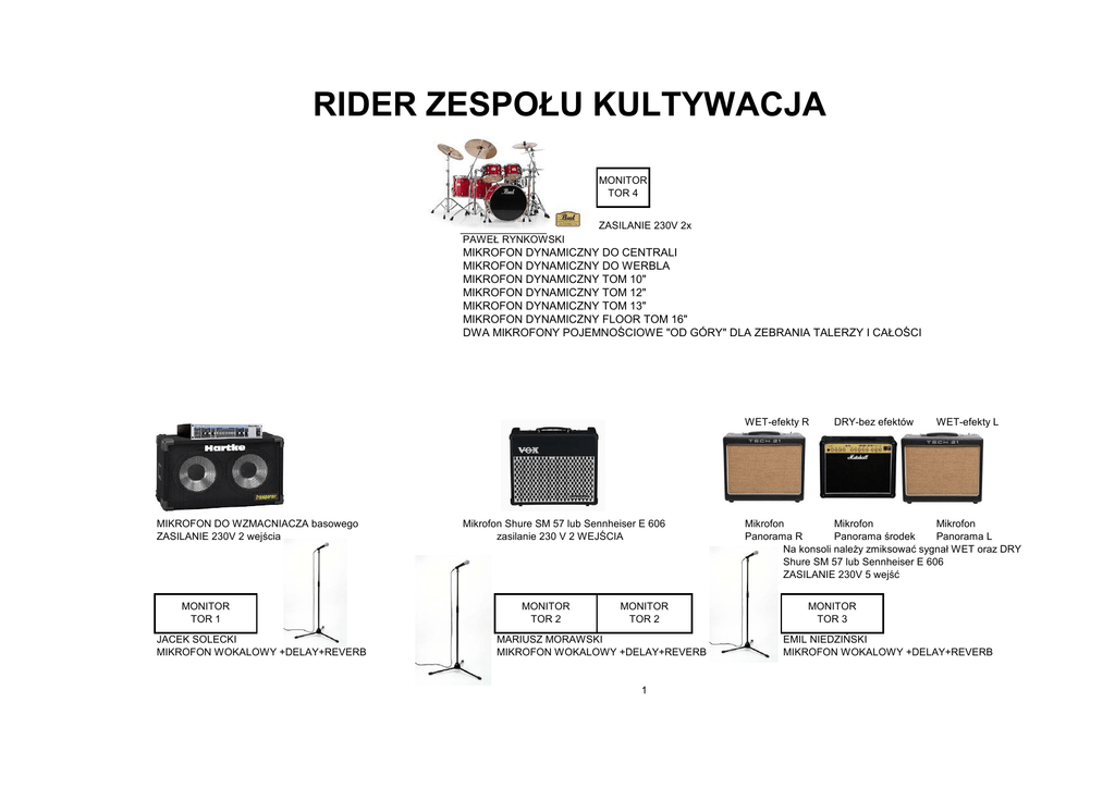 RIDER ZESPOŁU KULTYWACJA PERKUSJA MONITOR TOR 4 ZASILANIE 230V 2x PAWEŁ RYNKOWSKI MIKROFON DYNAMICZNY DO CENTRALI MIKROFON DYNAMICZNY DO WERBLA MIKROFON DYNAMICZNY TOM 10" MIKROFON DYNAMICZNY TOM 12" MIKROFON DYNAMICZNY TOM 13" MIKROFON DYNAMICZNY FLOOR TOM 16" DWA MIKROFONY POJEMNOŚCIOWE "OD GÓRY" DLA ZEBRANIA TALERZY I CAŁOŚCI WET-efekty R MIKROFON DO WZMACNIACZA basowego ZASILANIE 230V 2 wejścia MONITOR TOR 1 JACEK SOLECKI MIKROFON WOKALOWY +DELAY+REVERB Mikrofon Shure SM 57 lub Sennheiser E 606 zasilanie 230 V 2 WEJŚCIA MONITOR TOR 2 MONITOR TOR 2 MARIUSZ MORAWSKI MIKROFON WOKALOWY +DELAY+REVERB 1 DRY-bez efektów WET-efekty L Mikrofon Mikrofon Mikrofon Panorama R Panorama środek Panorama L Na konsoli należy zmiksować sygnał WET oraz DRY Shure SM 57 lub Sennheiser E 606 ZASILANIE 230V 5 wejść MONITOR TOR 3 EMIL NIEDZIŃSKI MIKROFON WOKALOWY +DELAY+REVERB Rider zespołu Kultywacja cd. Rider jest spisem technicznych aspektów niezbędnych do realizacji koncertu. Pozostałe parametry: -scena powinna mieć wymiary min. 6x4m oraz zadaszenie – gdy koncert jest plenerowy -oświetlenie -system PA powinien być uznanych marek (Nexo, JBL, Meyer Sound…) zapewniający pokrycie dźwiękiem całego terenu koncertowego -moc systemu PA min. 2x3 kW stereo -monitory sceniczne 5 szt. w 4 torach (w tym 2 dla głównego wokalisty) -wyjście z mixera Jack 3,5 mm stereo do rejestracji sumy sygnału rejestratorem cyfrowym -system WET/DRY/WET (gitara Emil) to system składający się z wzmacniacza lampowego na środku -DRY- oraz dwóch wzmacniaczy których płynie sygnał z efektami L i R czyli sygnał WET, które należy ustawić w panoramie – odpowiednio jeden w L drugi w R. Każdy z trzech wzmacniaczy wymaga nagłośnienia mikrofonem. Na konsoli należy tak zmiksować sygnał WET i DRY, aby oba były dobrze słyszalne. Organizator oraz firma zapewniająca nagłośnienie i zasilanie sprzętu wykonawcom bierze na siebie całkowitą odpowiedzialność za bezpieczeństwo elektryczne wykonawców, realizatora oraz ich sprzętu. Osoba kontaktowa w kwestiach technicznych: Emil Niedziński Tel. 502 614 192 - na pewno się dogadamyJ
