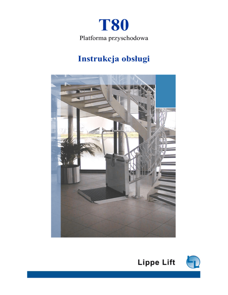 T80 Platforma przyschodowa Instrukcja obsługi Platforma przyschodowa – T80 INSTRUKCJA TŁUMACZONA Z ORGINALNEJ INSTRUKCJI NIEMIECKIEJ PRZECZYTAJ DOKŁADNIE INSTRUKCJĘ PRZED INSTALACJĄ I PIERWSZYM UŻYCIEM ZWRÓĆ SZCZEGÓLNĄ UWAGĘ NA ROZDZIAŁ „PRZEPISY BEZPIECZEŃSTWA I INSTRUKCJE” PRZECHOWUJ TĄ INSTRUKCJĘ TAK, BY ZAWSZE MIEĆ DO NIEJ DOSTĘP 2 Platforma przyschodowa – T80 Spis treści Przedmowa................................................................................................................................ 4 Przepisy bezpieczeństwa i instrukcje...................................................................................... 6 1. Działanie............................................................................................................................ 7 1.1 Szkic platformy przychodowej z osłoną metalową..................................................... 7 1.2 Szkic platformy przychodowej z osłoną z tworzywa sztucznego ............................... 8 1.3 Opis ogólny ................................................................................................................. 9 1.4 Zasilanie prądem stałym.............................................................................................. 9 1.4.1 Wyłącznik główny.............................................................................................. 9 1.4.2 Zabezpieczenie przed całkowitym wyładowaniem akumulatorów.................... 9 1.4.3 Ładowarka........................................................................................................ 10 1.5 Przywoływanie i odsyłanie platformy (wykonanie standardowe) ............................ 10 1.5.1 Platforma automatyczna................................................................................... 12 1.5.2 Platforma manualna.......................................................................................... 12 1.6 1.7 Jazda platformą (wykonanie standardowe) ............................................................... 13 Jak należy postępować podczas nagłego zatrzymania się urządzenia, np. z powodu braku zasilania........................................................................................................... 15 1.7.1 Obsługa manualna / za pomocą koła ręcznego ................................................ 15 1.7.2 Ewakuacja ........................................................................................................ 17 2. Wyposażenie dodatkowe................................................................................................ 19 Składane siedzenie .................................................................................................... 19 Alarm......................................................................................................................... 19 Najazd boczny ........................................................................................................... 19 Listwa zabezpieczająca ............................................................................................. 19 Sygnały ostrzegawcze – optyczne / akustyczne........................................................ 20 2.1 2.2 2.3 2.4 2.5 3. Gdy wystąpią zakłócenia ............................................................................................... 20 4. Kontakt............................................................................................................................ 22 3 Platforma przyschodowa – T80 Przedmowa Gratulacje! Wybierając naszą platformę przyschodową T80 podjęliście Państwo trafną decyzję. Dziękujemy za okazane zaufanie. Nasze platformy przekonują do siebie rozwiązaniami technicznymi, funkcjonalnością oraz wyglądem zewnętrznym. Opis ten ma na celu dodatkowe zapoznanie się z działaniem platformy, po tym jak otrzymaliście Państwo instrukcje od osoby montującej urządzenie. Platforma odpowiada ściśle przepisom TÜV; jest łatwa w obsłudze i serwisowaniu. Prosimy o bardzo dokładne zapoznanie się z instrukcją obsługi jak i przestrzegania zasad bezpieczeństwa zawartych w pkt. „Przepisy bezpieczeństwa i instrukcje”. Symbole W tej instrukcji użyte zostały następujące symbole: WSKAZÓWKA Wskazówki i rady dla łatwiejszego wykonania odpowiednich czynności. PRZESTROGA Czynności, które mogą spowodować uszkodzenie urządzenia, otoczenia lub zanieczyszczenie środowiska, jeśli nie zostaną przeprowadzone starannie. OSTRZEŻENIE Czynności, które mogą spowodować uszkodzenie urządzenia, otoczenia lub środowiska, jeśli nie są przeprowadzane z odpowiednią ostrożnością. 4 Platforma przyschodowa – T80 Obsługa i wsparcie techniczne Aby być pewnym, że urządzenie pracuje poprawnie i bezpiecznie należy je regularnie sprawdzać i serwisować. Przypominamy że do obowiązków użytkownika należy regularne dokonywanie przeglądów serwisowych urządzenia, przez wykwalifikowanych i uprawnionych konserwatorów urządzeń dźwigowych. Platforma przyschodowa i środowisko Akumulatory W platformie przyschodowej zainstalowane jest kilka akumulatorów służących do zasilania urządzenia. Akumulatory powinny być wymieniane przez wykwalifikowany personel. Należy pamiętać, aby nie wyrzucać starych akumulatorów do kosza na śmieci, lecz zwrócić je podczas zakupu nowych. Jeśli nie jest to możliwe skontaktuj się z Władzami Lokalnymi i dowiedz się gdzie możesz dostarczyć zużyte baterie. Usuwanie windy krzesełkowej Platformy, które nie są w użytku, są zazwyczaj zwracane do dealera po wcześniejszej konsultacji. Jeżeli nie jest to możliwe należy zwrócić się do Władz Lokalnych i dowiedzieć się, jakie są metody przetwarzania takich materiałów. 5 Platforma przyschodowa – T80 Przepisy bezpieczeństwa i instrukcje Ogólne Chociaż nasza platforma spełnia wymogi przepisów bezpieczeństwa, prosimy o przestrzegania poniższych uwag. - P