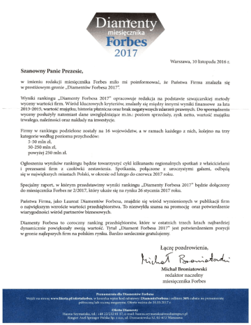 Diarrtenty Forbes 2017 Warszawa, 10 listopada 2016 r. Szanowny Panie Prezesie, w imieniu redakcji miesięcznika Forbes miło mi poinformować, że Państwa Firma znalazła się w prestiżowym gronie „Diamentów Forbesa 2017". Wyniki rankingu „Diamenty Forbesa 2017" opracowuje redakcja na podstawie szwajcarskiej metody wyceny wartości firm. Wśród kluczowych kryteriów, znalazły się między innymi wyniki finansowe za lata 2013-2015, wartość majątku, historia płatniczaroraz brak negatywnych^arzeń prawnych. Do sporządzenia wyceny posłużyły natomiast dane uwzględniające m.in.: poziom sprzedaży, zysk netto, wartość majątku trwałego, należności oraz nakłady na inwestycje. Firmy w rankingu podzielone zostały na 16 województw, a w ramach każdego z nich, kolejno na trzy kategorie według poziomu przychodów: 5-50 min zł, 50-250 min zł, powyżej 250 min zł. Ogłoszeniu wyników rankingu będzie towarzyszyć cykl kilkunastu regionalnych spotkań z właścicielami i prezesami firm z czołówki zestawienia. Spotkania, połączone z uroczystymi galami, odbędą się w największych miastach Polski, w okresie od lutego do czerwca 2017 roku. Specjalny raport, w którym przedstawimy wyniki rankingu „Diamenty Forbesa 2017" będzie dołączony do miesięcznika Forbes nr 2/2017, który ukaże się na rynku 26 stycznia 2017 roku. Państwa Firma, jako Laureat Diamentów Forbesa, znajdzie się wśród wymienionych w publikacji firm o największym wzroście wartości przedsiębiorstwa. To niezwykła szansa na promocję oraz potwierdzenie wiarygodności wśród partnerów biznesowych. Diamenty Forbesa to coroczny ranking przedsiębiorstw, które w ostatnich trzech latach najbardziej dynamicznie powiększały swoją wartość. Tytuł „Diament Forbesa 2017" jest potwierdzeniem pozycji w gronie najlepszych firm na polskim rynku. Bardzo serdecznie gratulujemy Łączę pozdrowienia, Michał Broniatowski redaktor naczelny miesięcznika Forbes Prenumerata dla Diamentów Forbesa Wejdź na stronę www.literia.pl/ofertaforbes, w koszyku wpisz kod rabatowy: DiamentyForbesa i odbierz 36% rabatu na prenumeratę półroczną lub roczną magazynu. Oferta ważna do 31.03.2017 r. , . , Oferta Diamenty Hanna Szymańska, tel.: +48 22/232 01 17, e-niail: [email protected] Ringier Axel Springer Polska Sp. zo,o., u l Domaniewska52,02-672 Warszawa , ^ .:.