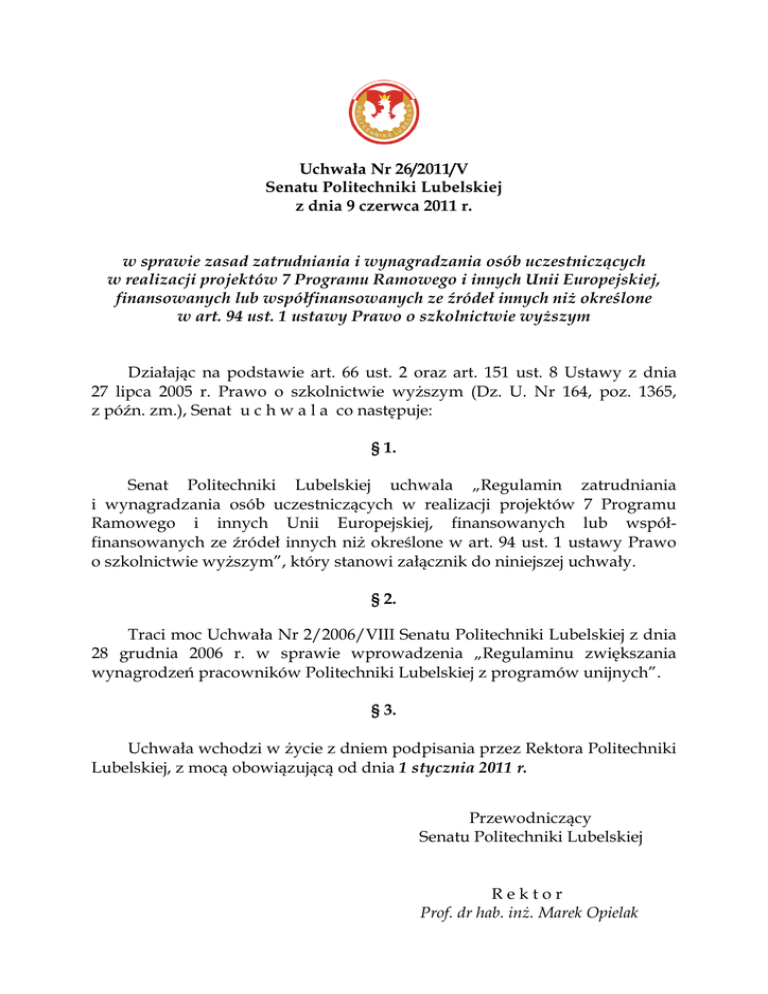 Uchwała Nr 26/2011/V Senatu Politechniki Lubelskiej z dnia 9 czerwca 2011 r. w sprawie zasad zatrudniania i wynagradzania osób uczestniczących w realizacji projektów 7 Programu Ramowego i innych Unii Europejskiej, finansowanych lub współfinansowanych ze źródeł innych niż określone w art. 94 ust. 1 ustawy Prawo o szkolnictwie wyższym Działając na podstawie art. 66 ust. 2 oraz art. 151 ust. 8 Ustawy z dnia 27 lipca 2005 r. Prawo o szkolnictwie wyższym (Dz. U. Nr 164, poz. 1365, z późn. zm.), Senat u c h w a l a co następuje: § 1. Senat Politechniki Lubelskiej uchwala „Regulamin zatrudniania i wynagradzania osób uczestniczących w realizacji projektów 7 Programu Ramowego i innych Unii Europejskiej, finansowanych lub współfinansowanych ze źródeł innych niż określone w art. 94 ust. 1 ustawy Prawo o szkolnictwie wyższym”, który stanowi załącznik do niniejszej uchwały. § 2. Traci moc Uchwała Nr 2/2006/VIII Senatu Politechniki Lubelskiej z dnia 28 grudnia 2006 r. w sprawie wprowadzenia „Regulaminu zwiększania wynagrodzeń pracowników Politechniki Lubelskiej z programów unijnych”. § 3. Uchwała wchodzi w życie z dniem podpisania przez Rektora Politechniki Lubelskiej, z mocą obowiązującą od dnia 1 stycznia 2011 r. Przewodniczący Senatu Politechniki Lubelskiej Rektor Prof. dr hab. inż. Marek Opielak Załącznik do Uchwały Nr 26/2011/V Senatu Politechniki Lubelskiej z dnia 9 czerwca 2011 r. Regulamin zatrudniania i wynagradzania osób uczestniczących w realizacji projektów 7 Programu Ramowego i innych Unii Europejskiej, finansowanych lub współfinansowanych ze źródeł innych niż określone w art. 94 ust. 1 ustawy Prawo o szkolnictwie wyższym § 1. Przepisy Regulaminu mają zastosowanie do pracowników Politechniki Lubelskiej oraz do osób niezatrudnionych w Uczelni, a wykonujących czynności przy realizacji projektów. § 2. Użyte w Regulaminie określenia oznaczają: 1) Uczelnia – Politechnika Lubelska w Lublinie; 2) Ustawa – ustawa z dnia 27 lipca 2005 r. Prawo o szkolnictwie wyższym (Dz. U. Nr 164, poz. 1365, z późn. zm.); 3) Rozporządzenie – Rozporządzenie Ministra Nauki i Szkolnictwa Wyższego z dnia 22 grudnia 2006 r. w sprawie warunków wynagradzania za pracę i przyznawania innych świadczeń związanych z pracą dla pracowników zatrudnionych w uczelni publicznej (Dz. U. Nr 251, poz. 1852, z późn. zm.); 4) Pracownik Politechniki Lubelskiej – osoba zatrudniona w Politechnice Lubelskiej na podstawie umowy o pracę, mianowania lub umowy cywilnoprawnej zlecenia; 5) kierownik/koordynator projektu – pracownik Politechniki Lubelskiej kierujący realizacją projektu; 6) projekt – przedsięwzięcie badawcze, edukacyjne 7 Programu Ramowego Unii Europejskiej lub inne finansowane lub współfinansowane ze środków innych niż określone w art. 94 ust 1 ustawy Prawo o szkolnictwie wyższym; 7) miesięczne wynagrodzenie podstawowe pracownika Politechniki Lubelskiej – suma wynagrodzenia zasadniczego, premii regulaminowej, dodatku funkcyjnego, dodatku stażowego wynikającego z osobistego zaszeregowania pracownika oraz proporcjonalnie naliczonych składek ZUS w części dotyczącej pracodawcy, funduszu pracy oraz odpisu na Zakładowy Fundusz Świadczeń Socjalnych (ZFŚS) czyli tzw. wynagrodzenie brutto; 8) bazowa stawka godzinowa pracownika Politechniki Lubelskiej – wartość jednej godziny pracy obliczana na podstawie miesięcznego wynagrodzenia podstawowego danego pracownika Politechniki Lubelskiej za okres ostatnich 12 miesięcy, zgodnie z wnioskiem, o którym mowa w § 4 ust. 8 niniejszego Regulaminu; 9) wynagrodzenie dodatkowe – wynagrodzenie przyznawane indywidualnie pracownikowi Politechniki Lubelskiej za jedną godzinę pracy świadczonej w ramach realizacji projektu, w wysokości do 500% bazowej stawki godzinowej danego Pracownika Politechniki Lubelskiej; 10) godzina – 60 minut; 11) godzina dydaktyczna – 45 minut. § 3. 1. Wynagrodzenie dodatkowe może zostać zakwalifikowane w projekcie jako koszt bezpośredni lub koszt pośredni. 2. Pracownik Politechniki Lubelskiej uczestniczy w realizacji projektu poprzez: 1) podpisanie aneksu do aktu mianowania/umowy o pracę (wynagrodzenie pochodzące z kosztów bezpośrednich projektu), których wzór stanowi załącznik nr 2 i 3 do niniejszego Regulaminu; 2) popisanie umowy zlecenia (wynagrodzenie pochodzące z kosztów pośrednich lub innych jeśli stanowi o tym odrębny zapis finansowy w projekcie), której wzór stanowi załącznik nr 4 do niniejszego Regulaminu; 3) podpisanie kolejnej umowy o pracę, która nie może naruszać przysługującego pracownikowi w każdej dobie prawa do nieprzerwanego odpoczynku; 4) przyznanie przez Rektora dodatku specjalnego zgodnie z postanowieniami Rozporządzeniem Ministra Nauki i Szkolnictwa Wyższego z dnia 22 grudnia 2006 r. w sprawie warunków wynagradzania za pracę i przyznawania innych świadczeń związanych z pracą dla pracowników zatrudnionych w uczelni publicznej. 3. Zakres obowiązków osób uczestniczących w realizacji projektu, dotyczących realizacji projektu ustala kierownik/koordynator projektu. Zakres obowiązków kierownika/koordynatora projektu ustala Rektor. Zakresy obowiązków, o których mowa powyżej wprowadzane są odpowiednio aneksem do umowy o pracę, kolejnej umowy o pracę, a jeżeli praca w zakresie projektu realizowana jest na podstawie umowy cywilnoprawnej zlecenia – zakres obowiązków określony jest w tej umowie. 4. Zatrudnienie pracowników na podstawie umowy o pracę odbywa się na podstawie Ustawy z dnia 26 czerwca 1974 r. Kodeks pracy (Dz. U. Nr 24, poz. 141, z późn. zm.). 5. Zlecanie wykonywania zadań na rzecz projektu w ramach umowy cywilnoprawnej – zlecenia odbywa się z zachowaniem postanowień Ustawy z dnia 23 kwietnia 1964 r. Kodeks cywilny (Dz. U. Nr 16, poz. 93, z późn. zm.). 6. Łączny wymiar czasu pracy przepracowany przez pracownika Politechniki Lubelskiej niebę