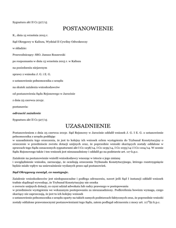 Sygnatura akt II Cz 527/15 POSTANOWIENIE K., dnia 15 września 2015 r. Sąd Okręgowy w Kaliszu, Wydział II Cywilny Odwoławczy w składzie: Przewodniczący: SSO. Janusz Roszewski po rozpoznaniu w dniu 15 września 2015 r. w Kaliszu na posiedzeniu niejawnym sprawy z wniosku J. G. i E. G. o ustanowienie pełnomocnika z urzędu na skutek zażalenia wnioskodawców od postanowienia Sądu Rejonowego w Jarocinie z dnia 25 czerwca 2015r. postanawia: odrzucić zażalenie Sygnatura akt II Cz 527/15 UZASADNIENIE Postanowieniem z dnia 25 czerwca 2015r. Sąd Rejonowy w Jarocinie oddalił wniosek J. G. I E. G. o ustanowienie pełnomocnika z urzędu poddając w uzasadnieniu tego orzeczenia, że jest to kolejny ich wniosek celem wystąpienia do Trybunał Konstytucyjny o orzeczenie w przedmiocie zwrotu dotacji unijnych oraz, że poprzednie wnioski skarżących zostały oddalone w sprawach tego Sądu oznaczonych sygnaturami akt I Co 1238/14, I Co 1239/14, I Co 1035/14 i I Co 1104/14. W ocenie Sądu Rejonowego także i ten wniosek jest nieuzasadniony i oddalił go na podstawie art. 117 k.p.c. Zażalenie na postanowienie wnieśli wnioskodawcy wnosząc w istocie o jego zmianę i uwzględnienie wniosku, zarzucając, że oczekują orzeczenia Trybunału Konstytucyjnego, którego rozstrzygnięcie będzie miało wpływ na unieważnienie wydanych przez sąd postanowień. Sąd Okręgowy zważył, co następuje. Zażalenie wnioskodawców jest niedopuszczalne i podlega odrzuceniu, nawet jeśli Sąd I instancji oddalił wniosek trafnie skądinąd wywodząc, że Trybunał Konstytucyjny nie orzeka o zwrocie unijnych dotacji, co czyni udział adwokata lub radcy prawnego w postepowaniu w przedmiocie wystąpienia we wskazanym postepowaniu za nieuzasadniony. Podkreślenia bowiem wymaga, czego skarżący nie zaprzeczają, że jest to ich kolejny wniosek o ustanowienie pełnomocnika z urzędu oparty na takich samych podstawach faktycznych oraz, że poprzednie wnioski zostały oddalone prawomocnymi postanowieniami tego Sądu, zatem podlegał odrzuceniu z mocy art. 1172§2 k.p.c. Zgodnie z brzmieniem art. 1172 § 1k.p.c. , dodanego nowelą z dnia 17 grudnia 2009 r., w razie oddalenia wniosku o ustanowienie pełnomocnika z urzędu strona nie może ponownie domagać się ustanowienia adwokata lub radcy prawnego, powołując się na te same okoliczności (por. art. 107 u.k.s.c.; por. też wyrok SN z dnia 12 września 2007 r., I CSK 199/07, LEX nr 461625; postanowienie SN z dnia 11 lipca 2000 r., I PZ 45/00, OSNP 2002, nr 2, poz. 45). W takim przypadku wniosek podlegać będzie odrzuceniu. Postanowienie o odrzuceniu wniosku nie jest zaskarżalne zażaleniem. Mając powyższe na uwadze Sąd Okręgowy z mocy art. 370 w zw. z art. 397§2 k.p.c.