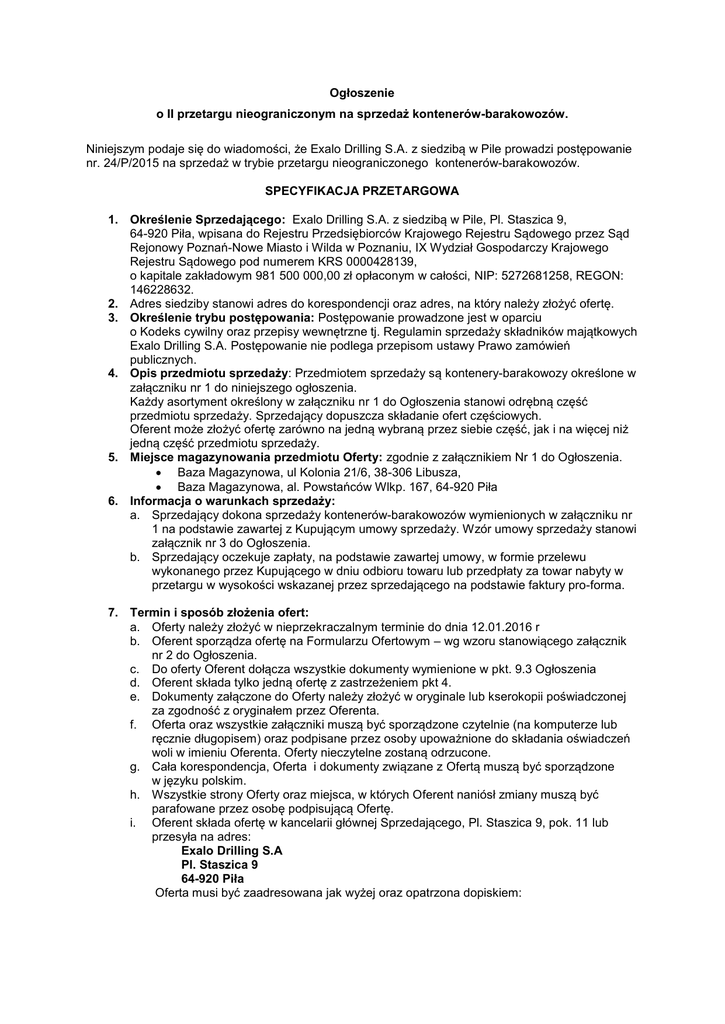 1. Określenie Sprzedającego: Exalo Drilling S.A. z siedzibą w Pile, Pl. Staszica 9,