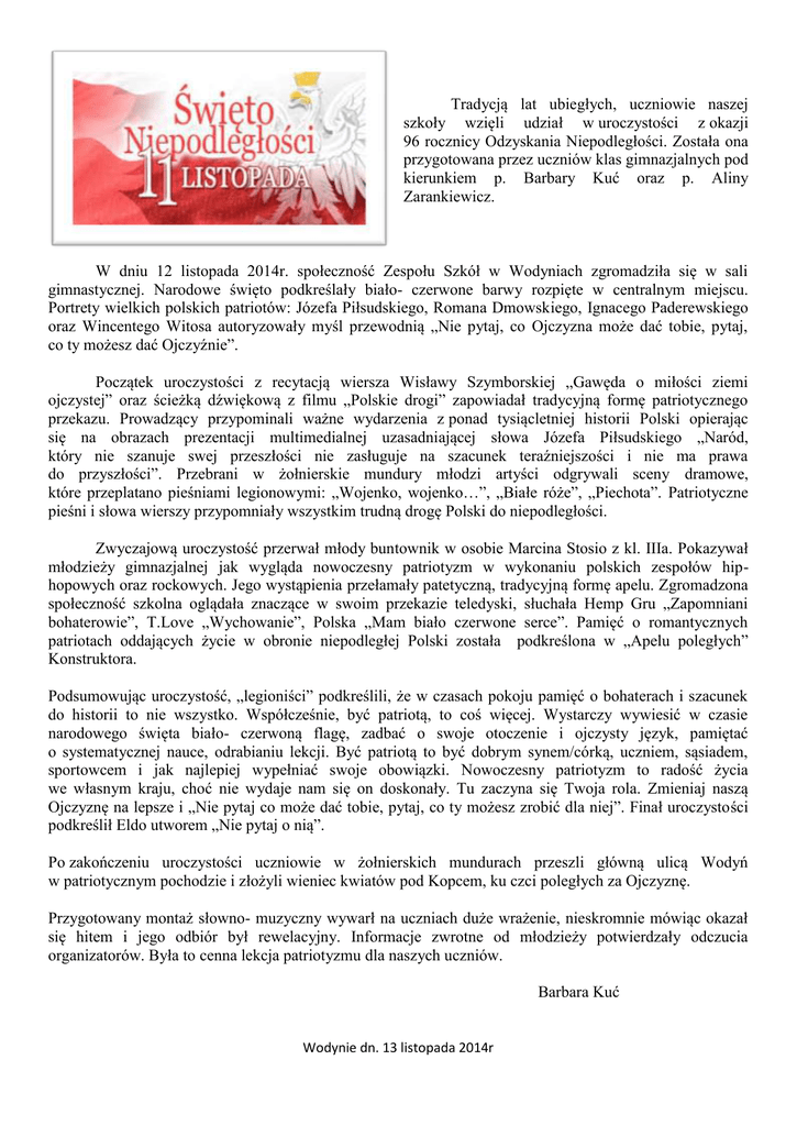 Tradycją lat ubiegłych, uczniowie naszej szkoły wzięli udział w uroczystości z okazji 96 rocznicy Odzyskania Niepodległości. Została ona przygotowana przez uczniów klas gimnazjalnych pod kierunkiem p. Barbary Kuć oraz p. Aliny Zarankiewicz. W dniu 12 listopada 2014r. społeczność Zespołu Szkół w Wodyniach zgromadziła się w sali gimnastycznej. Narodowe święto podkreślały biało- czerwone barwy rozpięte w centralnym miejscu. Portrety wielkich polskich patriotów: Józefa Piłsudskiego, Romana Dmowskiego, Ignacego Paderewskiego oraz Wincentego Witosa autoryzowały myśl przewodnią „Nie pytaj, co Ojczyzna może dać tobie, pytaj, co ty możesz dać Ojczyźnie”. Początek uroczystości z recytacją wiersza Wisławy Szymborskiej „Gawęda o miłości ziemi ojczystej” oraz ścieżką dźwiękową z filmu „Polskie drogi” zapowiadał tradycyjną formę patriotycznego przekazu. Prowadzący przypominali ważne wydarzenia z ponad tysiącletniej historii Polski opierając się na obrazach prezentacji multimedialnej uzasadniającej słowa Józefa Piłsudskiego „Naród, który nie szanuje swej przeszłości nie zasługuje na szacunek teraźniejszości i nie ma prawa do przyszłości”. Przebrani w żołnierskie mundury młodzi artyści odgrywali sceny dramowe, które przeplatano pieśniami legionowymi: „Wojenko, wojenko…”, „Białe róże”, „Piechota”. Patriotyczne pieśni i słowa wierszy przypomniały wszystkim trudną drogę Polski do niepodległości. Zwyczajową uroczystość przerwał młody buntownik w osobie Marcina Stosio z kl. IIIa. Pokazywał młodzieży gimnazjalnej jak wygląda nowoczesny patriotyzm w wykonaniu polskich zespołów hiphopowych oraz rockowych. Jego wystąpienia przełamały patetyczną, tradycyjną formę apelu. Zgromadzona społeczność szkolna oglądała znaczące w swoim przekazie teledyski, słuchała Hemp Gru „Zapomniani bohaterowie”, T.Love „Wychowanie”, Polska „Mam biało czerwone serce”. Pamięć o romantycznych patriotach oddających życie w obronie niepodległej Polski została podkreślona w „Apelu poległych” Konstruktora. Podsumowując uroczystość, „legioniści” podkreślili, że w czasach pokoju pamięć o bohaterach i szacunek do historii to nie wszystko. Współcześnie, być patriotą, to coś więcej. Wystarczy wywiesić w czasie narodowego święta biało- czerwoną flagę, zadbać o swoje otoczenie i ojczysty język, pamiętać o systematycznej nauce, odrabianiu lekcji. Być patriotą to być dobrym synem/córką, uczniem, sąsiadem, sportowcem i jak najlepiej wypełniać swoje obowiązki. Nowoczesny patriotyzm to radość życia we własnym kraju, choć nie wydaje nam się on doskonały. Tu zaczyna się Twoja rola. Zmieniaj naszą Ojczyznę na lepsze i „Nie pytaj co może dać tobie, pytaj, co ty możesz zrobić dla niej”. Finał uroczystości podkreślił Eldo utworem „Nie pytaj o nią”. Po zakończeniu uroczystości uczniowie w żołnierskich mundurach przeszli główną ulicą Wodyń w patriotycznym pochodzie i złożyli wieniec kwiatów pod Kopcem, ku czci poległych za Ojczyznę. Przygotowany montaż słowno- muzyczny wywarł na uczniach duże wrażenie, nieskromnie mówiąc okazał się hitem i jego odbiór był rewelacyjny. Informacje zwrotne od młodzieży potwierdzały odczucia organizatorów. Była to cenna lekcja patriotyzmu dla naszych uczniów. Barbara Kuć Wodynie dn. 13 listopada 2014r