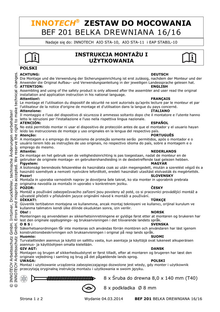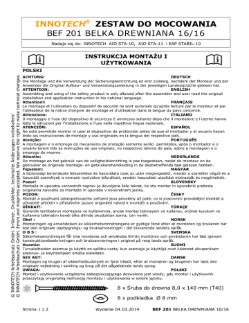 INNOTECH ZESTAW DO MOCOWANIA BEF 201 BELKA DREWNIANA 16/16 Nadaje się do: INNOTECH AIO STA-10, AIO STA-11 i EAP STABIL-10 INSTRUKCJA MONTAŻU I UŻYTKOWANIA © INNOTECH Arbeitsschutz GmbH. Irrtümer, Druckfehler, technische Änderungen vorbehalten! © INNOTECH Arbeitsschutz GmbH. Errors and misprints accepted. We reserve the right to make technical changes. POLSKI ACHTUNG: DEUTSCH Die Montage und die Verwendung der Sicherungseinrichtung ist erst zulässig, nachdem der Monteur und der Anwender die Original Aufbau– und Verwendungsanleitung in der jeweiligen Landessprache gelesen hat. ATTENTION: ENGLISH Assembling and using of the safety product is only allowed after the assembler and user read the original installation and application instruction in his national language. Attention!: FRANÇAIS Le montage et l’utilisation du dispositif de sécurité ne sont autorisés qu’après lecture par le monteur et par l’utilisateur de la notice d'origine de montage et d'utilisation dans la langue du pays concerné. Attenzione: ITALIANO Il montaggio e l’uso del dispositivo di sicurezza è ammesso soltanto dopo che il montatore e l’utente hanno letto le istruzioni per l'installazione e l'uso nella rispettiva lingua nazionale. ATENCIÓN: ESPAÑOL No está permitido montar ni usar el dispositivo de protección antes de que el montador y el usuario hayan leído las instrucciones de montaje y uso originales en la lengua del respectivo país. Atenção: PORTUGUÊS A montagem e o emprego do mecanismo de proteção somente serão permitidos, após o montador e o usuário terem lido as instruções de uso originais, no respectivo idioma do país, sobre a montagem e o emprego do mesmo. NEDERLANDS Attentie: De montage en het gebruik van de veiligheidsinrichting is pas toegestaan, nadat de monteur en de gebruiker de originele montage- en gebruikershandleiding in de desbetreffende taal gelezen hebben. Figyelem: MAGYAR A biztonsági berendezés felszerelése és használata csak az után megengedett, miután a szerelést végző és a használó személyek a nemzeti nyelvükre lefordított, eredeti használati utasítást elolvasták és megértették. Pozor! SLOVENSKY Montaža in uporaba varnostnih naprav je dovoljena šele takrat, ko sta monter in uporabnik prebrala originalna navodila za montažo in uporabo v konkretnem jeziku. POZOR: ČESKY Montáž a používání zabezpečovacího zařízení jsou povoleny až poté, co si pracovníci provádějící montáž a uživatelé přečetli v příslušném jazyce originální návod k montáži a používání. DİKKAT!: TÜRKÇE Güvenlik tertibatının montajına ve kullanımına, ancak montaj teknisyeni ve kullanıcı, orijinal kurulum ve kullanma talimatını kendi ülke dilinde okuduktan sonra, izin verilir. Obs! : NORSK Monteringen og anvendelsen av sikkerhetsinnretningene er gyldige først etter at montøren og brukeren har lest den originale oppbygnings- og bruksanvisningen i det tilsvarende landets språk. OBS: SVENSKA Säkerhetsanordningen får inte monteras och användas förrän montören och användaren har läst igenom konstruktionsbeskrivningen och bruksanvisningen i original på resp lands språk. Huomio: SUOMI Turvalaitteiden asennus ja käyttö on sallittu vasta, kun asentaja ja käyttäjä ovat lukeneet alkuperäisen asennus- ja käyttöohjeen omalla kielellään. GIV AGT: DANSK Montagen og brugen af sikkerhedsudstyret er først tilladt, efter at montøren og brugeren har læst den originale vejledning i samling og brug på det pågældende lands sprog. UWAGA: POLSKI Montaż i użytkowanie urządzenia zabezpieczającego dozwolone jest wtedy, gdy monter i użytkownik przeczytają oryginalną instrukcję montażu i użytkowania w swoim języku. 8 x Śruba do drewna 8,0 x 140 mm (T40) 8 x podkładka Ø 8 mm Strona 1 z 2 Wydanie 04.03.2014 BEF 201 BELKA DREWNIANA 16/16 INNOTECH ZESTAW DO MOCOWANIA BEF 201 BELKA DREWNIANA 16/16 PODŁOŻE: DREWNO = Zestaw do mocowania 201 dla INNOTECH STABIL-10, STA-10, STA-11 Jakość drewna - drewno konstrukcyjne, do mocowania używa się 8 szt. śrub do drewna 8,0 x 140 mm UWAGA Śruby do drewna mocować tylko w drewnie konstrukcyjnym! [mm] ≥ 100 ≥ 160 T40 ≥ 160 DEVELOPMENT INNOTECH Arbeitsschutz GmbH A-4656 Kirchham, Laizing 10 www.innotech - safety.eu Strona 2 z 2 Wydanie 04.03.2014 BEF 201 BELKA DREWNIANA 16/16