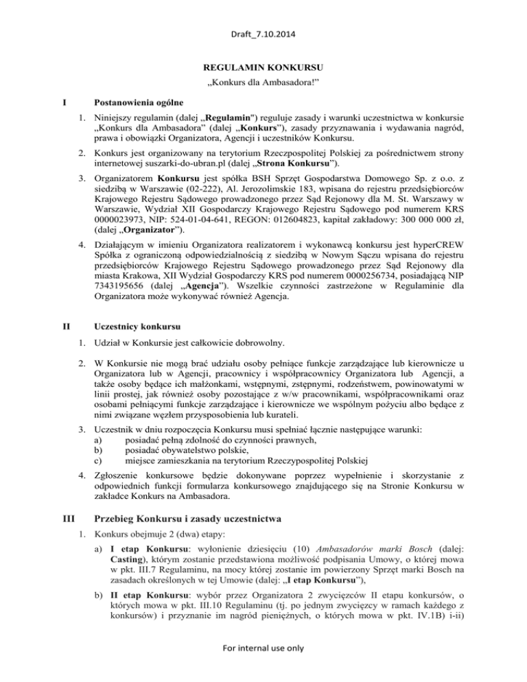 Draft_7.10.2014 REGULAMIN KONKURSU „Konkurs dla Ambasadora!” I Postanowienia ogólne 1. Niniejszy regulamin (dalej „Regulamin") reguluje zasady i warunki uczestnictwa w konkursie „Konkurs dla Ambasadora” (dalej „Konkurs”), zasady przyznawania i wydawania nagród, prawa i obowiązki Organizatora, Agencji i uczestników Konkursu. 2. Konkurs jest organizowany na terytorium Rzeczpospolitej Polskiej za pośrednictwem strony internetowej suszarki-do-ubran.pl (dalej „Strona Konkursu”). 3. Organizatorem Konkursu jest spółka BSH Sprzęt Gospodarstwa Domowego Sp. z o.o. z siedzibą w Warszawie (02-222), Al. Jerozolimskie 183, wpisana do rejestru przedsiębiorców Krajowego Rejestru Sądowego prowadzonego przez Sąd Rejonowy dla M. St. Warszawy w Warszawie, Wydział XII Gospodarczy Krajowego Rejestru Sądowego pod numerem KRS 0000023973, NIP: 524-01-04-641, REGON: 012604823, kapitał zakładowy: 300 000 000 zł, (dalej „Organizator”). 4. Działającym w imieniu Organizatora realizatorem i wykonawcą konkursu jest hyperCREW Spółka z ograniczoną odpowiedzialnością z siedzibą w Nowym Sączu wpisana do rejestru przedsiębiorców Krajowego Rejestru Sądowego prowadzonego przez Sąd Rejonowy dla miasta Krakowa, XII Wydział Gospodarczy KRS pod numerem 0000256734, posiadającą NIP 7343195656 (dalej „Agencja”). Wszelkie czynności zastrzeżone w Regulaminie dla Organizatora może wykonywać również Agencja. II Uczestnicy konkursu 1. Udział w Konkursie jest całkowicie dobrowolny. 2. W Konkursie nie mogą brać udziału osoby pełniące funkcje zarządzające lub kierownicze u Organizatora lub w Agencji, pracownicy i współpracownicy Organizatora lub Agencji, a także osoby będące ich małżonkami, wstępnymi, zstępnymi, rodzeństwem, powinowatymi w linii prostej, jak również osoby pozostające z w/w pracownikami, współpracownikami oraz osobami pełniącymi funkcje zarządzające i kierownicze we wspólnym pożyciu albo będące z nimi związane węzłem przysposobienia lub kurateli. 3. Uczestnik w dniu rozpoczęcia Konkursu musi spełniać łącznie następujące warunki: a) posiadać pełną zdolność do czynności prawnych, b) posiadać obywatelstwo polskie, c) miejsce zamieszkania na terytorium Rzeczypospolitej Polskiej 4. Zgłoszenie konkursowe będzie dokonywane poprzez wypełnienie i skorzystanie z odpowiednich funkcji formularza konkursowego znajdującego się na Stronie Konkursu w zakładce Konkurs na Ambasadora. III Przebieg Konkursu i zasady uczestnictwa 1. Konkurs obejmuje 2 (dwa) etapy: a) I etap Konkursu: wyłonienie dziesięciu (10) Ambasadorów marki Bosch (dalej: Casting), którym zostanie przedstawiona możliwość podpisania Umowy, o której mowa w pkt. III.7 Regulaminu, na mocy której zostanie im powierzony Sprzęt marki Bosch na zasadach określonych w tej Umowie (dalej: „I etap Konkursu”), b) II etap Konkursu: wybór przez Organizatora 2 zwycięzców II etapu konkursów, o których mowa w pkt. III.10 Regulaminu (tj. po jednym zwycięzcy w ramach każdego z konkursów) i przyznanie im nagród pieniężnych, o których mowa w pkt. IV.1B) i-ii) For internal use only Draft_7.10.2014 Regulaminu; w II etapie Konkursu mogą wziąć udział wyłącznie Ambasadorowie marki Bosch wyłonieni w I etapie Konkursu, którzy podpisali Umowę, o której mowa w pkt. III.7 Regulaminu oraz wykonali Materiał promocyjny, zgodnie z postanowieniami tej Umowy i Regulaminu (dalej „II etap Konkursu”),. 2. Casting na Ambasadorów marki Bosch zostanie przeprowadzony w dniach 08.10.2014 r. do 03.11.2014 r. (dalej: „Dzień castingu”) spośród osób, które zarejestrowały się na Stronie Konkursu i odpowiedziały na 1 (jedno) otwarte pytanie konkursowe: „Dlaczego to właśnie ja powinienem zostać Ambasadorem marki Bosch?” (dalej „Zadanie konkursowe”). 3. Odpowiedź na pytanie konkursowe, o którym mowa w pkt. III. 2 Regulaminu może zostać udzielona w formie pisemnej lub w inny sposób, o ile dana forma jest odpowiednia do udzielania odpowiedzi na pytanie konkursowe, a odpowiedź w swojej treści jest związana z pytaniem konkursowym. W szczególności odpowiedź na pytanie otwarte może być udzielona przy wykorzystaniu technik graficznych, plastycznych, fotograficznych lub audiowizualnych. 4. Organizator będzie dokonywał oceny zamieszczonych przez uczestników konkursowych odpowiedzi na pytanie konkursowe w oparciu o kryterium kreatywności. 5. W trakcie Konkursu zakazuje się używania słów lub gestów powszechnie uznanych za niedozwolone, w tym wulgaryzmów lub określeń mogących powodować obrazę uczuć religijnych lub światopoglądowych, oraz wskazujących na dyskryminację (np. ras, orientacja seksualna), jak również zachowań naruszających dobre obyczaje, uczucia osób trzecich lub prawa zwierząt. 6. Wyniki Castingu zostaną ogłoszone do 07.11.2014 r. na Stronie Konkursowej jak również przesyłane na adres e-mail zwycięzców Castingu wskazany przez uczestnika konkursu w zgłoszeniu konkursowym. 7. Ambasador marki Bosch otrzyma na adres korespondencyjny wskazany w zgłoszeniu konkursowym w terminie do 07.11.2014 propozycję podpisania Umowy o dzieło (dalej „Umowa”), której wzór stanowi załącznik nr 1 do Regulaminu. Ambasador marki Bosch, w celu wzięcia udziału w II etapie Konkursu jest zobowiązany do podpisania Umowy i przesłania jej listem poleconym na adres Realizatora tj. [ul. Skarbowców 23a, 53-025 Wrocław] w terminie 7 dni roboczych od dnia otrzymania Umowy. Po podpisaniu Umowy Ambasador marki Bosch otrzyma do dnia 20.11.2014 r. suszarkę do ubrań marki Bosch celem jej przetestowania na zasadach określonych w Umowie (dalej „Sprzęt”). Ambasador marki Bosch zobowiązany jest do stworzenia, w terminie do 01.12.2014 i na warunkach określonych Umową, co najmniej 1 (jednego) materiału audiowizualnego ukazującego korzyści jakie wiążą się z użytkowaniem Sprzętu (dalej: „Materiał promocyjny