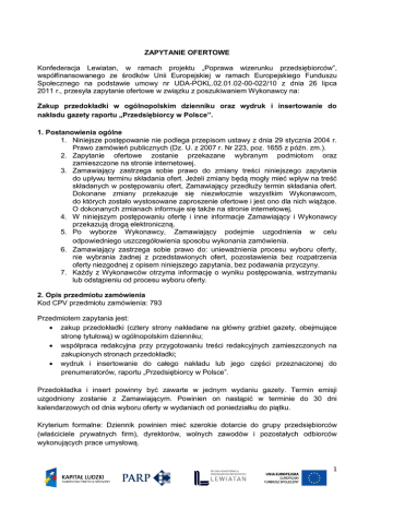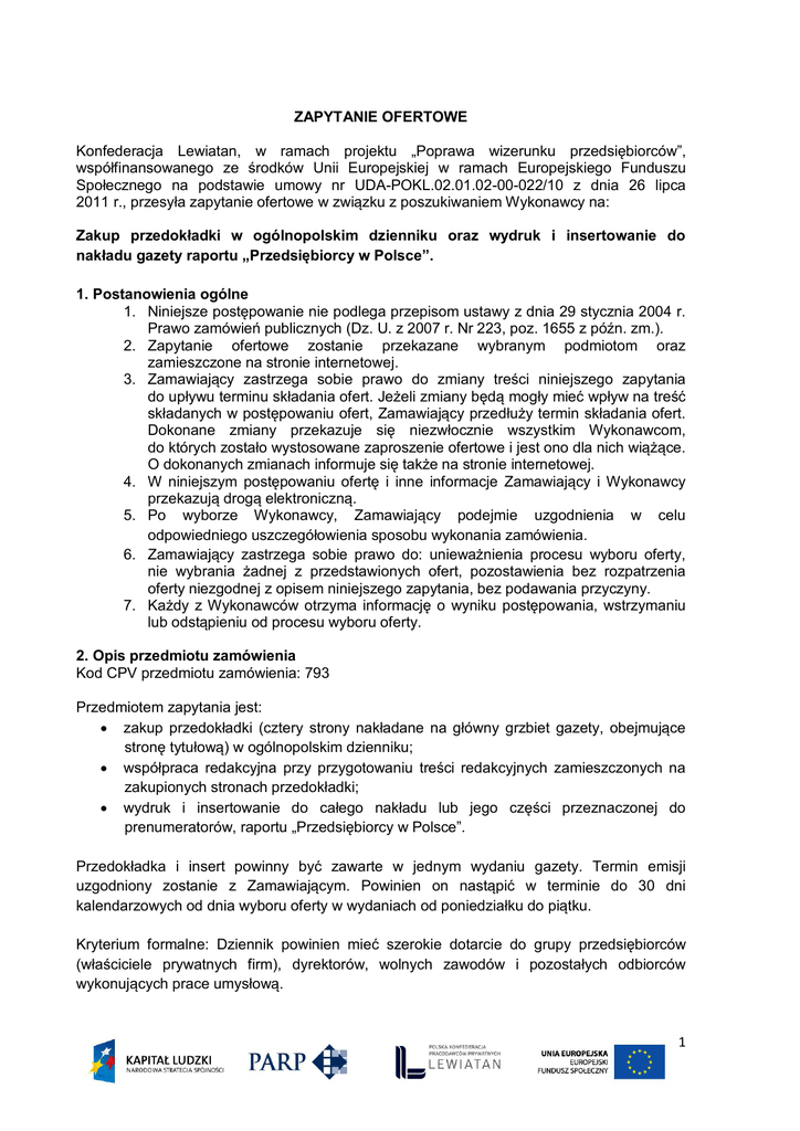 ZAPYTANIE OFERTOWE Konfederacja Lewiatan, w ramach projektu „Poprawa wizerunku przedsiębiorców”, współfinansowanego ze środków Unii Europejskiej w ramach Europejskiego Funduszu Społecznego na podstawie umowy nr UDA-POKL.02.01.02-00-022/10 z dnia 26 lipca 2011 r., przesyła zapytanie ofertowe w związku z poszukiwaniem Wykonawcy na: Zakup przedokładki w ogólnopolskim dzienniku oraz wydruk i insertowanie do nakładu gazety raportu „Przedsiębiorcy w Polsce”. 1. Postanowienia ogólne 1. Niniejsze postępowanie nie podlega przepisom ustawy z dnia 29 stycznia 2004 r. Prawo zamówień publicznych (Dz. U. z 2007 r. Nr 223, poz. 1655 z późn. zm.). 2. Zapytanie ofertowe zostanie przekazane wybranym podmiotom oraz zamieszczone na stronie internetowej. 3. Zamawiający zastrzega sobie prawo do zmiany treści niniejszego zapytania do upływu terminu składania ofert. Jeżeli zmiany będą mogły mieć wpływ na treść składanych w postępowaniu ofert, Zamawiający przedłuży termin składania ofert. Dokonane zmiany przekazuje się niezwłocznie wszystkim Wykonawcom, do których zostało wystosowane zaproszenie ofertowe i jest ono dla nich wiążące. O dokonanych zmianach informuje się także na stronie internetowej. 4. W niniejszym postępowaniu ofertę i inne informacje Zamawiający i Wykonawcy przekazują drogą elektroniczną. 5. Po wyborze Wykonawcy, Zamawiający podejmie uzgodnienia w celu odpowiedniego uszczegółowienia sposobu wykonania zamówienia. 6. Zamawiający zastrzega sobie prawo do: unieważnienia procesu wyboru oferty, nie wybrania żadnej z przedstawionych ofert, pozostawienia bez rozpatrzenia oferty niezgodnej z opisem niniejszego zapytania, bez podawania przyczyny. 7. Każdy z Wykonawców otrzyma informację o wyniku postępowania, wstrzymaniu lub odstąpieniu od procesu wyboru oferty. 2. Opis przedmiotu zamówienia Kod CPV przedmiotu zamówienia: 793 Przedmiotem zapytania jest: zakup przedokładki (cztery strony nakładane na główny grzbiet gazety, obejmujące stronę tytułową) w ogólnopolskim dzienniku; współpraca redakcyjna przy przygotowaniu treści redakcyjnych zamieszczonych na zakupionych stronach przedokładki; wydruk i insertowanie do całego nakładu lub jego części przeznaczonej do prenumeratorów, raportu „Przedsiębiorcy w Polsce”. Przedokładka i insert powinny być zawarte w jednym wydaniu gazety. Termin emisji uzgodniony zostanie z Zamawiającym. Powinien on nastąpić w terminie do 30 dni kalendarzowych od dnia wyboru oferty w wydaniach od poniedziałku do piątku. Kryterium formalne: Dziennik powinien mieć szerokie dotarcie do grupy przedsiębiorców (właściciele prywatnych firm), dyrektorów, wolnych zawodów i pozostałych odbiorców wykonujących prace umysłową. 1 Udokumentowany udział ww. grupy (wg badania PBC, w kategorii ‘status społecznozawodowy’, pozycje: ‘dyrektorzy i wolne zawody’ + ‘pozostali umysłowi’ + ‘właściciele prywatnych firm’) – min. 60% czytelników. Wymagana jest część redakcyjna dedykowana kwestiom ekonomiczno finansowym (gospodarczym) lub dziennik w całości poświęcony tej problematyce. Oferty nie spełniające tego kryterium nie będą rozpatrywane. Insertem będzie raport „Przedsiębiorcy w Polsce” odpowiadający następującej specyfikacji: format 200x260, okładka kreda folia matt 300g, środek kreda 130 g, kolor 4+4, lakier 1+1, objętość 4+44, oprawa szyto-klejona. W przypadku dołączenia wydawnictwa do grupy prenumeratorów wymagana liczba prenumeratorów to min. 10 tysięcy odbiorców. 3. Składanie ofert. a) oferty należy składać do 18 czerwca 2013 r. do godz. 24:00 b) oferty należy złożyć w wersji elektronicznej na adres [email protected], zatytułowane: „Oferta na okładkę i insert”. c) Oferty otrzymane po terminie nie będą rozpatrywane. e-mail: 4. Oferta Oferta powinna zawierać: 1. Dane Wykonawcy: nazwa, adres, numer NIP, osobę upoważnioną do reprezentacji. 2. Datę sporządzenia i datę ważności oferty (min. 45 dni). 3. Udokumentowany minimalny udział grupy docelowej w segmencie: właściciele prywatnych firm, dyrektorzy, wolne zawody i pozostali odbiorcy wykonujący pracę umysłową – 60% czytelników. 4. Wersja elektroniczna przykładowego, codziennego wydania gazety - wymagana jest część redakcyjna dedykowana kwestiom ekonomiczno finansowym (gospodarczym) lub dziennik w całości poświęcony tej problematyce. 5. Cenę brutto końcową dla całego zamówienia obejmującą: wykupienie przedokładki (4 strony), współpracę redakcyjną, druk raportu (do całego nakładu lub prenumeratorów – dopuszczalne są dwie wyceny wariantowe), insertowanie raportu. 6. Oświadczenie o braku powiązań. 5. Kryteria wyboru Wykonawcy Cena – 100%. 6. Istotne informacje dotyczące przebiegu postępowania. 1. Termin ważności ofert składanych w ramach zapytania ofertowego powinien wynosić co najmniej 45 dni, licząc od dnia złożenia oferty. 2. W toku dokonywania oceny złożonych ofert Zamawiający może żądać udzielenia przez Wykonawców wyjaśnień dotyczących treści złożonych przez nich ofert. 2 3. Zaproszenie do negocjacji nie oznacza przyjęcia przez Zamawianego oferty Wykonawcy. 4. Zamawiający nie ponosi żadnej odpowiedzialności ani jakichkolwiek kosztów związanych z przygotowaniem oferty przez Wykonawcę, a w szczególności związanych z przystąpieniem do procesu ofertowego, przygotowaniem i złożeniem oferty, negocjacji, przygotowaniami do zawarcia umowy. 5. Zamawiający nie jest zobowiązany do uzasadnienia swojej decyzji w przypadku odrzucenia oferty. 7. Wymagania związane ze współfinansowaniem Wykonanie zamówienia musi spełnić wymogi projektu realizowanego ze środków Unii Europejskiej w ramach Programu Operacyjnego Kapitał Ludzki. Wykonawca składając ofertę wyraża zgodę na zamieszczenie w umowie zapisów wymaganych w związku z realizacją projektu oraz stosowania zasad realizacji zamówień 