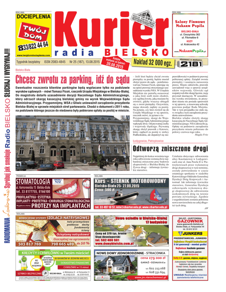 reklama Spróbuj jak smakuje Radio BIELSKO Słuchaj i wygrywaj!!! reklama Tygodnik bezpłatny ISSN 2083-4845 Nr 25 (187), 13.08.2015 Bielsko-Biała K wydan olejne ie z a t yd 20.08 zień: .2015 Chcesz zwrotu za parking, idź do sądu Ewentualne roszczenia klientów parkingów będą wypłacane tylko na podstawie wyroków sądowych – mówi Tomasz Ficoń, rzecznik Urzędu Miejskiego w Bielsku-Białej. Do magistratu dotarło uzasadnienie decyzji Naczelnego Sądu Administracyjnego, który odrzucił skargę kasacyjną bielskiej gminy na wyrok Wojewódzkiego Sądu Administracyjnego. Przypomnijmy, WSA z Gliwic unieważnił zarządzenie prezydenta Bielska-Białej w sprawie miejskich stref parkowania. Chodzi o dokument z 2011 roku, na podstawie którego jeszcze do niedawna były pobierane opłaty za postój w mieście. – Jeśli ktoś będzie chciał zwrotu pieniędzy za postój, będzie musiał złożyć pozew do sądu – poinformował nas Tomasz Ficoń, opierając się na opinii prawnej otrzymanego uzasadnienia wyroku NSA. W Urzędzie Miejskim nie potrafią oszacować o jaką ilość osób może chodzić, czy ogólnej kwoty, jaką musiano by zwrócić, gdyby wszyscy ubiegali się o zwrot pieniędzy. Oczywiście, mając dowody zapłaty za postój. Na pytanie, czy ktoś zwrócił się do Urzędu Miejskiego w tej sprawie, rzecznik mówi, że pytano o to. Przypomnijmy, skargi do Wojewódzkiego Sądu Administracyjnego wpłynęły dwie. Od prywatnej osoby i wojewody śląskiego. Prywatną skargę złożył prawnik z Katowic, który zapłacił za postój w stolicy Podbeskidzia, ale dopatrzył się nie- prawidłowości w podstawie prawnej pobieranej opłaty. Zażądał zwrotu pieniędzy i usunięcia naruszenia prawa. Miasto odmówiło, prawnik zawiadomił więc o sprawie urzędników wojewody. Gliwicki sąd rozpatrywał obie skargi łącznie, rację przyznał skarżącym. W uzasadnieniu wyroku stwierdzono, że prezydent miasta nie posiada uprawnień w tej sprawie, a stosowaną uchwałę powinna podjąć Rada Miejska. Tak w tym przypadku nie stało się, w związku z tym zarządzenie prezydenta unieważniono. Bielskie władze złożyły skargę kasacyjną do Naczelnego Sądu Administracyjnego. NSA odrzuciło ją. Opłaty na podstawie zarządzenia prezydenta miasta pobierano do połowy czerwca tego roku. Magda Fritz Łodygowice, Pietrzykowice Odtworzą zniszczone drogi Najpóźniej do końca września tego roku odtworzone zostaną dwie najbardziej zniszczone przy budowie ekspresówki z Bielska-Białej do Żywca drogi – informuje żywieckie starostwo. PROMOCJA reklama Ustalenia dotyczące odtworzenia ulicy Kasztanowej w Łodygowicach oraz ul. Jana Pawła II w Pietrzykowicach przez wykonawcę drogi ekspresowej w tym terminie, zostały potwierdzone w czasie ostatniego spotkania w siedzibie Katowickiego Oddziału Generalnej Dyrekcji Dróg Krajowych i Autostrad. Jak informuje żywieckie starostwo, Generalna Dyrekcja zobowiązała wykonawcę drogi ekspresowej do odtworzenia uszkodzonych dróg na terenie powiatu żywieckiego. Zgodnie z uzgodnieniami zostanie położona nowa nawierzchnia na całej długości tych dróg. AW Radiomania reklama NOWOCZESNE SYSTEMY IZOLACJI NATRYSKOWEJ > hale przemysłowe > poddasza > dachy > fundamenty > ściany Ocieplamy natryskowo! 503 817 769 Oszczędzaj na ogrzewaniu 798 665 489 do 50 % Nowe osiedle w Bielsku-Białej 17 budynków Ceny od 379 tys. brutto Stan developerski SKLEP - HURTOWNIA GAZOWNIK www.gazownik.bielsko.pl Bielsko-Biała, ul. Partyzantów 44 tel. 33 812 32 01 PRZEDSTAWICIEL JUNKERS tel. 502 488 981 www.domybielsko.com.pl Najtańsze Piecyki Łazienkowe! 5 lat gwarancji - montaż gratis! Najtańsze kuchnie gazowe NOWE DOMY JEDNORODZINNE - STRACONKA cena 279 000 zł GARAŻ • DZIAŁKA 6 a tel. 602 tel. 608 213 068 331 694 www.jm.nieruchomosci.pl Bojlery elektryczne, gazowe ze stali nierdzewnej Kotły C.O. gazowe, olejowe, węglowe Autoryzowany Przedstawiciel Junkersa Najtańsze raty bez żyrantów Montaż-Serwis, Bezpłatny transport Skupujemy stare piece gazowe łazienkowe UWAGA! Realizujemy również zamówienia telefoniczne 2 Kurier radia BIELSKO O TYM SIĘ MÓWI Bielsko-Biała Odszedł Marian Koim 30 lipca zmarł Marian Koim, bielski filmowiec i fotografik. Artysta miał 83 lata. Był nestorem fotografii i filmu krótkometrażowego. Wychował kilka pokoleń amatorów filmu i fotografii. Trzykrotnie otrzymał z rąk Ministra Kultury i Sztuki odznaczenie Zasłużony Działacz Kultury, a w 2012 roku brązowy medal Zasłużony Kulturze Gloria Artis. Spoczął na cmentarzu komunalnym w bielskiej Kamienicy. FRI Bielsko-Biała Czy Mezo obroni tytuł sprzed roku? Od środy w Jaworzu trwa jubileuszowy 10. Beskid Cup, czyli Turniej Tenisa Ziemnego Artystów Polskich pod patronatem marszałka województwa śląskiego, o puchar prezydenta Bielska-Białej. Niezwykłe emocje na kortach hotelu SPA Jawor potrwają do soboty, a rywalizować będzie prawie dwudziestka znanych i lubianych artystów. W roku ubiegłym zwycięzcą turnieju był Jacek Mejer Mezo, przed Marcinem Dańcem i Krzysztofem Respondkiem. Tym razem jego główni konkurenci zamierzają odebrać mu palmę pierwszeństwa. Czy się uda, warto przekonać się osobiście. Wstęp na korty jest darmowy, a zabawa podczas imprezy zawsze jest znakomita. Gwiazdy na kortach mają pojawiać się codziennie o godz. 8.00. W tym roku w Jaworzu zagrają: Stan Borys, Marcin Daniec, Wojciech Dąbrowski, Władysław Grzywna, Jan Englert, Stefan Friedmann, Zbigniew Górny, Krzysztof Hanke, Robert Janowski, Leszek Malinowski, Jacek Mejer Mezo, Maurycy Polaski, Oddali hołd bohaterowi Podniosła uroczystość odbyła się na cmentarzu rzymsko-katolickim w Białej. Uczczono pamięć pułkownika Józefa Kossarka, uczestnika I wojny światowej, walk o Śląsk Cieszyński, a potem II wojny światowej, oraz poświecono odrestaurowany nagrobek. Dowódca polskich żołnierzy pochodzi z okolic Lwowa, zmarł w 1957 r. Przez lata nikt nie