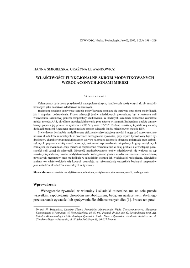 ŻYWNOŚĆ. Nauka. Technologia. Jakość, 2007, 6 (55), 198 – 209 HANNA ŚMIGIELSKA, GRAŻYNA LEWANDOWICZ WŁAŚCIWOŚCI FUNKCJONALNE SKROBI MODYFIKOWANYCH WZBOGACONYCH JONAMI MIEDZI Streszczenie Celem pracy była ocena przydatności najpopularniejszych, handlowych spożywczych skrobi modyfikowanych jako nośników składników mineralnych. Badaniom poddano spożywcze skrobie modyfikowane różniące się zarówno sposobem modyfikacji, jak i stopniem podstawienia. Proces adsorpcji jonów miedziowych prowadzony był z roztworu soli w zawiesinie skrobiowej poniżej temperatury kleikowania. W badanych skrobiach oznaczano zawartość miedzi metodą AAS, określano przebieg kleikowania przy użyciu wiskografu Brabendera, a także zmiany barwy poprzez jej pomiar w systemach CIE Yxy oraz L*a*b*. Badano strukturę krystaliczną metodą dyfrakcji promieni Roentgena oraz określano sposób wiązania jonów miedziowych metodą EPR. Stwierdzono, że skrobie modyfikowane efektywnie adsorbują jony miedzi i mogą być stosowane jako nośniki składników mineralnych w procesach wzbogacania żywności, przy czym: hydrofilowy bądź hydrofobowy charakter grup modyfikujących wpływa na proces adsorpcji; obecność polarnych grup karboksylowych poprawia efektywność adsorpcji, natomiast wprowadzenie niepolarnych grup acetylowych zmniejsza jej wydajność. Jony miedzi są rozproszone równomiernie w całej próbie i nie występują pozostałości soli użytej do adsorpcji. Obecność zaadsorbowanych jonów miedziowych nie wpływa na typ struktury krystalicznej skrobi modyfikowanych. Wzbogacanie jonami miedzi nieznacznie zmienia barwę powstałych preparatów oraz modyfikuje w niewielkim stopniu ich właściwości reologiczne. Niewielkie zmiany we właściwościach użytkowych pozwalają na rekomendację wszystkich badanych preparatów jako nośników składników mineralnych w żywności. Słowa kluczowe: skrobia: modyfikowana, utleniona, acetylowana, sieciowana; miedź, wzbogacanie Wprowadzenie Wzbogacanie żywności, w witaminy i składniki mineralne, ma na celu przede wszystkim zapobieganie chorobom metabolicznym, będącym następstwem zbytniego przetwarzania żywności lub spożywania źle zbilansowanych diet [1]. Proces ten powiDr inż. H. Śmigielska, Katedra Chemii Produktów Naturalnych, Wydz. Towaroznawstwa, Akademia Ekonomiczna w Poznaniu, Al. Niepodległości 10, 60-967 Poznań, dr hab. inż. G. Lewandowicz prof. AR, Katedra Biotechnologii i Mikrobiologii Żywności, Wydz. Nauk o Żywności, Akademia Rolnicza im. A. Cieszkowskiego w Poznaniu, ul. Wojska Polskiego 48, 60-627 Poznań WŁAŚCIWOŚCI FUNKCJONALNE SKROBI MODYFIKOWANYCH WZBOGACONYCH JONAMI MIEDZI 199 nien zapewniać nie tylko wprowadzenie do produktów spożywczych substancji wzbogacających we właściwej formie i dawce, ale również umożliwiać równomierne ich rozprowadzenie. Można to osiągnąć np. poprzez zastosowanie odpowiednich nośników, tj. substancji łatwo dostępnych, wykorzystywanych w wytwarzaniu wielu produktów spożywczych, jak również niezmieniających ich jakości i smaku. Takim nośnikiem może być skrobia modyfikowana. Skrobie utlenione, używane do produkcji deserów, otrzymały pozytywną ocenę towaroznawczą jako nośniki soli miedzi i żelaza [10, 11], natomiast skrobie acetylowane, a także sieciowane są przedmiotem naszych dalszych badań nad procesem fortyfikacji. W badaniach zastosowano skrobie modyfikowane chemicznie, przeznaczone do produkcji deserów w proszku, budyni, galaretek, a także majonezów, sosów i kremów o zmniejszonej zawartości tłuszczu. Wzbogacone produkty tego typu po pozytywnej ocenie towaroznawczej mogłyby nosić miano żywności prozdrowotnej. Skrobie modyfikowane chemicznie, a następnie wzbogacane w składniki mineralne, mogą jednak wykazywać inne właściwości funkcjonalne niż preparaty wyjściowe, zatem celem badań było określenie tych zmian. Realizując ten cel zbadano: przebieg kleikowania wzbogaconej skrobi, jej krystaliczność, barwę powstałych preparatów, a także równomierność rozłożenia mikroelementu w produkcie. Materiał i metody badań Do badań użyto skrobi produkowanych przez Wielkopolskie Przedsiębiorstwo Przemysłu Ziemniaczanego S.A. w Luboniu. Były to skrobie modyfikowane poprzez utlenienie o różnych stopniach podstawienia: ‘Skrobia budyniowa’ (E 1403) i ‘Skrobia żelująca’ (E 1404), jak również skrobie modyfikowane metodą estryfikacji: fosforan diskrobiowy ‘Luboterm’ (E 1412), skrobia acetylowana ‘Zagęstnik AC’ (E 1420) oraz acetylowany adypinian diskrobiowy ‘Zagęstnik AD’ (E 1422). Naturalna skrobia ziemniaczana ‘Superior Standard’ stanowiła materiał odniesienia. Adsorpcję miedzi prowadzono z wodnych roztworów siarczanu(VI) miedzi(II) w zawiesinie skrobiowej w temp. 50ºC, czyli poniżej temperatury kleikowania. Do naważki zawierającej 2 g s.s. produktu skrobiowego dodawano kolejno 0,5; 2,5 oraz 5 cm3 wodnego roztworu siarczanu miedzi o stężeniu 1 mg Cu/cm3, uzupełniano do 20 cm3 roztworu, próby mieszano w łaźni wodnej o temp 50ºC w ciągu 1 godz., próby odwirowywano i dekantowano, a następnie powstały produkt suszono na powietrzu i kierowano do dalszych badań. Poziom adsorpcji miedzi w preparatach skrobiowych analizowano za pomocą spektrometru absorpcji atomowej Varian 800, metodą absorpcji płomieniowej przy długości fali λ= 324,8 nm. Przed pomiarem próby mineralizowano metodą mokrą, za pomocą stężonego HNO3, w piecu mikrofalowym CEM 2000. Próby wykonywano w trzech powtórzeniach. 200 Hanna Śmigielska, Grażyna Lewandowicz Przebieg kleikowania badanych preparatów skrobiowych wyznaczano za pomocą aparatu Brabendera z zastosowaniem następujących warunków pomiarowych: puszka pomiarowa 0,07 Nm; ogrzewanie w zakresie 25–92,5ºC z prędkością 1,5º/min; termostatowanie w temp. 92,5ºC – 20 min.; chłodzenie w zakresie 92,5–25ºC z prędkością 1,5°/min.