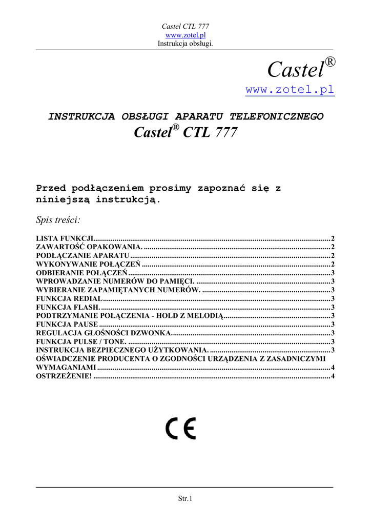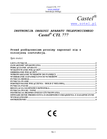 Castel CTL 777 www.zotel.pl Instrukcja obsługi. Castel ® www.zotel.pl INSTRUKCJA OBSŁUGI APARATU TELEFONICZNEGO Castel® CTL 777 Przed podłączeniem prosimy zapoznać się z niniejszą instrukcją. Spis treści: LISTA FUNKCJI..........................................................................................................................2 ZAWARTOŚĆ OPAKOWANIA. ................................................................................................2 PODŁĄCZANIE APARATU .......................................................................................................2 WYKONYWANIE POŁĄCZEŃ .................................................................................................2 ODBIERANIE POŁĄCZEŃ ........................................................................................................3 WPROWADZANIE NUMERÓW DO PAMIĘCI. .....................................................................3 WYBIERANIE ZAPAMIĘTANYCH NUMERÓW. ..................................................................3 FUNKCJA REDIAL.....................................................................................................................3 FUNKCJA FLASH. ......................................................................................................................3 PODTRZYMANIE POŁĄCZENIA - HOLD Z MELODIĄ.......................................................3 FUNKCJA PAUSE .......................................................................................................................3 REGULACJA GŁOŚNOŚCI DZWONKA..................................................................................3 FUNKCJA PULSE / TONE. ........................................................................................................3 INSTRUKCJA BEZPIECZNEGO UŻYTKOWANIA. ..............................................................3 OŚWIADCZENIE PRODUCENTA O ZGODNOŚCI URZĄDZENIA Z ZASADNICZYMI WYMAGANIAMI ........................................................................................................................4 OSTRZEŻENIE! ..........................................................................................................................4 Str.1 Castel CTL 777 www.zotel.pl Instrukcja obsługi. Dziękujemy za zakup aparatu telefonicznego CASTEL CTL 777. Lista funkcji. Aparat ten posiada następujące funkcje Trzy pamięci szybkiego wybierania. HOLD z melodią. Podświetlana klawiatura. Optyczna sygnalizacja dzwonka. Regulacja głośności dzwonka. Powtarzanie ostatniego numeru (REDIAL). Przerwa kalibrowana FLASH. Przełącznik trybu wybierania TONE/PULSE. Przerwa PAUSE. Możliwość montażu na ścianie Możliwość podłączenia modemu internetowego przez DATA PORT. Zawartość opakowania. Baza z klawiaturą. 1szt Słuchawka. 1szt Przewód słuchawkowy. 1szt Przewód liniowy. 1szt Instrukcja obsługi. 1szt Karta gwarancyjna 1szt Podłączanie aparatu Przewód linii telefonicznej należy podłączyć do gniazda w obudowie aparatu. Przewód słuchawkowy podłączyć do gniazda w dolnej części słuchawki oraz do gniazda z lewej strony obudowy aparatu. Uwaga - nigdy nie instaluj aparatu telefonicznego podczas burzy. nie dotykaj odsłoniętych, niezabezpieczonych przewodów telefonicznych, kiedy aparat jest podłączony do linii. Wykonywanie połączeń Podnieść słuchawkę (zaświeci się dioda IN-USE )po usłyszeniu sygnału wybrać numer za pomocą klawiatury numerycznej. Aby zakończyć rozmowę odłożyć słuchawkę na widełki ( zgaśnie dioda z napisem IN –USE) Str.2 Castel CTL 777 www.zotel.pl Instrukcja obsługi. Odbieranie połączeń Po usłyszeniu dzwonka lub zobaczeniu sygnału optycznego podnieść słuchawkę . Aby zakończyć rozmowę odłożyć słuchawkę na widełki / zgaśnie dioda z napisem IN –USE Wprowadzanie numerów do pamięci. Podnieś słuchawkę i naciśnij STORE. Wybierz numer, który chcesz zapamiętać a następnie naciśnij jeden z przycisków M1,M2,M3, pod którym chcesz zapamiętać numer Wybieranie zapamiętanych numerów. Podnieś słuchawkę a następnie naciśnij odpowiedni przycisk pamięci M1, M2 , M3 UWAGA! PO DŁUŻSZYM ODŁĄCZENIU APARATU OD SIECI TELEFONICZNEJ LUB BRAKU ZASILANIA W SIECI ZAPAMIĘTANE NUMERY ZOSTANĄ UTRACONE. Funkcja REDIAL Funkcja ta służy do automatycznego wybrania ostatnio wybieranego numeru. Aby wybrać ostatnio wybierany numer podnieś słuchawkę i naciśnij przycisk REDIAL Funkcja FLASH. Przycisk Flash służy do wprowadzania w pętli abonenckiej czasowej przerwy kalibrowanej, która uruchamia przywołanie rejestru pewnych usług z centrali telefonicznej, do której podłączony jest aparat. Zestaw tych funkcji zależy od operatora centrali telefonicznej Podtrzymanie połączenia - HOLD z melodią Po odebraniu rozmowy i przyciśnięciu HOLD rozmówca będzie słyszał melodię, aby powrócić do rozmowy naciśnij HOLD powtórnie. Funkcja PAUSE Funkcja ta służy do wprowadzenia przerwy międzycyfrowej, gdy w wybieranym numerze międzymiastowym lub międzynarodowym występują przerwy np. 0-22. Aby wprowdzić, przerwę naciśnij, PAUSE Regulacja głośności dzwonka. Za pomocą przełącznika można ustawić jeden z dwóch trybów pracy : HI –głośniej , LO - ciszej Funkcja Pulse / Tone. Przełącznik pozwala na ustawienie trybu pracy aby dostosować się do trybu pracy centrali. Jeśli nie wiesz, w jakim trybie pracuje twoja centrala wybierz tryb umożliwiający połączenie Instrukcja bezpiecznego użytkowania. 1. 2. 3. 4. 5. Zapoznaj się dokładnie z INSTRUKCJĄ OBSŁUGI. Nie używać w miejscach bezpośredniego kontaktu z wodą oraz zawilgoconych Nie używać w miejscach gdzie temperatura jest niższa niż 5C oraz wyższa niż 40C oraz w pobliżu źródeł silnego promieniowania elektromagnetycznego Unikać miejsc mocno zadymionych, zapylonych oraz z nadmierną wibracją Przed przystąpieniem do czyszczenia aparatu, odłącz przewód lin