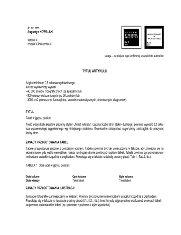 dr inż. arch. Augustyn KOWALSKI Katedra X Wydział X Politechniki X uwaga… w miejsce logo konferencji wstawić foto autora/ów TYTUŁ ARTYKUŁU Artykuł minimum 0,5 arkusza wydawniczego Arkusz wydawniczy wynosi: - 40 000 znaków typograficznych (ze spacjami) lub - 800 wierszy obliczeniowych (po 50 znaków) lub - 3000 cm2 powierzchni ilustracji (np.: wzorów matematycznych, chemicznych, diagramów). TYTUŁ Tekst w języku polskim Treść wszystkich akapitów piszemy stylem „Tekst referatu”. Łączna liczba stron (tekst+ilustracje) powinna wynosić 0,5 arkusza wydawniczego wypełnionego wg niniejszego szablonu. Ewentualne odstępstwo sugerujemy zaokrąglać do parzystej liczby stron. ZASADY PRZYGOTOWANIA TABEL Tabele przygotowuje zgodnie z poniższym wzorem. Tabela powinna być tak umieszczona w tekście, aby zmieściła się na jednej stronie, gdy jest to niemożliwe, należy na drugiej stronie powtórzyć nagłówki tabeli. Tabele powinny być ponumerowane liczbami arabskimi zgodnie z przykładem. Powołując się w tekście na tabelę prosimy pisać (Tab.1., Tab.2, itd.). TABELA 1. Opis tabel w języku polskim Opis kolumn Opis wierszy Opis kolumn Tekst tabeli Opis kolumn Tekst tabeli ZASADY PRZYGOTOWANIA ILUSTRACJI Ilustracje (fotografie) zamieszczamy w tekście1. Powinny być ponumerowane liczbami arabskimi zgodnie z przykładem. Powołując się w tekście na ilustracje prosimy pisać (il.1., il.2. , itd.). Inne formaty zdjęć prosimy lokalizować w oknach tabeli za pomocą scalenia okien tabeli (np.: pionowe + poziome o tejże wysokości) il. 1. Opis ilustracji źródło ilustracji podać jako numer pozycji literaturowej np.: [3] lub jeśli jest to fotografia autoryzowana to fot. Imię nazwisko autora, data powstania (patrz obok) il. 2. Dziedziniec biurowca Metropolitan, Warszawa. Fot. Tomasz Wagner, 2005 il. 3. Biurowiec Metropolitan, Warszawa [4] MATERIAŁY ŹRÓDŁOWE Spis literatury winien być umieszczony na końcu referatu według poniższego wzoru. Nazwiska układamy w kolejności alfabetycznej cytowanych autorów, jeżeli nazwisko powtarza się, wówczas podajemy według dat wydania. Powołując się w tekście na literaturę prosimy pisać numer pozycji [1]. Bibliografię należy zestawić w porządku alfabetycznym w następujący sposób: nazwisko (-a) autora (-ów), inicjały imion; rok wydania; tytuł pracy; skrót bibliograficzny wydawnictwa i miejsce wydania, numer tomu, zeszytu oraz numery stron. POZYCJE PODAJEMY WG WZORU PONIŻEJ: [1] Kapuściński Ryszard: Heban. Wyd. 7. Warszawa: Czytelnik, 2003. ISBN 83-07-02948-1. [2] Hutnikiewicz Artur: Badania nad literaturą Młodej Polski. W: Rozwój wiedzy o literaturze polskiej po 1918 roku. Warszawa: Czytelnik, 1986. ISBN 83-4567-37-87 s. 192-224. [3] Jaworski Marcin: Różewicz - ostatni modernista. "Polonistyka" 2005, nr 5, s. 18-24. Źródła internetowe: [4] Lima Gercina Ângela Borém: Interfaces between information science and cognitive science. Ci. Inf. [on line]. Jan./Apr. 2003, vol.32, no.1 [dostęp 30 sierpnia 2004], p.77-87. Dostępny w Internecie: <http://www.scielo.br/scielo.php?script=sci_arttext&pid=S0100-19652003000100008&lng=en&nrm=iso>. Pozycje internetowe podajemy na zakończeniu opisu materiałów źródłowych. UWAGA !!! Prosimy o usuwanie hiperłączy! Każdy element opisu bibliograficznego należy wyraźnie oddzielić właściwym znakiem interpunkcyjnym. Przykład: Kapuściński Ryszard: Heban. Wyd. 7. Warszawa: Czytelnik, 2003. ISBN 83-07-02948-1. Opis bibliograficzny pracy zbiorowej pod redakcją rozpoczyna się od tytułu. Przykład: Kompendium wiedzy o ekologii. Pod red. Jana Strzałko i Teresy Mossor-Pietraszewskiej. Wyd. 2 popr. i uzup. Warszawa: PWN, 2001. ISBN 83-01-13589-1. Opis bibliograficzny fragmentu (rozdziału) książki, (gdy cała książka jest tego samego autorstwa) sporządzamy tak jak poprzednio – dodatkowo podaje się tytuł rozdziału, strony zajęte przez rozdział. Przykład: Hutnikiewicz Artur: Od czystej formy do literatury faktu. Wyd. 5. Warszawa: Wiedza Powszechna, 1988. ISBN 837052-804-X. Ekspresjonizm, s.70-92. W opisie bibliograficznym fragmentu (rozdziału) książki z pracy zbiorowej stosujemy następujący zapis: Nazwisko i imię autora rozdziału: Tytuł rozdziału. W: Opis książki, w której zawarty jest rozdział, strony zajęte przez rozdział. Przykład: Hutnikiewicz Artur: Badania nad literaturą Młodej Polski. W: Rozwój wiedzy o literaturze polskiej po 1918 roku. Warszawa: Czytelnik, 1986. ISBN 83-4567-37-87 s. 192-224. Najważniejsze elementy opisu bibliograficznego artykułu w czasopiśmie to: Nazwisko autora (uwaga na pisownię nazwisk z przedrostkiem) Imię autora Tytuł artykułu Ew. współpracownicy (tłumacz, redaktor naukowy, autor opracowania itp.) Tytuł czasopisma (jedyny element opisu bibliograficznego pisany w cudzysłowiu) Rok wydania Numer czasopisma Strony ISSN Przykład opisy bibliograficznego artykułu z czasopisma: Jaworski Marcin: Różewicz - ostatni modernista. "Polonistyka" 2005, nr 5, s. 18-24. W opisie bibliograficznym recenzji stosujemy: Nazwisko i imię autora recenzowanej książki: Tytuł recenzowanej książki. Wydanie, Rok wydania, ISBN. Rec. Imię i nazwisko autora recenzji: Tytuł recenzji. "Tytuł czasopisma". rok, numer czasopisma, strony zajęte przez recenzję. Przykład opisu bibliograficznego recenzji: Kuczok Wojciech: Gnój. Warszawa 2003. Rec. Piotr Śliwiński: Normalni, wydrążeni, źli. "Tygodnik Powszechny" 2004, nr 32, s. 11. Uwaga: Jeżeli autorów jest dwóch lub trzech - podajemy ich personalia oddzielając od siebie przecinkami. Jeżeli autorów jest więcej niż trzech podajemy pierwszego i dopisek i in. Za autora głównego publikacji można uznać także redaktora książki, ale tylko takiej, która składa się z wielu artykułów różnych autorów a nazwisko redaktora jest wymienione na stronie tytułowej. W takim wypadku po nazwisku podaje się w nawiasie okrągłym skrót „red.” lub 