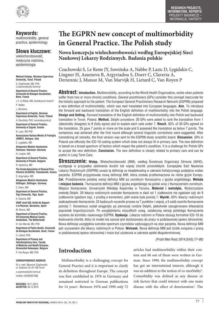 Research projects, information, reports projekty badawcze – informacje, raporty Keywords: The EGPRN new concept of multimorbidity in General Practice. The Polish study Słowa kluczowe: Nowa koncepcja wielochorobowości według Europejskiej Sieci Naukowej Lekarzy Rodzinnych. Badania polskie multimorbidity, general practice, epidemiology wielochorobowość, medycyna rodzinna, epidemiologia Medical College, Nicolaus Copernicus University, Toruń, Poland S. Czachowski, MD, PhD [email protected] Department of General Practice, Université de Bretagne Occidentale, Brest, France J.Y. Le Reste, MD, [email protected] P. Nabbe J. Deriennic Department of English, Nicolaus Copernicus University, Torun, Poland A. Sowińska, PhD, [email protected] Department of General Practice, University of Zagreb, Croatia D. Lazic, MD PhD Associazione Italiana Medici di Famiglia (AIMEF), Bologna, Italy C. Lygidakis, MD Allegemein Medizin Hochschule Hannover, Hannover, Germany H. Lingner, MD Department of General Practice, University of Plovdiv, Bulgaria R. Assenova, MD The Greek Association of General Practitioners (ELEGEIA), Thessaloniki, Greece S. Argyriadou, MD Allegemein Medizin Hochschule Göttingen, Göttingen, Germany C. Doerr, MD Department of General Practice, Vigo University, Vigo, Spain A. Claveria, MD IDIAP Jordi GOL Unitat de Support a la Recerca, Barcelona, Spain M. Munoz, MD Department of General Practice, VU University Medical Center, Amsterdam, The Netherlands H. Van Marvijk, MD, PhD Department of Public Health, Université de Bretagne Occidentale, Brest, France C. Lietard, PhD Department of Primary and Interdisciplinary Care, Faculty of Medicine and Health Sciences, Universiteit Antwerpen, Belgium P. Van Royen, MD, PhD CORRESPONDENCE ADDRESS: Dr n. med. Sławomir Czachowski ul. Grabowa 10, 87-100 Toruń [email protected] mobile +48 605427566 RECEIVED: 18.11.2013 ACCEPTED: 05.12.2013 Czachowski S, Le Reste JY, Sowińska A, Nabbe P, Lazic D, Lygidakis C, Lingner H, Assenova R, Argyriadou S, Doerr C, Claveria A, Deriennic J, Munoz M, Van Marvijk H, Lietard C, Van Royen P Abstract: Introduction. Multimorbidity, according to the World Health Organization, exists when patients suffer from two or more chronic conditions. General practitioners (GPs) consider this concept inaccurate for the holistic approach to the patient. The European General Practitioners Research Network (EGPRN) prepared a new definition of multimorbidity, which was next translated into European languages. Aim. To introduce the forward and backward translation of the English definition of multimorbidity into the Polish language. Design and Setting. Forward translation of the English definition of multimorbidity into Polish and backward translation in Toruń, Poland. Method. Delphi procedure: 30 GPs were asked to rank the translation from 1 (absolutely disagree) to 9 (fully agree) and to explain each rank under 7. Result. 83% of 30 GPs agreed on the translation. 25 gave 7 points or more on the scale and 5 assessed the translation as below 7 points. The consensus was achieved after the first round although several linguistic corrections were suggested. After considering all remarks, the final version was sent to the EGPRN study scientific board. Discussion. GPs in Poland use officially the ICD-10 coding system which does not always fit in primary care. The new definition is based on a broad spectrum of factors which impact the patient’s condition. It is a challenge for Polish GPs to accept the new definition. Conclusion. The new definition is closely related to primary care and can be useful in Long Term Care. Streszczenie: Wstęp. Wielochorobowość (MM), według Światowej Organizacji Zdrowia (WHO), występuje w przypadku zaistnienia dwóch lub więcej chorób przewlekłych. Europejska Sieć Naukowa Lekarzy Rodzinnych (EGPRN) uważa tę definicję za nieadekwatną w zakresie holistycznego podejścia wobec pacjenta. EGPRN przygotowała nową definicję MM, która została przetłumaczona na różne języki Europy. Cel. Przedstawienie polskiej wersji definicji MM po zwrotnym tłumaczeniu z języka angielskiego. Metoda i miejsce badania. Tłumaczenie definicji MM z języka angielskiego na polski wraz z tłumaczeniem zwrotnym. Miejsce tłumaczenia: Uniwersytet Mikołaja Kopernika w Toruniu. Materiał i metodyka. Wykorzystano metodę Delphi. 20 lekarzy rodzinnych oceniało tłumaczenie w skali od 1 (całkowicie nie zgadzam się) do 9 (całkowicie zgadzam się), z prośbą o komentarz, jeśli ocena była poniżej 7. Wyniki. 83% lekarzy rodzinnych zaakceptowało tłumaczenie. 25 badanych wyceniło proces na 7 punktów i więcej, a 5 osób oceniło tłumaczenie poniżej 7. Konsensus został osiągnięty po pierwszej rundzie Delphi, jakkolwiek zasugerowano kilkanaście poprawek lingwistycznych. Po uwzględnieniu wszystkich uwag, ostateczną wersję polskiego tłumaczenia wysłano do komitetu naukowego EGPRN. Dyskusja. Lekarze rodzinni w Polsce stosują formalnie ICD-10 do kodowania chorób, który to model nie zawsze jest dostosowany do pracy w podstawowej opiece zdrowotnej. Nowa definicja uwzględnia szerokie spectrum czynników wpływających na stan pacjenta. Nowa definicja MM jest wyzwaniem dla lekarzy rodzinnych w Polsce. Wniosek. Nowa definicja MM jest ściśle związana z pracą w podstawowej opiece zdrowotnej i może być użyteczna w zakresie opieki długoterminowej. (Probl Med Rodz 2014;3(43):77–80) Introduction Multimorbidity is a challenging concept for General Practice and it is important to clarify its definition throughout Europe. The concept was first established in 1976 in Germany and remained restricted to German publications for 14 years1. Between 1976 and 1990 only 72 PROBLEMY MEDYCYNY RODZINNEJ, MARCH 2014, VOL. XV, No. 3 articles had multimorbidity within their content and 66 out of them were written in German. Since 1990, the multimorbidity concept has got an international interest, although it was an addition to th