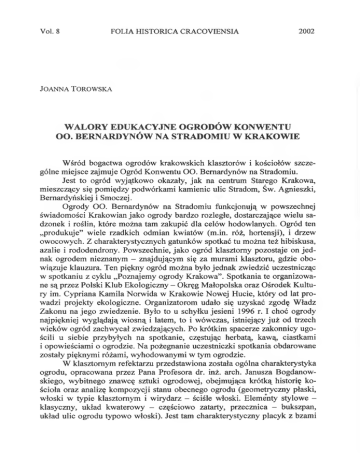Vol. 8 FOLIA HISTORICA CRACOVIENSIA 2002 Jo a n n a T o r o w s k a WALORY EDUKACYJNE OGRODÓW KONWENTU OO. BERNARDYNÓW NA STRADOMIU W KRAKOWIE Wśród bogactwa ogrodów krakowskich klasztorów i kościołów szcze gólne miejsce zajmuje Ogród Konwentu OO. Bernardynów na Stradomiu. Jest to ogród wyjątkowo okazały, jak na centrum Starego Krakowa, mieszczący się pomiędzy podwórkami kamienic ulic Stradom, Św. Agnieszki, Bernardyńskiej i Smoczej. Ogrody OO. Bernardynów na Stradomiu funkcjonują w powszechnej świadomości Krakowian jako ogrody bardzo rozległe, dostarczające wielu sa dzonek i roślin, które można tam zakupić dla celów hodowlanych. Ogród ten „produkuje” wiele rzadkich odmian kwiatów (m.in. róż, hortensji), i drzew owocowych. Z charakterystycznych gatunków spotkać tu można też hibiskusa, azalie i rododendrony. Powszechnie, jako ogród klasztorny pozostaje on jed nak ogrodem nieznanym - znajdującym się za murami klasztoru, gdzie obo wiązuje klauzura. Ten piękny ogród można było jednak zwiedzić uczestnicząc w spotkaniu z cyklu „Poznajemy ogrody Krakowa”. Spotkania te organizowa ne są przez Polski Klub Ekologiczny - Okręg Małopolska oraz Ośrodek Kultu ry im. Cypriana Kamila Norwida w Krakowie Nowej Hucie, który od lat pro wadzi projekty ekologiczne. Organizatorom udało się uzyskać zgodę Władz Zakonu na jego zwiedzenie. Było to u schyłku jesieni 1996 r. I choć ogrody najpiękniej wyglądają wiosną i latem, to i wówczas, istniejący już od trzech wieków ogród zachwycał zwiedzających. Po krótkim spacerze zakonnicy ugo ścili u siebie przybyłych na spotkanie, częstując herbatą, kawą, ciastkami i opowieściami o ogrodzie. Na pożegnanie uczestniczki spotkania obdarowane zostały pięknymi różami, wyhodowanymi w tym ogrodzie. W klasztornym refektarzu przedstawiona została ogólna charakterystyka ogrodu, opracowana przez Pana Profesora dr. inż. arch. Janusza Bogdanow skiego, wybitnego znawcę sztuki ogrodowej, obejmująca krótką historię ko ścioła oraz analizę kompozycji stanu obecnego ogrodu (geometryczny płaski, włoski w typie klasztornym i wirydarz - ściśle włoski. Elementy stylowe klasyczny, układ kwaterowy - częściowo zatarty, przecznica - bukszpan, układ ulic ogrodu typowo włoski). Jest tam charakterystyczny placyk z bzami 344 Jo a n n a T o ro w sk a - nowy, zespół orzechów od wschodu, są też drzewa proweniencji włoskiej1. Ogród ten zajmuje powierzchnię prawie Iha; 2ha zajmuje całość założenia zespół klasztorny, ogród i wirydarz2. Jest też grota z relikwiami z Ziemi Świętej. Podano wówczas informację, że w związku z zanieczyszczeniem miasta niektóre drzewa owocowe przestająjuż rodzić. Warto dodać, że niedawno, bo w 1996 r. w Muzeum Historycznym Miasta Krakowa zorganizowana została wystawa z cyklu „Zbiory krakowskich klasztorów” poświęcona zbiorom zabytków OO. Bernardynów. Niestety, ogro dy bernardyńskie nie były wówczas prezentowane. Nadal też ukazuje się wiele poważnych publikacji, które pomijają zagadnienie ogrodów klasztornych, po siadających swój wyjątkowy charakter, zarówno w zakresie formy, jak i funk cji, z dominującą funkcją kontemplacyjną. Warto przypomnieć, że pierwsze ogrody klasztorne powstały w okresie średniowiecza, kiedy to nastąpił rozwój życia monastycznego. Zakładanym wówczas klasztorom i zakonom, towarzyszyły ogrody. Szczególnie duży roz wój zakonów i wzrost liczby klasztorów cechował okres XI-XIII wieku: „W licznych klasztorach zakładanych na terenie Europy reguła zakonna prze widywała również uprawę roli i ogrodów, w których stosowane udoskonalenia oraz uprawiane i aklimatyzowane rośliny rozpowszechniły się i na terenach okolicznych. Poszczególne zakony wytworzyły określony program, zasady lo kalizacji oraz sposób rozplanowania klasztorów - nawiązujący zazwyczaj do wzoru budowli macierzystej. Pod względem układu przestrzennego i rodzaju powiązań z przestrzenią ogrodową reprezentują one dwa główne typy. Jeden pochodzi z klasztorów cenobitnych, w których zakonnicy prowadzą życie wspólne, drugi zaś z eremickich o odosobnionym życiu w pustelniach”3. Według historyka ogrodów Longina Majdeckiego, najważniejszym i stale powtarzającym się elementem ogrodowym założeń klasztornych był wi rydarz. Położony w środku klasztoru, ujęty czworobokiem zabudowy i otoczo ny naokoło krużgankami (w krajach południowych krużganki były w pełni otwarte na wirydarz, łącząc się z nim przestrzennie, co dawało bogate walory plastyczne), przypomina rzymskie ogrody prywatne w perystylu domów mieszkalnych lub publiczne wśród zabudowy miejskiej otoczone portykami ze wszystkich stron (np. Porticus Liviae). W krajach północnych i w Polsce kruż 1 J. B o g d a n o w s k i , Ogród OO. Bernardynów. Studium konserwatorskie. Niekom pletny maszynopis w Archiwum Prowincji w Krakowie OO. Bernardynów. 2 Wirydarz - to kwadratowy lub prostokątny ogród wewnątrz zabudowań klasztornych, znany od XI w. Nazwa pochodzi z języka łacińskiego: „viridis” - zielony. „Wirydarze z łaciń skiej rzeczy od zieloności są nazwane, a są to ogródki małe, w których zioła albo drzewa chocia też y obcie rosną wsadzone, aby zielonością swą ludziom czyniły lubość y rozkosz” - pisał je den z pierwszych teoretyków sztuki ogrodwej Piotr de Ćrescentiis (Krescentyn) w XIII w. For my klasztornych wirydarzy wiążą się z dziejami klasztorów, np. ich funkcjonowanie jako ozdobnych ogrodów potwierdza okres spokoju i dobrobytu. - I . W a s i l e w s k a , Klasztorne wirydarze, „Spotkania z Zabytkami”, 1998, nr 7, s. 3 n. 3 L. M aj d e c k i , Historia ogrodów, Warszawa 1978, s. 62. WALORY EDUKACYJNE OGRODÓW KONWENTU 0 0 . BERNARDYNÓW... 345 ganki często były zamknięte oknami, czasem z pozostawieniem tylko niewiel kich przeźroczy otwartych (np. w Mogile). „Wiryda