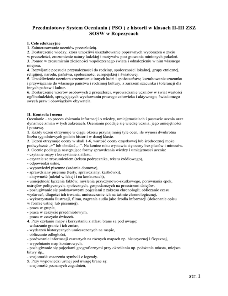 Przedmiotowy System Oceniania ( PSO ) z historii w klasach II-III ZSZ SOSW w Ropczycach I. Cele edukacyjne 1. Zainteresowanie uczniów przeszłością. 2. Dostarczenie wiedzy, która umożliwi ukształtowanie poprawnych wyobrażeń o życiu w przeszłości, zrozumienie natury ludzkiej i motywów postępowania minionych pokoleń. 3. Pomoc w zrozumieniu złożoności współczesnego świata i odnalezieniu w nim własnego miejsca. 4. Rozwijanie poczucia przynależności do rodziny, społeczności lokalnej, grupy etnicznej, religijnej, narodu, państwa, społeczności europejskiej i światowej. 5. Umożliwienie uczniom zrozumienie innych ludzi i społeczeństw; kształtowanie szacunku i przywiązanie do własnego państwa i rodzimej kultury, z zarazem szacunku i tolerancji dla innych państw i kultur. 6. Dostarczenie wzorów osobowych z przeszłości, wprowadzanie uczniów w świat wartości ogólnoludzkich, sprzyjających wychowaniu prawego człowieka i aktywnego, świadomego swych praw i obowiązków obywatela. II. Kontrola i ocena Ocenianie – to proces zbierania informacji o wiedzy, umiejętnościach i postawie ucznia oraz dynamice zmian w tych zakresach. Ocenianiu poddaje się wiedzę ucznia, jego umiejętności i postawę. 1. Każdy uczeń otrzymuje w ciągu okresu przynajmniej tyle ocen, ile wynosi dwukrotna liczba tygodniowych godzin historii w danej klasie. 2. Uczeń otrzymuje oceny w skali 1-6, wartość oceny cząstkowej lub śródrocznej może podwyższać „+” lub obniżać „-”. Na koniec roku wystawia się oceny bez plusów i minusów. 3. Ocenie podlegają następujące formy sprawdzania wiedzy i umiejętności ucznia: - czytanie mapy i korzystanie z atlasu, - czytanie ze zrozumieniem (tekstu podręcznika, tekstu źródłowego), - odpowiedzi ustne, - wypowiedzi pisemne (zadania domowe), - sprawdziany pisemne (testy, sprawdziany, kartkówki), - aktywność (udział w lekcji i na konkursach), - umiejętność łączenia faktów, myślenia przyczynowo-skutkowego, porównania epok, ustrojów politycznych, społecznych, gospodarczych na przestrzeni dziejów, - posługiwanie się podstawowymi pojęciami z zakresu chronologii; obliczanie czasu wydarzeń, długości ich trwania, umieszczanie ich na taśmie chronologicznej, - wykorzystania ilustracji, filmu, nagrania audio jako źródła informacji (dokonanie opisu w formie ustnej lub pisemnej), - praca w grupie, - praca w zeszycie przedmiotowym, - praca w zeszycie ćwiczeń. 4. Przy czytaniu mapy i korzystaniu z atlasu brane są pod uwagę: - wskazanie granic i ich zmian, - wydarzeń historycznych umieszczonych na mapie, - obliczanie odległości, - porównanie informacji zawartych na różnych mapach np. historycznej i fizycznej, - wypełnianie map konturowych, - posługiwanie się pojęciami geograficznymi przy określaniu np. położenia miasta, miejsca bitwy itp., - znajomość znaczenia symboli z legendy. 5. Przy wypowiedzi ustnej pod uwagę brane są: - znajomość poznanych zagadnień, str. 1 - samodzielność wypowiedzi, - sposób ich wypowiedzi (ład wypowiedzi, elementy kultury żywego słowa). 6. Przy wypowiedziach pisemnych ocenie podlega: - zgodność z tematem, - poprawność merytoryczna i stylistyczna, - kompozycja (podział na części, spójność, logiczność), - estetyka (pismo, marginesy), - dodatkowe walory pracy (oryginalność ujęcia, bogactwo języka, zastosowanie cytatów, itp.) 7. Do zapisu wieków uczeń jest zobowiązany używać tylko cyfr rzymskich. 8. Sprawdziany pisemne – są obowiązkowe, zapowiadane uczniom i wpisywane do dziennika z tygodniowym wyprzedzeniem. Sprawdziany przeprowadzane są po omówieniu określonej partii materiału np. jednego działu lub po zrealizowaniu tematycznej części z danego materiału. Uczniowie znają zakres materiału przewidzianego do kontroli. Ze sprawdzianów, powtórzeń i zapowiedzianych kartkówek nie można zgłosić nie przygotowania. Sprawdziany i kartkówki oceniamy według systemu punktowego. - 0%-29% ndst - 30%-50% dop - 51%-74% dst - 75%-94% db - 95%-100% bdb Spisywanie (ściąganie) na sprawdzianie jest jednoznaczne z otrzymaniem oceny niedostatecznej. 9. Odpowiedzi ustne i kartkówki dotyczą materiału z ostatnich trzech lekcji. 10. Uczeń, który opuścił sprawdzian, pisze go w następnym dniu zajęć. 11. Uczeń może poprawić tylko ocenę niedostateczną i dopuszczającą ze sprawdzianu w terminie uzgodnionym z nauczycielem. 12. Praca domowa – kontrolowana na bieżąco. Uczeń musi być przygotowany z trzech ostatnich lekcji lub z zadanej partii materiału (np. działu) – po wcześniejszym zapowiedzeniu przez nauczyciela. 13. Prace domowe mogą być pisemne, ustne lub polegać na przygotowaniu określonych materiałów potrzebnych na lekcję. Prace mogą być krótko lub długoterminowe. Nie poprawiamy zadań domowych, gdyż są one ćwiczeniem zdobytych wiadomości na lekcji. 14. Spisywanie prac domowych jest jednoznaczne z otrzymaniem oceny niedostatecznej. 15. Uczeń ma prawo zgłosić w okresie nieprzygotowanie do lekcji raz w semestrze. 16. Jeżeli uczeń nie zgłosi nieprzygotowania, nauczyciel ma prawo wpisać uczniowi do dziennika ocenę niedostateczną, jeżeli dostrzeże nieprzygotowanie ucznia. 17. Aktywność, czyli czynny udział ucznia w pracy na lekcji, jest nagradzana oceną (np. za udział w konkursie, dodatkową pracę pozalekcyjną). 18. Prowadzenie zeszytu przedmiotowego – uczeń obowiązkowo prowadzi zeszyt! Przynajmniej raz w roku otrzymuje ocenę za prowadzenie zeszytu. Pod uwagę przy ocenianiu brane są poniższe elementy: - estetyka zeszytu, - staranność zapisu, - systematyczność w zapisach lekcyjnych, - daty na marginesie przy tematach lekcji, - numeracja lekcji, - podkreślenia tematów, - podkreślenie lub zapisanie innym kolorem ważnych pojęć i dat historycznych, Uczeń nie używa w zeszycie do pisania koloru czerwonego, gdyż jest on zarezerwowany dla nauczyciela. 19. Ocena klasyfikacyjna wynik