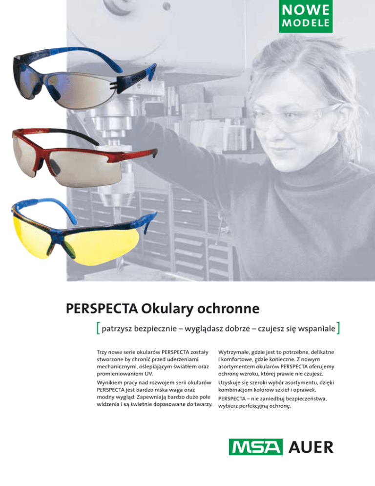 NOWE MODELE PERSPECTA Okulary ochronne [ patrzysz bezpiecznie – wygl¥dasz dobrze – czujesz si∏ wspaniale ] Trzy nowe serie okularów PERSPECTA zostaÆy stworzone by chroni∑ przed uderzeniami mechanicznymi, o≤lepiaj¥cym ≤wiatÆem oraz promieniowaniem UV. WytrzymaÆe, gdzie jest to potrzebne, delikatne i komfortowe, gdzie konieczne. Z nowym asortymentem okularów PERSPECTA oferujemy ochron∏ wzroku, której prawie nie czujesz. Wynikiem pracy nad rozwojem serii okularów PERSPECTA jest bardzo niska waga oraz modny wygl¥d. Zapewniaj¥ bardzo du∂e pole widzenia i s¥ ≤wietnie dopasowane do twarzy. Uzyskuje si∏ szeroki wybór asortymentu, dzi∏ki kombinacjom kolorów szkieÆ i oprawek. PERSPECTA – nie zaniedbuj bezpieczeπstwa, wybierz perfekcyjn¥ ochron∏. PERSPECTA 9000 [ Niezwykle lekkie i ≤wietnie dopasowane ] Rewolucyjnie mocne zauszniki z mi∏kkim wykoπczeniem. Szczelnie dopasowane, szkÆa, oferuj¥ szerokie pole widzenia. Świetnie dopasowane, zawini∏te dookoÆa poliw∏glanowe szkÆa zapewniaj¥ doskonaÆ¥ ochron∏ wokóÆ oczu. Niewiarygodnie lekkie (26 gramów), elastyczne i wytrzyma Æe okulary ochronne do caÆodziennego noszenia Dane do zamówienia [12 szt. w opakowaniu] 10045516 PERSPECTA 9000, bezbarwne szkÆa Specjalne wypustki nosowe chroni¥ okulary przed ze≤lizgiwaniem si∏ z Twojej twarzy, jednocze≤nie opieraj¥c si∏ bardzo delikatnie. 10045517 PERSPECTA 9000, bezbarwne, nieparuj¥ce szkÆa 10045519 PERSPECTA 9000, bursztynowe, nieparuj¥ce szkÆa 10045518 PERSPECTA 9000, przydymione, nieparuj¥ce szkÆa 10045640 PERSPECTA 9000, niebieskie, lustrzane szkÆa PERSPECTA 1900 [ Bardzo eleganckie, z panoramicznym polem widzenia ] Dost∏pne ze szkÆami jasnozÆotymi do u∂ywania w pomieszczeniach i na zewn¥trz oraz z ciemnobr¥zowymi na zewn¥trz. Klasyczne zauszniki. Dzi∏ki poÆ¥czeniu dwóch materiaÆów po zaÆo∂eniu zapominasz, ∂e masz okulary. Najwy∂szej jako≤ci szkÆa o doskonaÆej przejrzysto≤ci. Niewiarygodnie lekkie (27 gramów) i wygodne Dane do zamówienia [12 szt. w opakowaniu] 10045648 PERSPECTA 1900, bezbarwne szkÆa 10045647 PERSPECTA 1900, bezbarwne, nieparuj¥ce szkÆa 10045645 PERSPECTA 1900, jasnozÆote lustro, UV 400, nieparuj¥ce szkÆa 10045646 PERSPECTA 1900, ciemnobr¥zowe, nieparuj¥ce szkÆa 2 Uniwersalny mostek nosowy z mi∏kkimi wypustkami chroni okulary przed ze≤lizgiwaniem si∏ PERSPECTA 010 [ nowoczesny styl z maksymaln¥ ochron¥ i komfortem ] Wtopiona specjalna poduszka czoÆowa daje wyj¥tkowy komfort i ochron∏ przed uderzeniem. Specjalny mechanizm zapadkowy do ustawiania k¥ta nachylenia szkieÆ oraz regulacja dÆugo≤ci zauszników. DookoÆa zakrzywione, poliw∏glanowe szkÆa zakrywaj¥ szczelnie oczy nie ograniczaj¥c pola widzenia. PóÆ-oprawki i cienkie zauszniki powoduj¥, ∂e ten model okularów wa∂y zaledwie 32 gramy. Dane do zamówienia [12 szt. w opakowaniu] 10045641 PERSPECTA 010, bezbarwne szkÆa Specjalnie wtopione poduszeczki nosowe, zintegrowane z oprawk¥ zabezpieczaj¥ okulary przed ze≤lizgiwaniem si∏, jednocze≤nie opieraj¥c si∏ bardzo delikatnie. 10045642 PERSPECTA 010, bezbarwne, nieparuj¥ce szkÆa Wtopione poduszeczki na oprawkach i wypustkach 10045643 PERSPECTA 010, bursztynowe, nosowych powoduj¥ce nieparuj¥ce szkÆa ≤wietne dopasowanie i 10045644 PERSPECTA 010, przydymione, pozwalaj¥ce na wymian∏ nieparuj¥ce szkÆa powietrza. PowÆoki Filtry UV Kolory szkieÆ Kolory szkieÆ, charakterystyki, opcje wykoπczenia Bezbarwne: do u∂ytku wewn¥trz budynków Bursztynowe: maksymalne zwi∏kszenie kontrastu w sÆabo o≤wietlonym otoczeniu. Idealne dla operatorów wózków widÆowych, pracowników magazynowych. Odpowiednie dla kierowców prowadz¥cych noc¥, do jazdy dziennej (zapobiegaj¥ o≤lepianiu) oraz dla pracowników nocnej zmiany. Normy Wszystkie okulary PERSPECTA s¥ zgodne z norm¥ EN 166:1995 i normami: EN 170: Filtry chroni¥ce przed nadfioletem EN 172: Filtry chroni¥ce przed ol≤nieniem sÆonecznym, do zastosowaπ przemysÆowych Przydymione: Idealne do pracy w ostrym ≤wietle sÆonecznym (szkÆa zapobiegaj¥ce o≤lepianiu). Świetne rozpoznawanie kolorów. Ciemnobr¥zowe: Specjalne, br¥zowe zabarwienie szkie Æ dla polepszenia widzenia na zewn¥trz budynków. Idealne do pracy w ostrym ≤wietle sÆonecznym. Świetne rozpoznawanie kolorów. PrzykÆady zastosowaπ Niebieskie lustro: Idealne do pracy w ostrym ≤wietle sÆonecznym. Perfekcyjnie zabezpieczaj¥ przed o≤lepianiem. Świetne rozpoznawanie kolorów. • toczenie JasnozÆote lustro: Polecane, gdy pracuje si∏ na zmian∏ wewn¥trz i na zewn¥trz budynku. Wygodne w bardzo zmiennych warunkach o≤wietlenia. Redukuj¥ mo∂liwo≤∑ o≤lepienia ≤wiatÆem sÆonecznym i sztucznym. Świetne rozpoznawanie kolorów. • szlifowanie • mechanika precyzyjna • polerowanie • prace monta∂owe • prace warsztatowe UV 400: Najlepsza ochrona przed promieniowaniem UV. Blokuje 100% szkodliwych promieni ultrafioletowych. Polecane w ≤rodowisku, gdzie wyst∏puje wysokie promieniowanie UV. • inne prace niebezpieczne w przemy≤le, laboratoriach, przy majsterkowaniu zarówno wewn¥trz jak i na zewn¥trz budynków. Promieniowanie UV: Wszystkie szkÆa poliw∏glanowe filtruj¥ 99,9% promieniowania UV. Przeciw parowaniu: Redukuje niebezpieczeπstwo znieksztaÆconego widzenia podczas, gdy okulary zaparowuj¥ Wzmacniaj¥ce: Wszystkie szkÆa maj¥ tward¥ powÆok∏ ograniczaj¥c¥ mo∂liwo≤∑ zarysowania. 3 Oznaczenia [ przykÆady oznaczeπ szkieÆ i oprawek ] 2-1.2 1F K Oznaczenie zakresów ochrony: 2-1.2 Filtruj¥ powy∂ej 99% szkodliwego promieniowania UV do 380 nm, mog¥ mie∑ wpÆyw na rozpoznawanie kolorów i nie chroni¥ przed ol≤nieniem sÆonecznym 2-1.2 Klasa optyczna: 1 [najlepsza klasa do ci¥gÆego u∂ywania] Odporno≤∑ na uderzenia: F [niska energia uderzenia 45 m/s] 1F K Odporno≤∑ powierzchni na uszkodzenia przez drobne cz¥steczki: K 3-1.2 Filtruj¥ 