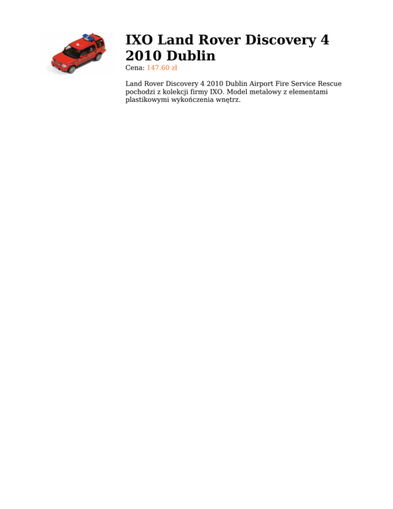 IXO Land Rover Discovery 4 2010 Dublin Cena: 147.60 zł Land Rover Discovery 4 2010 Dublin Airport Fire Service Rescue pochodzi z kolekcji firmy IXO. Model metalowy z elementami plastikowymi wykończenia wnętrz.