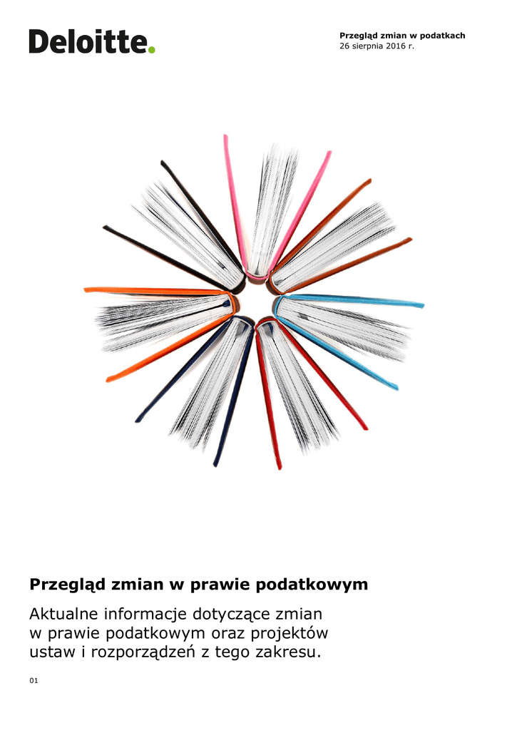Przegląd zmian w podatkach Przegląd zmian w podatkach 26 sierpnia 2016 r. Przegląd zmian w prawie podatkowym Aktualne informacje dotyczące zmian w prawie podatkowym oraz projektów ustaw i rozporządzeń z tego zakresu. 01 Przegląd zmian w podatkach Spis treści VAT 5 Weszło w życie 1. 5 1 sierpnia 2016 r. weszła w życie ustawa z 7 lipca 2016 r. o zmianie ustawy o podatku od towarów i usług oraz niektórych innych ustaw 2. 1 sierpnia 2016 r. weszło w życie rozporządzenie Ministra Finansów z 21 lipca 2016 r. w sprawie wzoru deklaracji o należnych kwotach podatku od towarów i usług w przypadku wewnątrzwspólnotowego nabycia paliw silnikowych 3. 1 sierpnia 2016 r. weszło w życie rozporządzenie Ministra Finansów z 25 lipca 2016 r. w sprawie wzorów deklaracji dla podatku od towarów i usług 4. 9 sierpnia 2016 r. weszło w życie rozporządzenie Ministra Finansów z 14 lipca 2016 r. uchylające rozporządzenie w sprawie terminu zapłaty podatku od towarów i usług z tytułu importu towarów 5. 20 sierpnia 2016 r. weszło w życie rozporządzenie Ministra Finansów z 16 sierpnia 2016 r. zmieniające rozporządzenie w sprawie deklaracji importowej dla podatku od towarów i usług 6. 23 sierpnia 2016 r. weszło w życie rozporządzenie Ministra Finansów z 18 sierpnia 2016 r. zmieniające rozporządzenie w sprawie sposobu przesyłania deklaracji i podań oraz rodzajów podpisu elektronicznego, którymi powinny być opatrzone Projekty 1. 7 Ustawa z 22 lipca 2016 r. o szczególnych zasadach rozliczeń podatku od towarów i usług oraz dokonywania zwrotu środków publicznych przeznaczonych na realizację projektów finansowanych z udziałem środków pochodzących z budżetu Unii Europejskiej lub od państw członkowskich Europejskiego Porozumienia o Wolnym Handlu przez jednostki samorządu terytorialnego 2. Projekt rozporządzenia Ministra Rozwoju z 17 sierpnia 2016 r. w sprawie kryteriów i warunków technicznych, którym muszą odpowiadać kasy rejestrujące Akcyza i cło Weszło w życie 1. 8 8 30 lipca 2016 r. weszło w życie rozporządzenie Ministra Finansów z 7 lipca 2016 r. zmieniające rozporządzenie w sprawie dokumentu dostawy, warunków i sposobu zwrotu wyrobów akcyzowych objętych zwolnieniem od akcyzy ze względu na ich przeznaczenie oraz środków skażających alkohol etylowy 2. 3 sierpnia 2016 r. weszło w życie rozporządzenie Ministra Finansów z 1 lipca 2016 r. zmieniające rozporządzenie w sprawie zwolnień od podatku akcyzowego 02 Przegląd zmian w podatkach 3. 13 sierpnia 2016 r. weszło w życie rozporządzenie Ministra Finansów z 18 lipca 2016 r. zmieniające rozporządzenie w sprawie zwolnień od podatku od towarów i usług oraz warunków stosowania tych zwolnień 4. 20 sierpnia 2016 r. weszła w życie ustawa z 22 czerwca 2016 r. o zmianie ustawy - Prawo celne oraz niektórych innych ustaw 5. 20 sierpnia 2016 r. weszło w życie rozporządzenie Ministra Finansów z 17 sierpnia 2016 r. w sprawie odraczania terminu płatności należności celnych 6. 23 sierpnia 2016 r. weszło w życie rozporządzenie Ministra Finansów z 19 sierpnia 2016 r. w sprawie świadectwa potwierdzającego niepreferencyjne pochodzenie towaru Projekty 10 1. Projekt ustawy z 20 czerwca 2016 r. o zmianie ustawy o podatku akcyzowym 2. Projekt rozporządzenia Ministra Finansów z 13 czerwca 2016 r. w sprawie zgłoszeń celnych 3. Projekt rozporządzenia Ministra Finansów z 7 lipca 2016 r. zmieniającego rozporządzenie w sprawie miejsca świadczenia usług oraz zwrotu kwoty podatku naliczonego jednostce dokonującej nabycia (importu) towarów lub usług 4. Projekt rozporządzenia Ministra Finansów z 27 lipca 2016 r. zmieniającego rozporządzenie w sprawie urzędów celnych, w których może być dokonywany wywóz, przywóz i tranzyt towarów o znaczeniu strategicznym 5. Projekt rozporządzenia Ministra Finansów z 1 sierpnia 2016 r. zmieniającego rozporządzenie w sprawie urzędów celnych, w których są dokonywane czynności przewidziane przepisami prawa celnego w zależności od rodzaju towarów lub procedur celnych, którymi mogą być obejmowane towary Podatki dochodowe Projekty 1. 11 11 Ustawa z 22 lipca 2016 r. o zmianie ustawy o podatku dochodowym od osób fizycznych oraz ustawy o podatku dochodowym od osób prawnych Pozostałe Projekty 12 12 1. Projekt ustawy z 23 maja 2016 r. o zmianie ustawy o grach hazardowych i innych ustaw 2. Projekt ustawy z 1 lipca 2016 r. o zmianie niektórych ustaw w celu poprawy otoczenia prawnego przedsiębiorców 3. Projekt rozporządzenia Ministra Finansów z 29 lipca 2016 r. w sprawie wzoru deklaracji podatkowej o wysokości podatku od sprzedaży detalicznej 4. Projekt rozporządzenia Ministra Finansów z 18 sierpnia 2016 r. w sprawie przedłużenia terminu do przekazywania informacji, o której mowa w art. 82 § 1b Ordynacji podatkowej Oczekujące 03 14 Przegląd zmian w podatkach 1. 1 września 2016 r. wejdzie w życie ustawa ustawa z 6 lipca 2016 r. o podatku od sprzedaży detalicznej 2. 1 października 2016 r. wejdzie w życie ustawa z 20 maja 2016 r. o efektywności energetycznej 3. 1 stycznia 2017 r. wejdzie w życie ustawa z 13 kwietnia 2016 r. o zmianie ustawy o podatku dochodowym od osób fizycznych, ustawy o podatku dochodowym od osób prawnych oraz ustawy o swobodzie działalności gospodarczej 04 Przegląd zmian w podatkach VAT Weszło w życie 1. 1 sierpnia 2016 r. weszła w życie ustawa z 7 lipca 2016 r. o zmianie ustawy o podatku od towarów i usług oraz niektórych innych ustaw Celem ustawy jest wprowadzenie rozwiązań zapobiegających występowaniu oszustw w VAT w obszarze wewnątrzwspólnotowego obrotu paliwami płynnymi, a także ograniczenie ich negatywnego wpływu na funkcjonowanie rynku paliw płynnych oraz na dochody budżetu Państwa. Rozwiązania dotyczą uszczelnienia systemu poboru VAT przy wewnątrzwspólnotowym nabyciu paliw oraz uszczelnienia procesu koncesjonowania obrotu paliwami w wymiarze mi