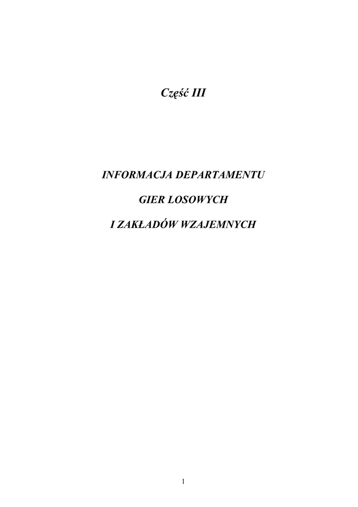 Część III INFORMACJA DEPARTAMENTU GIER LOSOWYCH I ZAKŁADÓW WZAJEMNYCH 1 INFORMACJA DEPARTAMENTU GIER LOSOWYCH I ZAKŁADÓW WZAJEMNYCH ZAGADNIENIA: 1. Struktura organizacyjna strukturę organizacyjną Departamentu GL określa regulamin organizacyjny departamentu – załącznik nr 1; 2. Struktura zatrudnienia Dyrektor Departamentu – 1 Z-ca Dyrektora Departamentu – 1 Naczelnicy Wydziałów – 2 Radca Ministra – 1 Główni Specjaliści – 3 Starsi specjaliści – 4 Specjaliści – 5 Referendarze – 4 Podreferendarze – 3 Referent – 1 Sekretarz Dyrektora – 1 W departamencie nie występują przerosty zatrudnienia. Departament GL od kilku lat wnioskuje o zwiększenie zatrudnienia głównie w zakresie rejestracji urządzeń do gier, egzaminów zawodowych, kontroli oraz kwestii unijnych. Wobec pracowników departamentu nie toczy się żadne postępowanie dyscyplinarne. 3. Dochody i wydatki Z działalności w zakresie gier i zakładów wzajemnych realizowane są następujące dochody: Dochody budżetu państwa i funduszy celowych wynikające z ustawy o grach i zakładach wzajemnych Rodzaj dochodu Rok 2004 20,6 3 kwartały 2005 roku ( w mln zł) 12,0 4,5 4,0 25,1 16,0 772,3 579,2 ( w mln zł) Art. 39 ust. 1 ww. ustawy – 1. Opłaty za udzielone dochód budżetu państwa zezwolenia na urządzanie gier i zakładów wzajemnych 2. Opłaty za egzaminy i wydane świadectwa zawodowe dla osób zatrudnionych przy urządzaniu gier i zakładów wzajemnych oraz świadectwa uznane za równoważne ze świadectwami zawodowymi wydane przez wyspecjalizowany podmiot Razem opłaty Art. 40 ust. 1 ww. ustawy – dochód budżetu państwa Podatek od gier 2 Art. 47a ww. ustawy – dochody państwowych Dopłaty do stawek w grach funduszy celowych (sport stanowiących monopol Państwa i kultura) Razem 601,7 426,8 1.399,1 1.022,0 Wydatki dotyczące funkcjonowania Departamentu Gier Losowych i Zakładów Wzajemnych w całości z budżetu Ministerstwa Finansów. 4. Współpraca z Unią Europejską W chwili obecnej toczą się prace nad projektem Dyrektywy o usługach na rynku wewnętrznym. Udział Departamentu w pracach nad w/w dyrektywą wiąże się z wypracowaniem stanowiska w zakresie proponowanych zapisów. Jednocześnie informuję, iż w wyniku zgłaszanych przez Ministra Finansów propozycji istnieje szansa wyłączenia gier i zakładów wzajemnych z zakresu jej regulacji. Departament GL nie korzysta ze środków pomocowych Unii Europejskiej. 5. Szczególny nadzór podatkowy. W związku z faktem , iż podmioty prowadzące działalność w zakresie gier i zakładów wzajemnych podlegają również szczególnemu nadzorowi podatkowemu, tut. Departament prowadzi na bieżąco współpracę z Departamentem Kontroli Celno-Akcyzowej. W ramach przedmiotowego współdziałania w/w Departament przekazuje okresowo do Departamentu Gier Losowych i Zakładów Wzajemnych informacje dotyczące podejmowanych działań kontrolnych, mających na celu w szczególności przeciwdziałanie funkcjonowaniu nielegalnych automatów do gier, jak również o prowadzonych wspólnie z Policją akcjach w tym względzie. Z kolei tut. Departament, w przypadku otrzymania informacji o ewentualnych nieprawidłowościach mogących być przedmiotem działań ze strony szczególnego nadzoru podatkowego - przekazuje posiadane w tym zakresie informacje do Departamentu Kontroli Celno- Akcyzowej. Tego rodzaju współpraca umożliwia wymianę posiadanych informacji i przyczynia się do lepszej realizacji zadań w tym względzie. Ponadto w razie konieczności przekazywane są do w/w Departamentu oraz poszczególnych jednostek sprawujących szczególny nadzór podatkowy wyjaśnienia dotyczące wątpliwości w zakresie stosowania przepisów ustawy o grach i zakładach wzajemnych. Obszary zagrożone korupcją (propozycje rozwiązań). W opinii Departamentu korupcja może wystąpić przede wszystkim tam, gdzie działalność gospodarcza podlega reglamentacji ze strony państwa. Trudno jest w tym obszarze zupełnie wyeliminować zagrożenie korupcją, bowiem każde reglamentowanie wiąże się z przyznaniem organom władzy publicznej pewnej uznaniowości w podejmowaniu decyzji. Dlatego ograniczenia w zakresie prowadzenia działalności gospodarczej powinny pojawiać się tylko tam, gdzie jest to absolutnie konieczne i daje się usprawiedliwić ważnym interesem społecznym. Takie ograniczenia powinny być wyraźnie sformułowane w przepisach obowiązującego prawa, które jednocześnie powinny określać procedurę uzyskiwania zezwolenia/koncesji na prowadzenie reglamentowanej działalności. Procedury powinny do minimum ograniczyć uznaniowość organów władzy publicznej, na rzecz jasno i precyzyjnie sformułowanych przepisów prawa. Działalność w zakresie gier losowych, zakładów wzajemnych i gier na automatach podlega ścisłej reglamentacji. Z uwagi na fakt, że hazard zawsze wiąże się z 3 ryzykiem wystąpienia zjawisk z pogranicza społecznej patologii, potrzeba kontroli rozwoju tego rynku przez państwo nie powinna budzić wątpliwości. Z drugiej jednak strony Departament Gier Losowych i Zakładów Wzajemnych dostrzegając zagrożenia, o których wyżej mowa, w ostatnich latach inicjował działania o charakterze legislacyjnym, jak i organizacyjnym, których celem było wyeliminowanie zagrożeń korupcyjnych. Przede wszystkim podjęto działania organizacyjne, których celem było ograniczenie kontaktu pracowników z interesantami. W tym celu wprowadzono w 2000 r. wewnętrzną instrukcję, zgodnie z którą składanie wniosków, jak i odbiór dokumentów odbywa się wyłącznie przez sekretariat a udzielanie informacji następuje wyłącznie w formie pisemnej odpowiedzi na zapytanie udzielone także w tej formie. Ograniczono także kontakt telefoniczny pracowników z podmiotami ubiegającymi się o zezwolenie. Działalność Departamentu Gier Losowych i Zakładów Wzajemnych jest objęta sprawozdaniem, jakie Minister Finansów przed