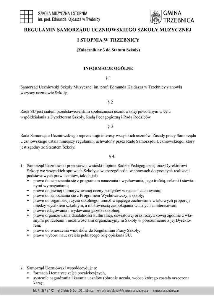 REGULAMIN SAMORZĄDU UCZNIOWSKIEGO SZKOŁY MUZYCZNEJ I STOPNIA W TRZEBNICY (Załącznik nr 3 do Statutu Szkoły) INFORMACJE OGÓLNE §1 Samorząd Uczniowski Szkoły Muzycznej im. prof. Edmunda Kajdasza w Trzebnicy stanowią wszyscy uczniowie Szkoły. §2 Rada SU jest ciałem przedstawicielskim społeczności uczniowskiej powołanym w celu współdziałania z Dyrektorem Szkoły, Radą Pedagogiczną i Radą Rodziców. §3 Rada Samorządu Uczniowskiego reprezentuje interesy wszystkich uczniów. Zasady pracy Samorządu Uczniowskiego ustala niniejszy regulamin, uchwalony przez Radę Samorządu Uczniowskiego, który jest zgodny ze Statutem Szkoły. §4 1. Samorząd Uczniowski przedstawia wnioski i opinie Radzie Pedagogicznej oraz Dyrektorowi Szkoły we wszystkich sprawach Szkoły, a w szczególności w sprawach dotyczących realizacji podstawowych praw uczniów, takich jak:  prawo do zapoznania się z programem nauczania i wychowania, jego treścią, celami i stawianymi wymaganiami;  prawo do jawnej i umotywowanej oceny postępów w nauce i zachowaniu;  prawo do zapoznania się z Programem Wychowawczym szkoły;  prawo do organizacji życia szkolnego, umożliwiającego zachowanie właściwych proporcji między wysiłkiem szkolnym, a możliwością zaspokajania własnych zainteresowań;  prawo redagowania i wydawania gazetki szkolnej;  prawo organizowania działalności kulturalnej, oświatowej oraz rozrywkowej zgodnie z własnymi potrzebami i możliwościami organizacyjnymi Szkoły w porozumieniu z jej Dyrektorem;  prawo do wnoszenia wniosków do Regulaminu Pracy Szkoły;  prawo wyboru nauczyciela pełniącego rolę opiekuna SU. 2. Samorząd Uczniowski współdecyduje o:  formach i tematyce zajęć pozalekcyjnych,  systemie nagradzania i karania uczniów (obronie ucznia, wobec którego została orzeczona kara); 3. Samorząd Uczniowski ponadto:  organizuje społeczność uczniowską do jak najlepszego spełniania obowiązków szkolnych;  dba o mienie szkolne;  organizuje pomoc koleżeńską uczniom napotykającym trudności w nauce;  dba – w całokształcie swojej działalności – o dobre imię Szkoły;  zgłasza kandydatury uczniów do wyróżnień i nagród stosowanych w szkole;  wydaje opinie, na wniosek Dyrektora Szkoły, w sprawie oceny pracy nauczycieli. ORGANY SAMORZĄDU UCZNIOWSKIEGO §5 1. Samorząd Uczniowski tworzy Rada, w skład której wchodzą:     przewodniczący; zastępca przewodniczącego; skarbnik; sekretarz. 2. Kadencja Samorządu trwa jeden rok. KOMPETENCJE SAMORZĄDU UCZNIOWSKIEGO §6 Do kompetencji Samorządu Uczniowskiego należą: uchwalanie Regulaminu SU; podejmowanie uchwał w sprawie dokonywania zmian w Regulaminie; podejmowanie uchwał w ramach kompetencji SU; ustalanie i zatwierdzanie planu pracy SU na dany rok szkolny; wykonywanie uchwał Rady SU; czuwanie nad terminową realizacją planu pracy; pomoc w przygotowaniu imprez i uroczystości szkolnych; rozwiązywanie spraw spornych dotyczących uczniów; występowanie z wnioskami do Dyrektora Szkoły, Rady Pedagogicznej, Rady Rodziców w ramach swoich kompetencji;  wydawanie gazetki szkolnej          TRYB WYBORU ORGANÓW SAMORZĄDU UCZNIOWSKIEGO §7 1. Wybory do Samorządu dokonywane są w głosowaniu tajnym. 2. Kandydować w wyborach może każdy uczeń uczęszczający do Szkoły i nie sprawiający kłopo- tów wychowawczych. 3. Członkowie Komisji Wyborczej wybierani są spośród uczniów w porozumieniu z opiekunem Samorządu. 4. Zadaniem Komisji Wyborczej jest przygotowanie kart do głosowania, przeprowadzenie wyborów 5. 6. 7. 8. 9. i przeliczenie głosów. Wybory mogą być poprzedzone kampanią wyborczą trwającą minimum jeden tydzień, podczas której kandydaci mają prawo do zaprezentowania własnego programu działania w Strukturach Samorządu Uczniowskiego. Wybory są przeprowadzone w trybie tajnym, a wszyscy uczniowie na kartach do głosowania dokonują wyboru przewodniczącego Samorządu Uczniowskiego. Przewodniczącym zostaje kandydat, który otrzymał największą liczbę głosów, zaś zastępcą, skarbnikiem, sekretarzem – kolejni kandydaci. Kandydaci za obustronną zgodą mogą zamieniać się funkcjami. Rada Samorządu na pierwszym posiedzeniu dokonuje podziału obowiązków. TRYB WYBORU OPIEKUNA SAMORZĄDU UCZNIOWSKIEGO §8 1. Wyboru Opiekuna SU z ramienia Rady Pedagogicznej dokonują wszyscy uczniowie w głosowa2. 3. 4. 5. 6. 7. niu równym, tajnym i powszechnym w miesiącu wrześniu - po skończonej rocznej kadencji. Opiekunem zostaje ten nauczyciel, który uzyska największą liczbę głosów. Warunkiem wyboru nauczyciela na opiekuna Samorządu Uczniowskiego jest wyrażenie przez niego zgody. W przypadku nie wyrażenia zgody przez nauczyciela, opiekunem zostaje ten nauczyciel, który w kolejności uzyskał największą ilość głosów, po uprzednim wyrażeniu przez niego zgody. Kadencja opiekuna Samorządu Uczniowskiego trwa rok. Opiekun jest doradcą służącym swoją pomocą i doświadczeniem w pracy Samorządu. Opiekun ma prawo uczestniczenia we wszystkich formach pracy Samorządu. TRYB I ZASADY WYDAWANIA OPINII PRZEZ SAMORZĄD UCZNIOWSKI §9 1. Rada SU przedstawia wymaganą opinię w terminie 14 dni od daty wpłynięcia wniosku. 2. Przewodniczący SU przedstawia organowi, który wystąpił o opinię jej odpis, podpisany przez przewodniczącego SU i opiekuna SU. TRYB PODEJMOWANIA UCHWAŁ § 10 1. Uchwały podejmuje Rada SU zwykłą większością głosów przy obecności co najmniej 2/3 regula2. 3. 4. 5. minowego składu Rady. Uchwały w sprawach osobowych podejmowane są w formie tajnej. Listę uczestników zebrania Rady oraz jego prawomocność ustala każdorazowo przewodniczący SU lub sekretarz SU. Zebrania i uchwały Rady SU są protokołowane w księdze protokołów. Za prawidłowe jej prowadzenie odpowiada sekretarz, a za realizację uchwał - przewodniczący SU. Rada SU przed podjęciem uchwały dotyczącej danej sprawy może przeprowadzić ogólnoszkolne głosowanie nad t
