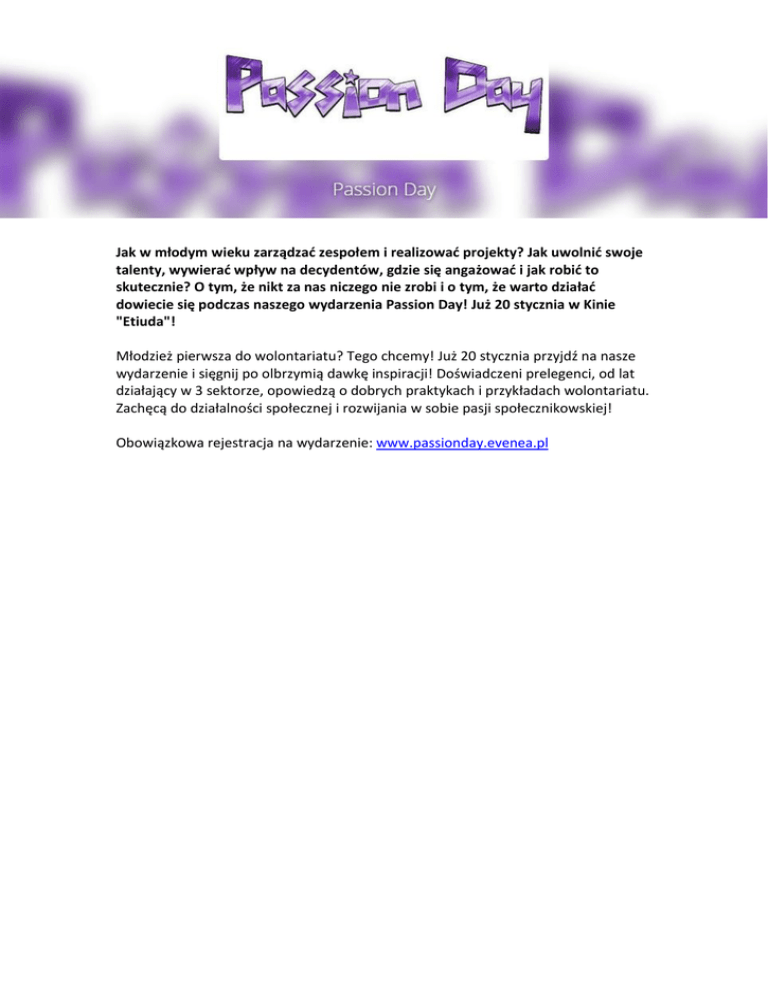 Jak w młodym wieku zarządzać zespołem i realizować projekty? Jak uwolnić swoje talenty, wywierać wpływ na decydentów, gdzie się angażować i jak robić to skutecznie? O tym, że nikt za nas niczego nie zrobi i o tym, że warto działać dowiecie się podczas naszego wydarzenia Passion Day! Już 20 stycznia w Kinie "Etiuda"! Młodzież pierwsza do wolontariatu? Tego chcemy! Już 20 stycznia przyjdź na nasze wydarzenie i sięgnij po olbrzymią dawkę inspiracji! Doświadczeni prelegenci, od lat działający w 3 sektorze, opowiedzą o dobrych praktykach i przykładach wolontariatu. Zachęcą do działalności społecznej i rozwijania w sobie pasji społecznikowskiej! Obowiązkowa rejestracja na wydarzenie: www.passionday.evenea.pl CZĘŚĆ I - GŁÓWNA, PREZENTACJE (Sala kinowa, Kino “Etiuda”) 20 stycznia 2017 8.00 -> oficjalna inauguracja Passion Day, wypowiedzi organizatorów i gości specjalnych 8.15 -> #POZNAJ_ORGANIZATORÓW - zobacz prezentacje organizatorów Passion Day, usłysz ich historię i zobacz, jak działają! -> 8.15 - Patryk Stępień - założyciel i lider Zespołu Pomocy Koleżeńskiej -> 8.30 - Martyna Cichocińska - Ostrowieckie Gry bez Prądu 8.45 -> #NIKT_ZA_MNIE_NICZEGO_NIE_ZROBI - wystąpienie Barbary Zamożniewicz, świętokrzyskiego rzecznika młodzieży 9.00 -> #NAUKA_WCALE_NIE_MUSI_BYĆ_NUDNA! - wystąpienie Bożeny Kolasy, kierownika Świetlicy Środowiskowej Wspólnoty Świętokrzyskiej 9.15 -> #UWOLNIĆ_TALENTY - wystąpienie Piotra Koziola, prezesa Fundacji "Kwitnące Talenty" 9.45 -> #O_WOLONTARIACIE_MIĘDZYNARODOWYM - wystąpienie Michała Brauna, ewaluatora wniosków EACEA w Komisji Europejskiej 10.15 -> #MAM_ODWAGĘ_DZIAŁAĆ - wystąpienie Marzeny Okły-Drewnowicz działaczki społecznej, posłanki na Sejm RP 10.30 -> #PAMIĘTAM_O_PRZESZŁOŚCI_ŻYJĘ_TERAŹNIEJSZOŚCIĄ_KREUJĘ_SWOJĄ_PRZYSZŁOŚĆ - wystąpienie Beaty Oczkowicz, byłej wiceminister obrony narodowej 10.45 -> #ZHP_FABRYKA_LIDERÓW - wystąpienie Dariusza Czupryńskiego komendanta Hufca Związku Harcerstwa Polskiego w Ostrowcu Świętokrzyskim CZĘŚĆ II - WARSZTATY (Sala kinowa, Galeria Fotografii, III piętro, Kino “Etiuda”) 20 stycznia 2017 11.00 -> #NAUCZ_SIĘ - zdecyduj, z jaką wiedzą praktyczną wrócisz do domu: -> Uwolnijmy swoje talenty! z Piotrem Koziolem (Warsztaty "Uwolnijmy swoje talenty" przeprowadzone przez Piotra Koziola - prezesa Fundacji "Kwitnące Talenty" z Opola) -> Weźmy sprawy w swoje ręce - działajmy! z Barbarą Zamożniewicz (Warsztaty "Weźmy sprawy w swoje ręce - działajmy!" poprowadzony przez Barbarę Zamożniewicz - świętokrzyskiego rzecznika młodzieży) -> Krok naprzód, czyli młodzi ludzie zmieniają świat - rzecznictwo, z Michałem Braunem (Warsztaty "Krok naprzód, czyli młodzi ludzie zmieniają świat rzecznictwo" poprowadzone przez Michała Brauna - byłego prezesa Regionalnego Centrum Wolontariatu w Kielcach i Ogólnopolskiej Federacji Organizacji Pozarządowych) -> Działam, potrafię, pomagam, z Bożeną Kolasą (Warsztat o działaniach społecznych po lekcjach w ramach świetlic środowiskowych przeprowadzony przez Bożenę Kolasę - kierownika Świetlicy Środowiskowej Wspólnoty Świętokrzyskiej z elementami socjoterapii) -> Zarządzanie projektami, z Patrykiem Stępniem (Warsztat z zarządzania projektami przeprowadzony przez Patryka Stępnia - założyciela i lidera Zespołu Pomocy Koleżeńskiej, certyfikowanego przez Project Management Institute (międzynarodowy certyfikat z zarządzania projektami Project Management Principles)) POZNAJ NASZYCH PRELEGENTÓW: -> Patryk Stępień - działacz społeczny, lokalny aktywista, założyciel i lider Zespołu Pomocy Koleżeńskiej. Alumn Social Wolves i obecnie ambasador Zwolnionych z Teorii. Organizator wizyt międzynarodowych w Ostrowcu Świętokrzyskim, w ramach programu "The Homies Factory". Organizator koncertów "Wesprzyj Psiaka - Wpłać Piątaka", na których wystąpił m.in. znany aktor - Paweł Małaszyński. Mówi otwarcie o tym, czego oczekuje i co chce zmienić - lider opozycji i najlepszy mówca na Debacie Oxfordzkiej wokół expose Ministra Spraw Zagranicznych RP - Grzegorza Schetyny, dwukrotny prelegent na panelu dyskusyjnym #Kalejdoskop - Tak To Widzimy. Posiada międzynarodowy certyfikat z zarządzania projektami, nadany przez Project Management Institute. Wyróżniony w konkursie Lider Aktywności Obywatelskiej w Sektorze Pozarządowym. Mówią o nim największe media w Polsce, takie jak: TVP1, TVP Info, TVP Polonia, Echo Dnia, Gazeta Wyborcza czy RMF Maxxx. Wokół jego osoby organizowane są debaty radiowe, w których udział brali prezesi stowarzyszeń. W mediach lokalnych niemal nieustannie można śledzić jego aktywną działalność! -> Marzena Okła-Drewnowicz - działaczka społeczna, posłanka na Sejm RP VI, VII i VIII kadencji. W latach 1998 - 2007 była zastępcą dyrektora Miejskiego Ośrodka Pomocy Społecznej w Skarżysku-Kamiennej. Kierowała miejskimi strukturami Towarzystwa Przyjaciół Dzieci, zakładała też lokalne organizacje. -> Beata Oczkowicz - wiceminister obrony narodowej / podsekretarz stanu w Ministerstwie Obrony Narodowej w latach 2012 - 2015. Obecnie dyrektor Biura Spraw Obronnych, Bezpieczeństwa i Ochrony Informacji Urzędu Marszałkowskiego Województwa Świętokrzyskiego. W latach 2011 - 2012 wicewojewoda świętokrzyska. Odznaczona Złotym Medalem za Zasługi dla Policji. -> Barbara Zamożniewicz - świętokrzyski rzecznik młodzieży, od 2014 roku doradca marszałka ds. młodzieży. Na bazie animowanego przez nią Lokalnego Partnerstwa dla Młodzieży doprowadziła do stworzenia m.in. programu grantowego "Mania Działania" czy programu "Młodzi Gospodarze", w ramach którego tworzone są młodzieżowe rady sołeckie. Przez niemal 10 lat przewodniczyła Fundacji Aktywizacji i Rozwoju Młodzieży "FARMA". Absolwenta Szkoły Liderów. -> Piotr Koziol - trener, mentor i mówca. Absolwent studiów MBA, Komunikacji Spo