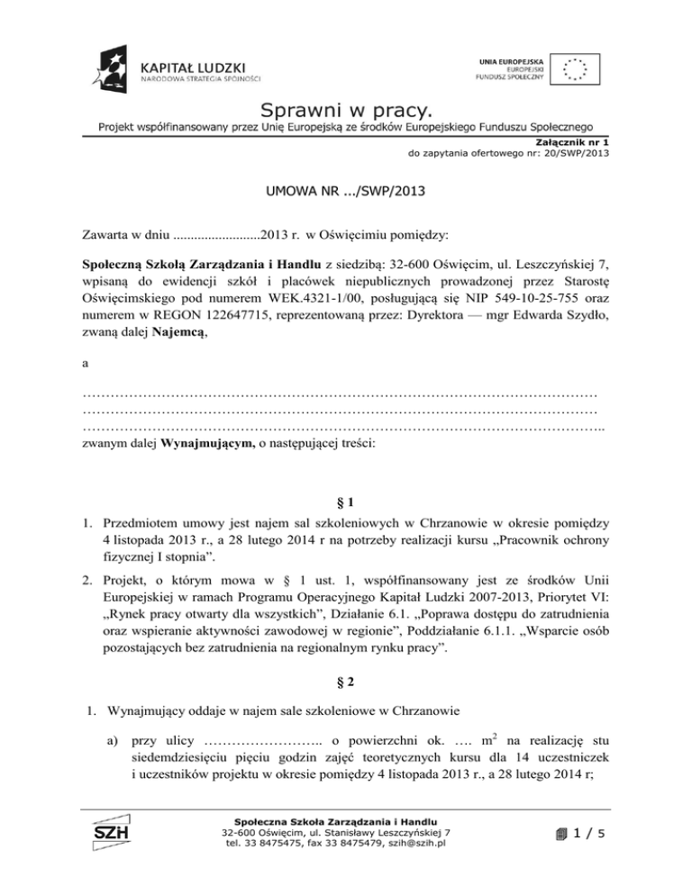 Załącznik nr 1 do zapytania ofertowego nr: 20/SWP/2013 UMOWA NR .../SWP/2013 Zawarta w dniu .........................2013 r. w Oświęcimiu pomiędzy: Społeczną Szkołą Zarządzania i Handlu z siedzibą: 32-600 Oświęcim, ul. Leszczyńskiej 7, wpisaną do ewidencji szkół i placówek niepublicznych prowadzonej przez Starostę Oświęcimskiego pod numerem WEK.4321-1/00, posługującą się NIP 549-10-25-755 oraz numerem w REGON 122647715, reprezentowaną przez: Dyrektora — mgr Edwarda Szydło, zwaną dalej Najemcą, a ………………………………………………………………………………………………… ………………………………………………………………………………………………… ………………………………………………………………………………………………….. zwanym dalej Wynajmującym, o następującej treści: §1 1. Przedmiotem umowy jest najem sal szkoleniowych w Chrzanowie w okresie pomiędzy 4 listopada 2013 r., a 28 lutego 2014 r na potrzeby realizacji kursu „Pracownik ochrony fizycznej I stopnia”. 2. Projekt, o którym mowa w § 1 ust. 1, współfinansowany jest ze środków Unii Europejskiej w ramach Programu Operacyjnego Kapitał Ludzki 2007-2013, Priorytet VI: „Rynek pracy otwarty dla wszystkich”, Działanie 6.1. „Poprawa dostępu do zatrudnienia oraz wspieranie aktywności zawodowej w regionie”, Poddziałanie 6.1.1. „Wsparcie osób pozostających bez zatrudnienia na regionalnym rynku pracy”. §2 1. Wynajmujący oddaje w najem sale szkoleniowe w Chrzanowie a) przy ulicy …………………….. o powierzchni ok. …. m2 na realizację stu siedemdziesięciu pięciu godzin zajęć teoretycznych kursu dla 14 uczestniczek i uczestników projektu w okresie pomiędzy 4 listopada 2013 r., a 28 lutego 2014 r; Społeczna Szkoła Zarządzania i Handlu 32-600 Oświęcim, ul. Stanisławy Leszczyńskiej 7 tel. 33 8475475, fax 33 8475479, [email protected] 1/5 Załącznik nr 1 do zapytania ofertowego nr: 20/SWP/2013 b) przy ulicy …………………….. o powierzchni ok. …. m2 na realizację sześćdziesięciu godzin zajęć praktycznych kursu dla 14 uczestniczek i uczestników projektu w okresie pomiędzy 4 listopada 2013 r., a 28 lutego 2014 r; 2. Wynajmujący gwarantuje, że sala szkoleniowa do realizacji zajęć teoretycznych kursu spełnia następujące warunki: a. umożliwia przeprowadzenie kursu bez zbędnych zewnętrznych czynników, rozpraszających zajęcia gwarantując tym samym komfort współpracy trenera z uczestnikami projektu; b. pomieszczenie, otoczenie pomieszczenia i wyposażenie jest czyste i estetyczne, w bardzo dobrym stanie technicznym; c. posiada stół i krzesła dla każdej uczestniczki/uczestnika projektu oraz jednego trenera; d. zapewnia odpowiednie oświetlenie: dostęp światła dziennego oraz oświetlenie umożliwiające swobodne i bezpieczne dla wzroku czytanie; e. umożliwia ustawienie i podłączenie laptopa do sieci energetycznej i do bezprzewodowego Internetu w technologii WiFi; f. umożliwia organizację przerwy obiadowej dla 12 uczestniczek/uczestników projektu i trenera oraz serwisu kawowego w sali szkoleniowej lub bezpośrednim sąsiedztwie bez konieczności wychodzenia uczestników poza budynek, w którym realizowane jest szkolenie; g. umożliwia komfortowe korzystanie uczestniczek/uczestników projektu i trenera zaplecza sanitarnego; h. umożliwia oznaczenie sal szkoleniowych materiałami promocyjnymi dostarczonymi przez Zamawiającego (plakaty) zgodnie z „Wytycznymi w zakresie oznaczania projektów w ramach Programu Operacyjnego Kapitał Ludzki”; i. zlokalizowana jest w obiekcie, do którego zapewniony jest dojazd środkami komunikacji publicznej (odległość sal szkoleniowych od najbliższego przystanku środków komunikacji publicznej nie przekracza 300 metrów); j. inne warunki określone w obowiązujących przepisach prawa. Społeczna Szkoła Zarządzania i Handlu 32-600 Oświęcim, ul. Stanisławy Leszczyńskiej 7 tel. 33 8475475, fax 33 8475479, [email protected] 2/5 Załącznik nr 1 do zapytania ofertowego nr: 20/SWP/2013 3. Wynajmujący gwarantuje, że sala szkoleniowa do realizacji zajęć praktycznych kursu spełnia następujące warunki: a. umożliwia przeprowadzenie kursu bez zbędnych zewnętrznych czynników, rozpraszających zajęcia gwarantując tym samym komfort współpracy trenera z uczestnikami projektu; b. pomieszczenie, otoczenie pomieszczenia i wyposażenie jest czyste i estetyczne, w bardzo dobrym stanie technicznym; c. umożliwia komfortowe korzystanie uczestniczek/uczestników projektu i trenera z zaplecza sanitarnego (toaleta, prysznice z ciepłą wodą); d. posiada podłogę typu parkiet; e. umożliwia oznaczenie sal szkoleniowych materiałami promocyjnymi dostarczonymi przez Zamawiającego (plakaty) zgodnie z „Wytycznymi w zakresie oznaczania projektów w ramach Programu Operacyjnego Kapitał Ludzki”; f. zlokalizowana jest w obiekcie, do którego zapewniony jest dojazd środkami komunikacji publicznej (odległość sal szkoleniowych od najbliższego przystanku środków komunikacji publicznej nie przekracza 300 metrów); g. inne warunki określone w obowiązujących przepisach prawa. 4. Szczegółowe terminy i godziny najmu sal zostaną przekazane Wynajmującemu nie później niż 3 dni przed rozpoczęciem zajęć. Najemca zastrzega sobie prawo zmiany terminów i godzin wynajmu sal. 5. Dostępność do sali zapewniona jest 30 minut przed rozpoczęciem zajęć i 30 minut po zakończeniu zajęć. 6. Najemca zobowiązuje się wykorzystywać sale szkoleniowe wyłącznie na potrzeby realizacji przedmiotu umowy. §3 1. Wynajmującemu przysługuje zryczałtowane wynagrodzenie z tytułu wykonania przedmiotu umowy, o którym mowa: a) w paragrafie 2 ust. 1 pkt. a w wysokości ….. zł brutto (słownie złotych: ………………………..………………..……..) za każdą zrealizowaną godz