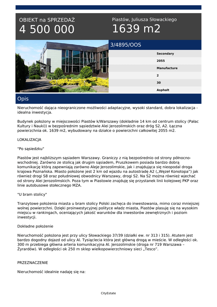 OBIEKT na SPRZEDAŻ 4 500 000 Piastów, Juliusza Słowackiego 1639 m2 3/4895/OOS Secondary 2055 Manufacture 2 30 Asphalt Opis Nieruchomość dająca nieograniczone możliwości adaptacyjne, wysoki standard, dobra lokalizacja idealna inwestycja. Budynek położony w miejscowości Piastów k/Warszawy (dokładnie 14 km od centrum stolicy (Pałac Kultury i Nauki)) w bezpośrednim sąsiedztwie Alei Jerozolimskich oraz dróg S2, A2. Łączna powierzchnia ok. 1639 m2, wybudowany na działce o powierzchni całkowitej 2055 m2. LOKALIZACJA "Po sąsiedzku" Piastów jest najbliższym sąsiadem Warszawy. Graniczy z nią bezpośrednio od strony północnowschodniej. Zarówno ze stolicą jak drugim sąsiadem, Pruszkowem posiada bardzo dobrą komunikację którą zapewniają zarówno Aleje Jerozolimskie, jak i znajdująca się nieopodal droga krajowa Poznańska. Miasto położone jest 2 km od wjazdu na autostradę A2 („Węzeł Konotopa”) jak również drogi S8 oraz południowej obwodnicy Warszawy, drogi S2. Na S2 można również wjechać od strony Alei Jerozolimskich. Poza tym w Piastowie znajduję się przystanek linii kolejowej PKP oraz linie autobusowe stołecznego MZA. "U bram stolicy" Tranzytowe położenia miasta u bram stolicy Polski zachęca do inwestowania, mimo coraz mniejszej wolnej powierzchni. Dzięki proinwestycyjnej polityce władz miasta, Piastów plasuję się na wysokim miejscu w rankingach, oceniających jakość warunków dla inwestorów zewnętrznych i poziom inwestycji. Dokładne położenie Nieruchomość położona jest przy ulicy Słowackiego 37/39 (działki ew. nr 313 i 315). Atutem jest bardzo dogodny dojazd od ulicy Al. Tysiąclecia która jest główną drogą w mieście. W odległości ok. 300 m przebiega główna arteria komunikacyjna Al. Jerozolimskie (droga nr 719 Warszawa – Żyrardów). W odległości ok 250 m sklep wielkopowierzchniowy sieci „Tesco”. PRZEZNACZENIE Nieruchomość idealnie nadaję się na: CityEstate • • • • produkcję hurtownię pomieszczenia biurowe siedzibę firmy ZAGOSPODAROWANIE BUDYNKU I TERENU Zagospodarowanie nieruchomości jest bardzo atrakcyjne charakteryzujące się efektowną architekturą. WEWNĄTRZ BUDYNKU Struktura powierzchniowa budynku: - Parter - powierzchnia biurowo - socjalna + otwarta hala (open space) o pow. ok. 480 m2 i przybliżonych wymiarach 11m x 40m - I Piętro - powierzchnia biurowo - socjalna + otwarta hala (open space) o pow. ok. 530 m2 i przybliżonych wymiarach 11m x 41m Posadzka zmywalna, wyłożona gresem. ZEWNĄTRZ BUDYNKU Teren działek zabudowany jest budynkiem biurowo – produkcyjnym. Ogrodzony elementami stalowymi – cokoły, słupy ogrodzeniowe murowane okładane płytkami ceramicznymi. Bramy stalowe przesuwne z napędem elektrycznym. Na terenie niezabudowanym działek urządzono ciągi komunikacyjne, place postojowe i manewrowe utwardzone betonową kostką brukową. Rozładunek możliwy poprzez: - 2 bramy z poziomu "0" - 1 winda towarowa Miejsca parkingowe na około 30 samochodów, place manewrowe i składowe (wjazd na teren nieruchomości - brama samonośna z automatem). Odwodnienie powierzchni parkingowej w systemie kratek liniowych połączonych rurociągami z kanalizacją deszczową ogólnospławną w ulicy Słowackiego. Wzdłuż ogrodzenia usytuowany został pas zieleni. Elementy zieleni znajdziemy również przed budynkiem, bardzo estetycznie zaprojektowane i zagospodarowane. Cały teren oświetlony lampami ozdobnymi. Dozór zewnętrzny terenu poprzez system kamer przemysłowych połączonych z centrum monitoringu zlokalizowanym w budynku. DANE TECHNICZNE Budynek biurowo – produkcyjny Powierzchnia zabudowy - 912 m2 Powierzchnia użytkowa -1639 m2 Budynek wybudowany w technologii żelbetowo/murowanej DANE KONSTRUKCYJNO – MATERIAŁOWE • Ławy i stropy fundamentowe – żelbetowe wylewane • Fundamenty – betonowe wylewane, izolowane CityEstate • Ściany zewnętrzne warstwowe – murowane z pustaków ceramicznych typu MAX z izolacją termiczną między warstwową ze styropianu • Ściany działowe murowane z cegły ceramicznej i bloczków gazobetonowych • Podłoża pod posadzki – betonowe, izolacja przeciwwilgociowa i termiczna • Na podłogach położony gres i terakota • Nadproża podciągi żelbetowe • Schody wewnętrzne płytowe, wylewane okładane płytkami ceramicznymi • Tynki wewnętrzne – gładzone masą gipsową, częściowo okładane płytkami ceramicznymi glazurowanymi oraz kamieniem naturalnym • Stropy nad parterem z płyt prefabrykowanych kanałowych, ocieplenie wełną mineralną, pokrycie papa bitumiczna • Stropodach z płyt prefabrykowanych kanałowych, ocieplenie wełną mineralną, pokrycie papą bitumiczną termozgrzewalną • Elewacja okładana płytami ceramicznymi szlifowanymi, kamieniem naturalnym i szkłem elewacyjnym, detale wykończone z blach powlekanych ze stali szlachetnej polerowanej • Stolarka okienna zespolona dwu szynowa, antywłamaniowa, nisko emisyjna • Stolarka drzwiowa aluminiowa i drewniana • Podłogi i posadzki – terakota • WC i sanitariaty – pełen biały montaż • Ślusarka ze stali szlachetnej polerowanej INSTALACJE Budynek wyposażony jest w następujące instalacje: • • • • • • • • kanalizacyjna – MIEJSKA wodna z ujęcia własnego ze stacją uzdatniania wody + instalacja hydrantowa wewnętrzna gazowa - miejska elektryczną (energia 75kW) centralnego ogrzewania monitoring zewnętrzny (8 kamer), instalacja alarmowa telefoniczna z wewnętrzną centralą 16 numerową Tv i łączności satelitarnej Nieruchomość daje w zasadzie nieograniczone możliwości adaptacji, idealnie nadaję się na produkcje, hurtownie, sklep z dużymi powierzchniami ekspozycyjnymi lub pomieszczenia biurowe. Dzięki wysokiemu standardowi spełnia wysokie wymagania. Na podstawie opinii rzeczoznawcy wartość rynkową nieruchomości oszacowano na ponad 11 000 000 zł. Czy to właśnie dla Ciebie zlokalizowaliśmy mie