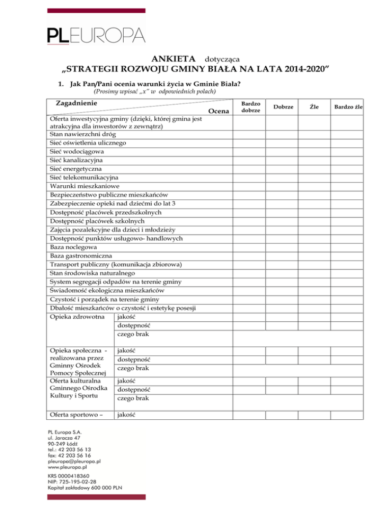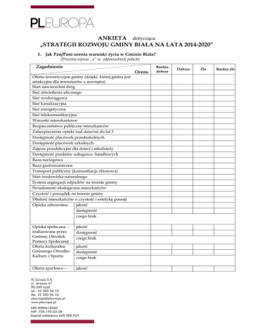 ANKIETA dotycząca „STRATEGII ROZWOJU GMINY BIAŁA NA LATA 2014-2020” 1. Jak Pan/Pani ocenia warunki życia w Gminie Biała? (Prosimy wpisać „x” w odpowiednich polach) Zagadnienie Ocena Oferta inwestycyjna gminy (dzięki, której gmina jest atrakcyjna dla inwestorów z zewnątrz) Stan nawierzchni dróg Sieć oświetlenia ulicznego Sieć wodociągowa Sieć kanalizacyjna Sieć energetyczna Sieć telekomunikacyjna Warunki mieszkaniowe Bezpieczeństwo publiczne mieszkańców Zabezpieczenie opieki nad dziećmi do lat 3 Dostępność placówek przedszkolnych Dostępność placówek szkolnych Zajęcia pozalekcyjne dla dzieci i młodzieży Dostępność punktów usługowo- handlowych Baza noclegowa Baza gastronomiczna Transport publiczny (komunikacja zbiorowa) Stan środowiska naturalnego System segregacji odpadów na terenie gminy Świadomość ekologiczna mieszkańców Czystość i porządek na terenie gminy Dbałość mieszkańców o czystość i estetykę posesji Opieka zdrowotna jakość dostępność czego brak Opieka społeczna realizowana przez Gminny Ośrodek Pomocy Społecznej Oferta kulturalna Gminnego Ośrodka Kultury i Sportu jakość dostępność czego brak Oferta sportowo – jakość jakość dostępność czego brak Bardzo dobrze Dobrze Źle Bardzo źle rekreacyjna dostępność czego brak Organizacja przestrzeni publicznej (parki, place zabaw) Stopień integracji społeczności lokalnej Funkcjonowanie stowarzyszeń, KGW na terenie gminy Działalność i wyposażenie OSP na terenie gminy Dostęp do Internetu Dostęp do e- administracji Stopa życiowa mieszkańców gminy Rynek pracy (możliwość znalezienia pracy na terenie gminy) Warunki do prowadzenia działalności gospodarczej (ulgi dla przedsiębiorców, preferencje, dostęp do informacji o pozyskaniu środków na otworzenie lub rozwój działalności gospodarczej) Oferta turystyczna gminy Promocja i wizerunek gminy Uwagi/ komentarze : ....................................................... 2. Jak Pan/Pani ocenia realizacje niżej wskazanych przedsięwzięć na terenie Gminy Biała w perspektywie lat 2014 - 2020. (Prosimy wstawić „x” w odpowiednich polach, w przypadku gdy przedsięwzięcie nie dotyczy Gminy wpisać „Nd”) Przedsięwzięcia Ocena Wspieranie rozwoju małej i średniej przedsiębiorczości Zwiększenie bezpieczeństwa publicznego mieszkańców Zabezpieczenie opieki nad dziećmi do lat 3 Poprawa infrastruktury drogowej (remonty i budowa dróg) Oświetlenie uliczne Budowa Chodniki i ścieżki rowerowe infrastruktury Parkingi okołodrogowej Wiaty przystankowe Rozbudowa i modernizacja sieci wodociągowej Rozbudowa i modernizacja sieci kanalizacyjnej Modernizacja oczyszczalni ścieków Budowa przydomowych oczyszczalni ścieków Budowa sieci gazowej Wydzielanie i uzbrajanie terenów inwestycyjnych Uzbrajanie terenów pod budownictwo mieszkaniowe Zwiększenie dostępności opieki zdrowotnej Zwiększanie pomocy socjalnej dla najuboższych Bardzo ważne Ważne Nieważne Zbędne Szersze wspieranie działań kulturalnych i artystycznych Szersze wspieranie działań promujących gminę Budowa, rozbudowa obiektów sportowo-rekreacyjnych Budowa i modernizacja budynków użyteczności publicznej (świetlic, ośrodków zdrowia, domów kultury, szkół itp.) Rewitalizacja i renowacja zabytków gminy Termomodernizacja budynków użyteczności publicznej Promocja i wsparcie korzystania z odnawialnych źródeł energii Dalsze działania w zakresie selekcji, wykorzystywania i zagospodarowania odpadów Zwiększenia świadomości ekologicznej mieszkańców Poprawa estetyki gminy (np. nowe tereny zielone, rewitalizacja przestrzeni (skwerów, placów, targowiska itp.) Zwiększenie wsparcia aktywności społecznej i kulturalnej mieszkańców Promocja w dziedzinie turystyki Inne działania: (wymień) ……………………………………… 3. Proszę wymienić 5 priorytetowych inwestycji, które Pani/Pana zdaniem należy zrealizować na terenie gminy Biała w latach 2014 - 2020: 1.………………………………………………………………………………………………………………………………………………… 2.………………………………………………………………………………………………………………………………………………… 3.………………………………………………………………………………………………………………………………………………… 4.………………………………………………………………………………………………………………………………………………… 5.………………………………………………………………………………………………………………………………………………… Co w Pani/ Pana miejscowości (sołectwie) trzeba zrobić w pierwszej kolejności, w najbliższych latach? (prosimy wskazać miejscowość (sołectwo) oraz wymienić maksymalnie 3 inwestycje). 1………………………………………………………………………………………………………….……………………… 2………………………………………………………………………………………………………….……………………… 3………………………………………………………………………………………………………….……………………… 4. Czy Pani /Pana zdaniem inwestycje przeprowadzone do tej pory na terenie gminy? □ są wystarczające □ są przydatne, ale niewystarczające □ są mało przydatne □ nie są przydatne 5. Czy uczestniczy Pani/ Pan w wydarzeniach kulturalnych na terenie gminy Biała? □ □ Często Bardzo często Jeśli tak to w jakich? Jeśli nie to dlaczego? □ Rzadko □ Nigdy ……………………………………………………………………………………………………