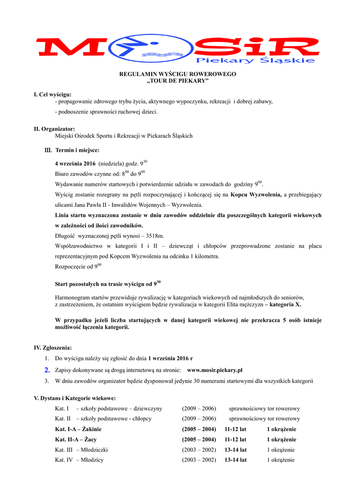 REGULAMIN WYŚCIGU ROWEROWEGO „TOUR DE PIEKARY” I. Cel wyścigu: - propagowanie zdrowego trybu życia, aktywnego wypoczynku, rekreacji i dobrej zabawy, - podnoszenie sprawności ruchowej dzieci. II. Organizator: Miejski Ośrodek Sportu i Rekreacji w Piekarach Śląskich Termin i miejsce: 4 września 2016 (niedziela) godz. 930 Biuro zawodów czynne od: 800 do 900 Wydawanie numerów startowych i potwierdzenie udziału w zawodach do godziny 900. Wyścig zostanie rozegrany na pętli rozpoczynającej i kończącej się na Kopcu Wyzwolenia, a przebiegający ulicami Jana Pawła II - Inwalidów Wojennych – Wyzwolenia. Linia startu wyznaczona zostanie w dniu zawodów oddzielnie dla poszczególnych kategorii wiekowych w zależności od ilości zawodników. Długość wyznaczonej pętli wynosi – 3518m. Współzawodnictwo w kategorii I i II – dziewcząt i chłopców przeprowadzone zostanie na placu reprezentacyjnym pod Kopcem Wyzwolenia na odcinku 1 kilometra. Rozpoczęcie od 900 Start pozostałych na trasie wyścigu od 930 Harmonogram startów przewiduje rywalizację w kategoriach wiekowych od najmłodszych do seniorów, z zastrzeżeniem, że ostatnim wyścigiem będzie rywalizacja w kategorii Elita mężczyzn – kategoria X. W przypadku jeżeli liczba startujących w danej kategorii wiekowej nie przekracza 5 osób istnieje możliwość łączenia kategorii. IV. Zgłoszenia: Do wyścigu należy się zgłosić do dnia 1 września 2016 r Zapisy dokonywane są drogą internetową na stronie: www.mosir.piekary.pl W dniu zawodów organizator będzie dysponował jedynie 30 numerami startowymi dla wszystkich kategorii V. Dystans i Kategorie wiekowe: (2009 – 2006) sprawnościowy tor rowerowy Kat. II – szkoły podstawowe - chłopcy (2009 – 2006) sprawnościowy tor rowerowy Kat. I-A – Żakinie (2005 – 2004) 11-12 lat 1 okrążenie Kat. II-A – Żacy (2005 – 2004) 11-12 lat 1 okrążenie Kat. III – Młodziczki (2003 – 2002) 13-14 lat 1 okrążenie Kat. IV – Młodzicy (2003 – 2002) 13-14 lat 1 okrążenie Kat. I – szkoły podstawowe – dziewczyny Kat. V – Juniorki Młodsze (2001 – 2000) 15-16 lat 2 okrążenia Kat. VI – Juniorzy Młodsi (2001 – 2000) 15-16 lat 2 okrążenia Kat. VII – Juniorki (1999 – 1998) 17-18 lat 3 okrążenia Kat. VIII – Juniorzy (1999 – 1998) 17-18 lat 3 okrążenia Kat. IX – Elita kobiety (1997 – 1987) 19-29 lat 4 okrążenia Kat. X – Elita mężczyźni (1997 – 1987) 19-29 lat 6 okrążeń Kat. XI – Masters I – kobiety (1986 – 1977) 30-39 lat 3 okrążenia Kat. XII – Masters I – mężczyźni (1986 – 1977) 30-39 lat 6 okrążeń Kat. XIII – Masters II – kobiety (1976 i więcej) 40 + 3 okrążenia Kat. XIV – Masters II – mężczyźni (1976 – 1967) 40-49 lat 6 okrążeń Kat. XV – Masters III – mężczyźni (1966 – 1957) 50-59 lat 3 okrążenia Kat. XVI – Masters IV – mężczyźni (1956 i starsi) 60 + 3 okrążenia Kat. XVII – Juniorki – rowery górskie do lat 18 2 okrążenia Kat. XVIII – Juniorzy – rowery górskie do lat 18 2 okrążenia Kat. XIX – kobiety – rowery górskie powyżej 19 lat 2 okrążenia Kat. XX – mężczyźni – rowery górskie powyżej 19 lat 3 okrążenia W kategoriach Elita i Masters zawody rozgrywane będą w formule XC, po zakończeniu wyścigu przez pierwszego zawodnika pozostali zobowiązani są do zakończenia udziału. W przypadku jeżeli liczba startujących w danej kategorii wiekowej nie przekracza 5 osób istnieje możliwość łączenia kategorii. VI. Pomiar czasu Czas wyścigów mierzony będzie elektronicznie przy użyciu chipów. Numer startowy zawodnik zobowiązany jest umieścić na kierownicy, tak aby był czytelny dla sędziego. Oficjalnym czasem wyścigu jest czas BRUTTO. VII. Klasyfikacja końcowa: Uczestnicy sklasyfikowani zostaną w poszczególnych kategoriach zgodnie z uzyskanymi czasami, we wszystkich kategoriach z podziałem na kobiety i mężczyzn Kategoria R - Kategoria rodzinna (rodzic + dziecko szkoła podstawowa klasy V – VI) – do klasyfikacji zaliczany będzie łączny wynik z pierwszych okrążeń z własnych wyścigów dziecka i rodzica. Zgłoszenia do kategorii rodzinnej przy odebraniu numerów w biurze zawodów VIII. Uczestnictwo: 1. Zawody są ogólnodostępne, udział mogą brać wszyscy chętni niezależnie od wieku 2. Podstawowym warunkiem uczestnictwa jest posiadanie roweru i sztywnego kasku 3. Uczestnicy zobowiązani są do przedstawienia zaświadczenia lekarskiego lub własnoręcznie podpisanego oświadczenia o zdolności do udziału w zawodach 4. W przypadku osób niepełnoletnich wymagana jest zgoda rodziców lub opiekunów prawnych do udziału oraz obowiązek posiadania sztywnego kasku . 5.Pełną odpowiedzialność za dzieci uczestniczące w wyścigu ponoszą rodzice lub opiekunowie prawni, którzy podpisują zgodę, 6. Uczestnik wyraża zgodę na przetwarzanie danych osobowych dla potrzeb organizowanych zawodów oraz rozpowszechnienie swojego wizerunku na informacyjnych materiałach filmowych oraz zdjęciowych. IX. Nagrody: Organizator przewiduje wyróżnienia dla najlepszych w danych kategoriach. X. Postanowienia końcowe: 1. Uczestnicy ubezpieczeni zostaną przez organizatora w zakresie NNW 2. Wszyscy uczestnicy zobowiązani są o dotarcie na miejsce startu do godz. 930, od godz. 900 trasa wyścigu zostanie zamknięta aż do godz. 14 00 i wyłączona dla wszelkiego ruchu 3. Uczestników wyścigu zapraszamy ze swoimi rowerami, 4. Za wypadki organizator nie ponosi odpowiedzialności, 5.Organizator zastrzega sobie prawo do interpretacji regulaminu, a także do podejmowania decyzji w sprawach spornych lub nieujętych w regulaminie.