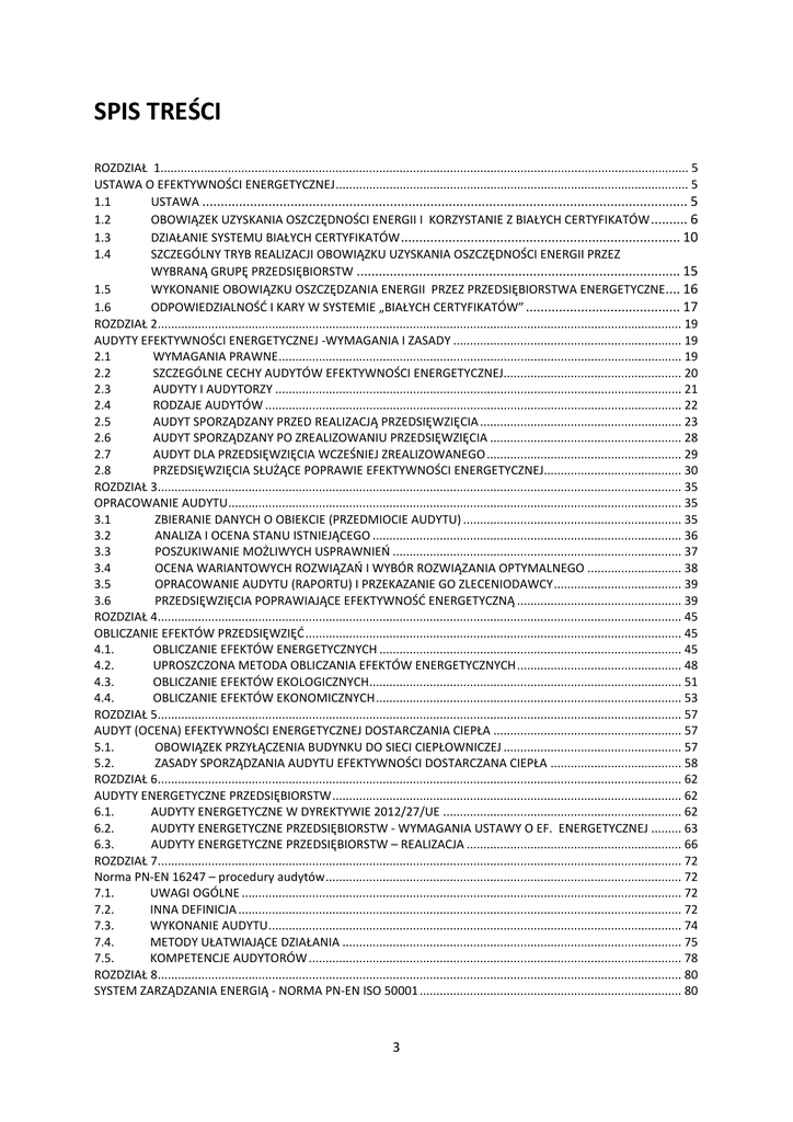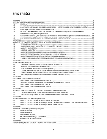 SPIS TREŚCI ROZDZIAŁ 1............................................................................................................................................................. 5 USTAWA O EFEKTYWNOŚCI ENERGETYCZNEJ ......................................................................................................... 5 1.1 USTAWA .................................................................................................................................... 5 1.2 OBOWIĄZEK UZYSKANIA OSZCZĘDNOŚCI ENERGII I KORZYSTANIE Z BIAŁYCH CERTYFIKATÓW .......... 6 1.3 DZIAŁANIE SYSTEMU BIAŁYCH CERTYFIKATÓW ............................................................................ 10 1.4 SZCZEGÓLNY TRYB REALIZACJI OBOWIĄZKU UZYSKANIA OSZCZĘDNOŚCI ENERGII PRZEZ WYBRANĄ GRUPĘ PRZEDSIĘBIORSTW ........................................................................................ 15 1.5 WYKONANIE OBOWIĄZKU OSZCZĘDZANIA ENERGII PRZEZ PRZEDSIĘBIORSTWA ENERGETYCZNE.... 16 1.6 ODPOWIEDZIALNOŚĆ I KARY W SYSTEMIE „BIAŁYCH CERTYFIKATÓW” .......................................... 17 ROZDZIAŁ 2............................................................................................................................................................ 19 AUDYTY EFEKTYWNOŚCI ENERGETYCZNEJ -WYMAGANIA I ZASADY .................................................................... 19 2.1 WYMAGANIA PRAWNE ........................................................................................................................ 19 2.2 SZCZEGÓLNE CECHY AUDYTÓW EFEKTYWNOŚCI ENERGETYCZNEJ..................................................... 20 2.3 AUDYTY I AUDYTORZY ......................................................................................................................... 21 2.4 RODZAJE AUDYTÓW ............................................................................................................................ 22 2.5 AUDYT SPORZĄDZANY PRZED REALIZACJĄ PRZEDSIĘWZIĘCIA ............................................................ 23 2.6 AUDYT SPORZĄDZANY PO ZREALIZOWANIU PRZEDSIĘWZIĘCIA ......................................................... 28 2.7 AUDYT DLA PRZEDSIĘWZIĘCIA WCZEŚNIEJ ZREALIZOWANEGO .......................................................... 29 2.8 PRZEDSIĘWZIĘCIA SŁUŻĄCE POPRAWIE EFEKTYWNOŚCI ENERGETYCZNEJ......................................... 30 ROZDZIAŁ 3............................................................................................................................................................ 35 OPRACOWANIE AUDYTU ....................................................................................................................................... 35 3.1 ZBIERANIE DANYCH O OBIEKCIE (PRZEDMIOCIE AUDYTU) ................................................................. 35 3.2 ANALIZA I OCENA STANU ISTNIEJĄCEGO ............................................................................................ 36 3.3 POSZUKIWANIE MOŻLIWYCH USPRAWNIEŃ ...................................................................................... 37 3.4 OCENA WARIANTOWYCH ROZWIĄZAŃ I WYBÓR ROZWIĄZANIA OPTYMALNEGO ............................ 38 3.5 OPRACOWANIE AUDYTU (RAPORTU) I PRZEKAZANIE GO ZLECENIODAWCY ...................................... 39 3.6 PRZEDSIĘWZIĘCIA POPRAWIAJĄCE EFEKTYWNOŚĆ ENERGETYCZNĄ ................................................. 39 ROZDZIAŁ 4............................................................................................................................................................ 45 OBLICZANIE EFEKTÓW PRZEDSIĘWZIĘĆ ................................................................................................................ 45 4.1. OBLICZANIE EFEKTÓW ENERGETYCZNYCH .......................................................................................... 45 4.2. UPROSZCZONA METODA OBLICZANIA EFEKTÓW ENERGETYCZNYCH ................................................. 48 4.3. OBLICZANIE EFEKTÓW EKOLOGICZNYCH............................................................................................. 51 4.4. OBLICZANIE EFEKTÓW EKONOMICZNYCH ........................................................................................... 53 ROZDZIAŁ 5............................................................................................................................................................ 57 AUDYT (OCENA) EFEKTYWNOŚCI ENERGETYCZNEJ DOSTARCZANIA CIEPŁA ........................................................ 57 5.1. OBOWIĄZEK PRZYŁĄCZENIA BUDYNKU DO SIECI CIEPŁOWNICZEJ ..................................................... 57 5.2. ZASADY SPORZĄDZANIA AUDYTU EFEKTYWNOŚCI DOSTARCZANA CIEPŁA ....................................... 58 ROZDZIAŁ 6............................................................................................................................................................ 62 AUDYTY ENERGETYCZNE PRZEDSIĘBIORSTW ........................................................................................................ 62 6.1. AUDYTY ENERGETYCZNE W DYREKTYWIE 2012/27/UE ....................................................................... 62 6.2. AUDYTY ENERGETYCZNE PRZEDSIĘBIORSTW - WYMAGANIA USTAWY O EF. ENERGETYCZNEJ ......... 63 6.3. AUDYTY ENERGETYCZNE PRZEDSIĘBIORSTW – REALIZACJA ................................................................ 66 ROZDZIAŁ 7............................................................................................................................................................ 72 Norma PN-EN 16247 – procedury audytów .......................................................................................................... 72 7.1. UWAGI OGÓLNE ................................................................................................................................... 72 7.2. INNA DEFIN