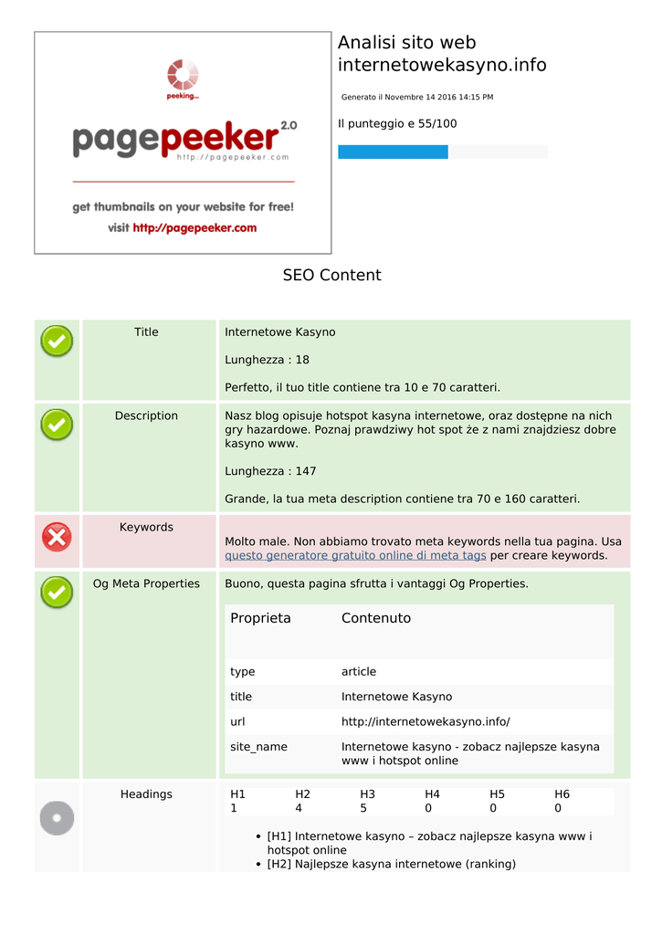 Analisi sito web internetowekasyno.info Generato il Novembre 14 2016 14:15 PM Il punteggio e 55/100 SEO Content Title Internetowe Kasyno Lunghezza : 18 Perfetto, il tuo title contiene tra 10 e 70 caratteri. Description Nasz blog opisuje hotspot kasyna internetowe, oraz dostępne na nich gry hazardowe. Poznaj prawdziwy hot spot że z nami znajdziesz dobre kasyno www. Lunghezza : 147 Grande, la tua meta description contiene tra 70 e 160 caratteri. Keywords Molto male. Non abbiamo trovato meta keywords nella tua pagina. Usa questo generatore gratuito online di meta tags per creare keywords. Og Meta Properties Headings Buono, questa pagina sfrutta i vantaggi Og Properties. Proprieta Contenuto type article title Internetowe Kasyno url http://internetowekasyno.info/ site_name Internetowe kasyno - zobacz najlepsze kasyna www i hotspot online H1 1 H2 4 H3 5 H4 0 H5 0 H6 0 [H1] Internetowe kasyno – zobacz najlepsze kasyna www i hotspot online [H2] Najlepsze kasyna internetowe (ranking) SEO Content [H2] [H2] [H2] [H3] [H3] [H3] [H3] [H3] Images Ciekawe strony o kasynach Kategorie Najnowsze wpisy Zalety hot spot kasyna online Wymagany obrót bonusem Popularność kasyn online Klasyczne kasyno i hot spot gry Jak zacząć zarabiać w kasynie Abbiamo trovato 25 immagini in questa pagina web. 14 attributi alt sono vuoti o mancanti. Aggiungi testo alternativo in modo tale che i motori di ricerca possano comprendere meglio il contenuto delle tue immagini. Text/HTML Ratio Ratio : 11% Il rapporto testo/codice HTML di questa pagina e inferiore a 15 percento, questo significa che il tuo sito web necessita probabilmente di molto piu contenuto. Flash Iframe Perfetto, non e stato rilevato contenuto Flash in questa pagina. Grande, non sono stati rilevati Iframes in questa pagina. SEO Links URL Rewrite Buono. I tuoi links appaiono friendly! Underscores in the URLs Perfetto! Non sono stati rilevati underscores nei tuoi URLs. In-page links Abbiamo trovato un totale di 13 links inclusi 0 link(s) a files Statistics External Links : noFollow 0% External Links : Passing Juice 23.08% Internal Links 76.92% In-page links Anchor Type Juice Internetowe Kasyno Interno Passing Juice Zobaczyliśmy kasynointernetowe.com – zobacz i Ty Interno Passing Juice gry hazardowe Externo Passing Juice kasyno bez depozytu Externo Passing Juice kasyno Externo Passing Juice Bonusy kasynowe Interno Passing Juice Kasyno Interno Passing Juice Zalety hot spot kasyna online Interno Passing Juice Wymagany obrót bonusem Interno Passing Juice Popularność kasyn online Interno Passing Juice Klasyczne kasyno i hot spot gry Interno Passing Juice Jak zacząć zarabiać w kasynie Interno Passing Juice Internetowe kasyno – zobacz najlepsze kasyna www i hotspot online Interno Passing Juice SEO Keywords Keywords Cloud stopień online kasyn hot kasyno zadowolenia zacząć nie jak internetowe Consistenza Keywords Keyword Contenuto kasyno 6 zadowolenia 5 stopień 5 online 5 jak 4 Title Keywords Description Headings Usabilita Url Dominio : internetowekasyno.info Lunghezza : 22 Favicon Grande, il tuo sito usa una favicon. Stampabilita Non abbiamo riscontrato codice CSS Print-Friendly. Lingua Buono. La tua lingua dichiarata pl. Dublin Core Questa pagina non sfrutta i vantaggi di Dublin Core. Documento Doctype XHTML 1.0 Transitional Encoding Perfetto. Hai dichiarato che il tuo charset e UTF-8. Validita W3C Errori : 100 Avvisi : 5 Email Privacy Grande. Nessun indirizzo mail e stato trovato in plain text! Deprecated HTML Deprecated tags Occorrenze <center> 6 <font> 3 Tags HTML deprecati sono tags HTML che non vengono piu utilizzati. Ti raccomandiamo di rimuoverli o sostituire questi tags HTML perche ora sono obsoleti. Suggerimenti per velocizzare Eccellente, il tuo sito web non utilizza nested tables. Molto male, il tuo sito web utilizza stili CSS inline. Grande, il tuo sito web ha pochi file CSS. Perfetto, il tuo sito web ha pochi file JavaScript. Documento Peccato, il vostro sito non approfitta di gzip. Mobile Mobile Optimization Apple Icon Meta Viewport Tag Flash content Ottimizzazione XML Sitemap Grande, il vostro sito ha una sitemap XML. http://internetowekasyno.info/sitemap.xml http://internetowekasyno.info/sitemapindex.xml Robots.txt http://internetowekasyno.info/robots.txt Grande, il vostro sito ha un file robots.txt. Analytics Non trovato Non abbiamo rilevato uno strumento di analisi installato su questo sito web. Web analytics consentono di misurare l'attività dei visitatori sul tuo sito web. Si dovrebbe avere installato almeno un strumento di analisi, ma può anche essere buona per installare una seconda, al fine di un controllo incrociato dei dati. Powered by TCPDF (www.tcpdf.org)