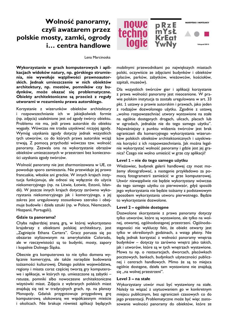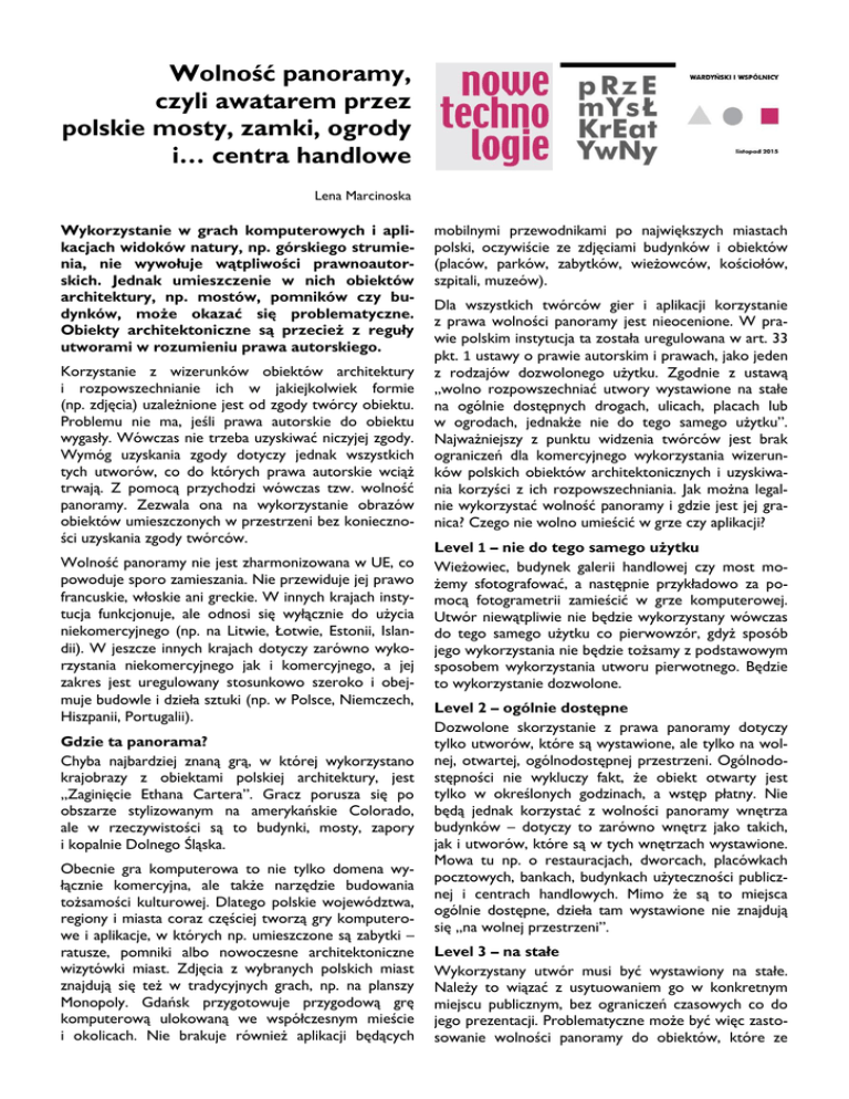 Wolność panoramy, czyli awatarem przez polskie mosty, zamki, ogrody i… centra handlowe Lena Marcinoska Wykorzystanie w grach komputerowych i aplikacjach widoków natury, np. górskiego strumienia, nie wywołuje wątpliwości prawnoautorskich. Jednak umieszczenie w nich obiektów architektury, np. mostów, pomników czy budynków, może okazać się problematyczne. Obiekty architektoniczne są przecież z reguły utworami w rozumieniu prawa autorskiego. Korzystanie z wizerunków obiektów architektury i rozpowszechnianie ich w jakiejkolwiek formie (np. zdjęcia) uzależnione jest od zgody twórcy obiektu. Problemu nie ma, jeśli prawa autorskie do obiektu wygasły. Wówczas nie trzeba uzyskiwać niczyjej zgody. Wymóg uzyskania zgody dotyczy jednak wszystkich tych utworów, co do których prawa autorskie wciąż trwają. Z pomocą przychodzi wówczas tzw. wolność panoramy. Zezwala ona na wykorzystanie obrazów obiektów umieszczonych w przestrzeni bez konieczności uzyskania zgody twórców. Wolność panoramy nie jest zharmonizowana w UE, co powoduje sporo zamieszania. Nie przewiduje jej prawo francuskie, włoskie ani greckie. W innych krajach instytucja funkcjonuje, ale odnosi się wyłącznie do użycia niekomercyjnego (np. na Litwie, Łotwie, Estonii, Islandii). W jeszcze innych krajach dotyczy zarówno wykorzystania niekomercyjnego jak i komercyjnego, a jej zakres jest uregulowany stosunkowo szeroko i obejmuje budowle i dzieła sztuki (np. w Polsce, Niemczech, Hiszpanii, Portugalii). Gdzie ta panorama? Chyba najbardziej znaną grą, w której wykorzystano krajobrazy z obiektami polskiej architektury, jest „Zaginięcie Ethana Cartera”. Gracz porusza się po obszarze stylizowanym na amerykańskie Colorado, ale w rzeczywistości są to budynki, mosty, zapory i kopalnie Dolnego Śląska. Obecnie gra komputerowa to nie tylko domena wyłącznie komercyjna, ale także narzędzie budowania tożsamości kulturowej. Dlatego polskie województwa, regiony i miasta coraz częściej tworzą gry komputerowe i aplikacje, w których np. umieszczone są zabytki – ratusze, pomniki albo nowoczesne architektoniczne wizytówki miast. Zdjęcia z wybranych polskich miast znajdują się też w tradycyjnych grach, np. na planszy Monopoly. Gdańsk przygotowuje przygodową grę komputerową ulokowaną we współczesnym mieście i okolicach. Nie brakuje również aplikacji będących mobilnymi przewodnikami po największych miastach polski, oczywiście ze zdjęciami budynków i obiektów (placów, parków, zabytków, wieżowców, kościołów, szpitali, muzeów). Dla wszystkich twórców gier i aplikacji korzystanie z prawa wolności panoramy jest nieocenione. W prawie polskim instytucja ta została uregulowana w art. 33 pkt. 1 ustawy o prawie autorskim i prawach, jako jeden z rodzajów dozwolonego użytku. Zgodnie z ustawą „wolno rozpowszechniać utwory wystawione na stałe na ogólnie dostępnych drogach, ulicach, placach lub w ogrodach, jednakże nie do tego samego użytku”. Najważniejszy z punktu widzenia twórców jest brak ograniczeń dla komercyjnego wykorzystania wizerunków polskich obiektów architektonicznych i uzyskiwania korzyści z ich rozpowszechniania. Jak można legalnie wykorzystać wolność panoramy i gdzie jest jej granica? Czego nie wolno umieścić w grze czy aplikacji? Level 1 – nie do tego samego użytku Wieżowiec, budynek galerii handlowej czy most możemy sfotografować, a następnie przykładowo za pomocą fotogrametrii zamieścić w grze komputerowej. Utwór niewątpliwie nie będzie wykorzystany wówczas do tego samego użytku co pierwowzór, gdyż sposób jego wykorzystania nie będzie tożsamy z podstawowym sposobem wykorzystania utworu pierwotnego. Będzie to wykorzystanie dozwolone. Level 2 – ogólnie dostępne Dozwolone skorzystanie z prawa panoramy dotyczy tylko utworów, które są wystawione, ale tylko na wolnej, otwartej, ogólnodostępnej przestrzeni. Ogólnodostępności nie wykluczy fakt, że obiekt otwarty jest tylko w określonych godzinach, a wstęp płatny. Nie będą jednak korzystać z wolności panoramy wnętrza budynków – dotyczy to zarówno wnętrz jako takich, jak i utworów, które są w tych wnętrzach wystawione. Mowa tu np. o restauracjach, dworcach, placówkach pocztowych, bankach, budynkach użyteczności publicznej i centrach handlowych. Mimo że są to miejsca ogólnie dostępne, dzieła tam wystawione nie znajdują się „na wolnej przestrzeni”. Level 3 – na stałe Wykorzystany utwór musi być wystawiony na stałe. Należy to wiązać z usytuowaniem go w konkretnym miejscu publicznym, bez ograniczeń czasowych co do jego prezentacji. Problematyczne może być więc zastosowanie wolności panoramy do obiektów, które ze względu na użyte tworzywo cechują się „krótką żywotnością” – budowli z lodu, z piasku, a także graffiti umieszczonego na budynkach, murach czy mostach, choć zwłaszcza w tym ostatnim przypadku stanowiska mogą być różne. Witryny sklepowe z racji niestałości nie będą mogły zostać wykorzystane w ramach prawa panoramy. Level 4 – na drogach, ulicach, placach lub w ogrodach Dość niefortunny przyimek „na” drogach, ulicach, placach lub w ogrodach nie powinien zniechęcać do korzystania z prawa wolności panoramy. Sformułowanie to należy rozumieć w ten sposób, że wolność panoramy dotyczy obiektów ulokowanych przy ww. miejscach i nie ma nic wspólnego z perspektywą, z której są widziane. Dlatego nie ma przeszkód, żeby obiekty te były sfotografowane z lotu ptaka, z tarasu widokowego lub innej dowolnej perspektywy. Level 5 – dodatki Innego rodzaju problemy mogą powstać, gdy np. gra ma toczyć się w nocy, a chcemy wykorzystać w niej zdjęcia budynku z instalacją świetlną. Trzeba pamiętać, że oświetlenie może korzystać z ochrony jako samodzielny utwór. Nie będzie on jednak już objęty wolnością panoramy. Wobec tego o ile wykorzystanie w grze zdjęcia