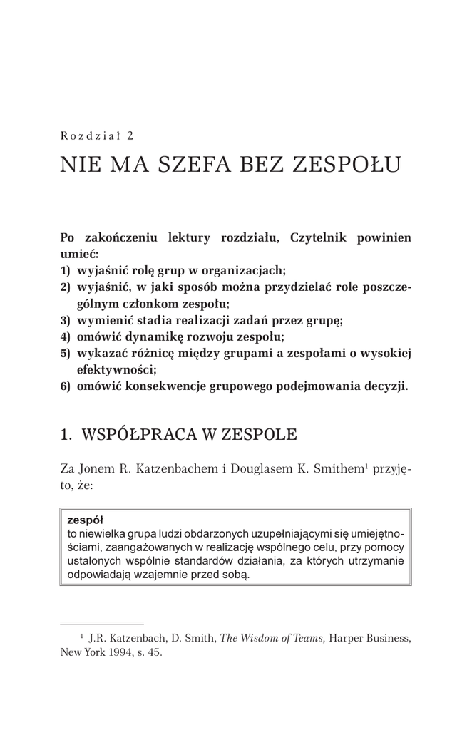 Rozdział 2 Nie ma szefa bez zespołu Po zakończeniu lektury rozdziału, Czytelnik powinien umieć: 1) wyjaśnić rolę grup w organizacjach; 2) wyjaśnić, w jaki sposób można przydzielać role poszczególnym członkom zespołu; 3) wymienić stadia realizacji zadań przez grupę; 4) omówić dynamikę rozwoju zespołu; 5) wykazać różnicę między grupami a zespołami o wysokiej efektywności; 6) omówić konsekwencje grupowego podejmowania decyzji. 1. Współpraca w zespole Za Jonem R. Katzenbachem i Douglasem K. Smithem1 przyjęto, że: zespół to niewielka grupa ludzi obdarzonych uzupełniającymi się umiejętnościami, zaangażowanych w realizację wspólnego celu, przy pomocy ustalonych wspólnie standardów działania, za których utrzymanie odpowiadają wzajemnie przed sobą. 1 J.R. Katzenbach, D. Smith, The Wisdom of Teams, Harper Business, New York 1994, s. 45. 78 Człowiek w firmie …bez obaw i z ochotą Katzenbach i Smith dokonują wyraźnego rozróżnienia między zespołami a grupami roboczymi. Ponadto dzielą zespoły, biorąc pod uwagę gradację ich efektywności: 1. GRUPA ROBOCZA – nie ma wspólnego celu, służy wymianie poglądów, doświadczeń i przydzieleniu zadań. Niektóre grupy robocze przekształcają się w pseudozespoły, a część z nich przemienia się w zespół; 2. PSEUDOZESPÓŁ – jest nieskuteczny; poszczególni uczestnicy wykazują się całkowitym brakiem odpowiedzialności, brak im również wspólnego celu; 3. ZESPÓŁ POTENCJALNY – występują próby usta nowienia wspólnego, choć często niezbyt ambitnego, celu; brak akceptowanego przez wszystkich sposobu działania; 4. ZESPÓŁ RZECZYWISTY – działa efektywnie, ma dobrze sformułowany wspólny cel, zadania i sposób pracy oraz zasady odpowiedzialności; 5. ZESPÓŁ WYSOCE EFEKTYWNY – oprócz wszystkich cech przypisywanych zespołowi rzeczywistemu istnieją silne związki emocjonalne między uczestnikami zespołu; członkowie zespołu dbają o swój rozwój i sukces, utożsamiają się z pracą i są do niej entuzjastycznie nastawieni. Dla zespołu wysoce efektywnego charakterystyczne jest zjawisko synergii – wynik uzyskany przez zespół jest większy od sumy wyników indywidualnych członków zespołu. Efektywny zespół musi się charakteryzować następującymi cechami: •• mieć wspólny, trudny do osiągnięcia cel; cel winien oddziaływać na wyobraźnię i zostać przełożony na konkretne zadania, •• przyjąć akceptowany przez wszystkich sposób pracy; •• członkowie zespołu powinni posiadać uzupełniające się umiejętności specjalistyczne i interpersonalne; Nie ma szefa bez zespołu 79 •• każdy z członków powinien pracować na rzecz zespołu i przed nim być odpowiedzialny; •• wszyscy winni być zaangażowani w to, co robią i odpowiedzialni za to, co robią. Zespoły mogą być tworzone zarówno przez kierownictwo, jak i przez pracowników szeregowych i produkcyjnych. Mogą promować różne działania i oddziaływać na różne działy organizacji. 1.1. Podstawowe wymiary pracy grupowej Jeśli kiedykolwiek grupa ludzi spotyka się ze sobą zachodzi zjawisko zwane procesem grupowym. Określa się tym mianem całokształt zjawisk zachodzących w grupie. Na proces grupowy składają się trzy podstawowe wymiary: •• treść, czyli problem, nad którym grupa pracuje; zagadnienie, którym się zajmuje; •• procedura, czyli sposób, w jaki grupa wymienia informacje, przeprowadza nad nimi dyskusję i podejmuje decyzje co do najlepszych rozwiązań; •• interakcje, czyli „to coś, co pojawia się między ludźmi”: mówienie lub słuchanie, branie udziału lub wycofywanie się, mediacje w sytuacji konfliktów, zarządzanie nimi lub powodowanie kłótni. Na każdy z tych aspektów kładziony jest różny nacisk, zależnie od rodzaju grupy, z którą mamy do czynienia. W grupie uczącej się najbardziej liczy się treść, w grupie towarzyskiej – interakcje, a w grupie zadaniowej wszystkie aspekty muszą ze sobą harmonizować, aby funkcjonowała prawidłowo. 80 Człowiek w firmie …bez obaw i z ochotą 1.2. Dobre i złe zespoły Pozytywne lub negatywne relacje w zespole wpływają w oczywisty sposób na samopoczucie jego członków. Z tego, jak się czują członkowie zespołu wynika z kolei poziom motywacji do realizacji celów, które stoją przed zespołem. Od motywacji zaś zależą bezpośrednio rezultaty zespołowych działań. Nastrój Motywacja Rezultaty Ludzie z zespołów, w których przebywają dłuższy czas, wynoszą na zewnątrz nastawienie do pracy i style zachowań. Przekłada się to na ich sposób funkcjonowania w rodzinie, w społeczeństwie i wśród przyjaciół. Dlatego warto zastanowić się nad wpływem, jaki ma zespół na swoich członków oraz jak jest postrzegany przez osoby z zewnętrz. Jakie są atrybuty dobrego i złego zespołu? Skuteczny zespół to taki, którego struktura, przywództwo oraz metody działania odpowiadają wymaganiom, jakie stawia przed nim zadanie. Tabela 2.1. Zestawienie cech dobrego i złego zespołu Dobry zespół Zły zespół 1 2 wyraźne cele, standardy, role niejasne cele, standardy, role bezpośrednia komunikacja komentarze „na boku” zaufanie do innych niezdrowa rywalizacja przestrzeń dla wszystkich brak przestrzeni dla wszystkich samorealizacja brak zaangażowania twórczość brak inspiracji Nie ma szefa bez zespołu 1 81 2 pomocna atmosfera niezdrowe napięcia efektywne spotkania poczucie straty czasu współzależność wymuszona kooperacja elastyczność sztywne procedury Źródło: opracowanie własne. 1.3. Zachowania w zespole – przywództwo podzielone Każdy lider formalny ponosi odpowiedzialność zarówno za realizację zadania, jak i za towarzyszącą jego realizacji atmosferę w zespole. Nie jest on jednak jedyną osobą, która przyczynia się do efektów pracy w obu tych obszarach. Taką odpowiedzialność ponoszą również pozostali członkowie zesp