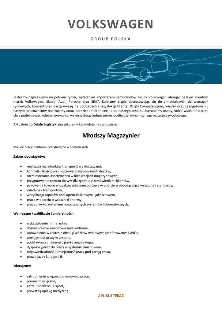 VOLKSWAGEN GROUP POLSKA Jesteśmy największym na polskim rynku, wyłącznym importerem samochodów Grupy Volkswagen oferując naszym Klientom marki: Volkswagen, Skoda, Audi, Porsche oraz SEAT. Działamy ciągle dostosowując się do zmieniających się wymagań rynkowych, koncentrując naszą uwagę na potrzebach i satysfakcji klienta. Dzięki kompetencjom, wiedzy oraz zaangażowaniu naszych pracowników realizujemy coraz bardziej ambitne cele, a do naszego zespołu zapraszamy osoby, które wspólnie z nami chcą podejmować kolejne wyzwania, wykorzystując jednocześnie możliwości dynamicznego rozwoju zawodowego. Aktualnie do Działu Logistyki poszukujemy kandydata na stanowisko: Młodszy Magazynier Miejsce pracy: Centrum Dystrybucyjne w Komornikach Zakres obowiązków:          realizacja rozładunków transportów z dostawami, kontrola jakościowa i ilościowa przyjmowanych dostaw, rozmieszczania asortymentu w lokalizacjach magazynowych, przygotowanie towaru do wysyłki zgodnie z zamówieniami klientów, pakowanie towaru w opakowania transportowe w oparciu o obowiązujące wytyczne i standardy, załadunek transportów, weryfikacja zapasów pod kątem ilościowym i jakościowym, praca w oparciu o wskaźniki i normy, praca z wykorzystaniem nowoczesnych systemów informatycznych. Wymagane kwalifikacje i umiejętności:         wykształcenie min. średnie, doświadczenie zawodowe mile widziane, uprawnienia w zakresie obsługi wózków widłowych (preferowane: I WJO), umiejętność pracy w zespole, podstawowa znajomość języka angielskiego, dyspozycyjność do pracy w systemie zmianowym, odpowiedzialność i umiejętność pracy pod presją czasu, prawo jazdy kategorii B. Oferujemy:     zatrudnienie w oparciu o umowę o pracę, premie miesięczne, kartę Benefit Multisport, prywatną opiekę medyczną. APLIKUJ TERAZ