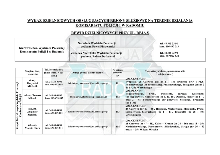 Wykaz dzielnicowych Komisariatu I Policji w Radomiu