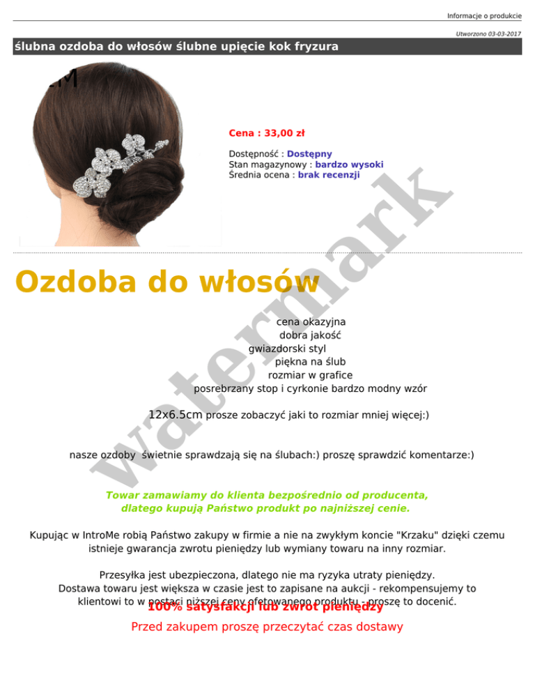 Informacje o produkcie Utworzono 03-03-2017 ślubna ozdoba do włosów ślubne upięcie kok fryzura Cena : 33,00 zł er m ar k Dostępność : Dostępny Stan magazynowy : bardzo wysoki Średnia ocena : brak recenzji Ozdoba do włosów at cena okazyjna dobra jakość gwiazdorski styl piękna na ślub rozmiar w grafice posrebrzany stop i cyrkonie bardzo modny wzór 12x6.5cm prosze zobaczyć jaki to rozmiar mniej więcej:) w nasze ozdoby świetnie sprawdzają się na ślubach:) proszę sprawdzić komentarze:) Towar zamawiamy do klienta bezpośrednio od producenta, dlatego kupują Państwo produkt po najniższej cenie. Kupując w IntroMe robią Państwo zakupy w firmie a nie na zwykłym koncie "Krzaku" dzięki czemu istnieje gwarancja zwrotu pieniędzy lub wymiany towaru na inny rozmiar. Przesyłka jest ubezpieczona, dlatego nie ma ryzyka utraty pieniędzy. Dostawa towaru jest większa w czasie jest to zapisane na aukcji - rekompensujemy to klientowi to w postaci niższej ceny ofetowanego produktu - proszę to docenić. 100% satysfakcji lub zwrot pieniędzy Przed zakupem proszę przeczytać czas dostawy (wszystko opisane w wysyłce :) NAM też zależy, by towar był na czas dziękujemy za odwiedzenie naszych aukcji:) w at er m ar k Link do aukcji na allegro http://allegro.pl/slubna-ozdoba-do-wlosow-slubne-upiecie-kok-fryzura-i6670764443.html