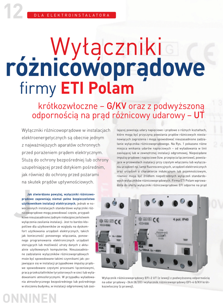 12 DL A ELEK TROINSTAL ATOR A Wyłączniki różnicowoprądowe firmy ETI Polam krótkozwłoczne – G/KV oraz z podwyższoną odpornością na prąd różnicowy udarowy – UT Wyłączniki różnicowoprądowe w instalacjach elektroenergetycznych są obecnie jednym z najważniejszych aparatów ochronnych przed porażeniem prądem elektrycznym. Służą do ochrony bezpośredniej lub ochrony uzupełniającej przed dotykiem pośrednim, jak również do ochrony przed pożarami J na skutek prądów upływnościowych. lającej powstają udary napięciowe i prądowe o różnych kształtach, które mogą być przyczyną powstania prądów różnicowych niestanowiących zagrożenia i mogą spowodować nieuzasadnione zadziałanie wyłącznika różnicowoprądowego. Na Rys. 1 pokazano różne miejsca wnikania udarów napięciowych – od wyładowania w linii zasilającej lub w zewnętrznej instalacji odgromowej. Niepożądane impulsy prądowe i napięciowe (tzw. przepięcia łączeniowe), powstające w przewodach instalacji przy częstym włączaniu lub wyłączaniu urządzeń np. lamp fluorescencyjnych, urządzeń elektronicznych oraz urządzeń o charakterze indukcyjnym lub pojemnościowym, również mogą być źródłem niepotrzebnych wyłączeń standardowych wyłączników różnicowoprądowych. Firma ETI Polam wprowadziła do oferty wyłączniki różnicowoprądowe EFI odporne na prąd Jak stwierdzono powyżej, wyłączniki różnicowo- prądowe zapewniają niemal pełne bezpieczeństwo użytkownikom instalacji elektrycznych, jednak w nowoczesnych instalacjach standardowe wyłączniki różnicowoprądowe mogą powodować częste, przypadkowe nieuzasadnione żadnym niebezpieczeństwem wyłączenia zasilania instalacji. Jest to bardzo kłopotliwe dla użytkowników ze względu na dyskomfort użytkowania urządzeń elektrycznych, takich jak konieczność ponownego włączania, ponownego programowania elektronicznych urządzeń sterujących lub możliwość utraty danych z aktualnie użytkowanych komputerów. Nieuzasadnione zadziałanie wyłączników różnicowoprądowych może być spowodowane takimi czynnikami jak: pojawiające się w instalacji przypadkowe impulsy prądowe spowodowane częstymi procesami łączeniowymi, pracą przekształtników tyrystorowych w sieci lub wyładowaniami atmosferycznymi. W przypadku wyładowania atmosferycznego bezpośredniego lub pośredniego w otoczeniu budynku, w instalacji odgromowej lub zasi- ONNINEN Wyłącznik różnicowoprądowy EFI-2 UT (z lewej) z podwyższoną odpornością na udar prądowy -3kA (8/20) i wyłącznik różnicowoprądowy EFI-4 G/KV krótkozwłoczny (z prawej). 13 DL A ELEK TROINSTAL ATOR A największych dopuszczalnych czasów wyłączania. To oznacza, że dla obu typów wyłączników – bezzwłocznych i krótkozwłocznych G/ K V – obowiązują te same warunki wybiórczej współpracy z poprzedzającymi wyłącznikami zwłocznymi. Mimo, iż czas przetrzymywania wyłączników krótkozwłocznych jest dłuższy niż wyłączników bezzwłocznych, to i tak mieści się on w granicach wyznaczonych przez normy PN-EN 61008 – 2 i VDE 0664 – 1 – 10. Przedstawiona również na charakterystyce czasowej charakterystyka wyłącznika selektywnego –S leży znacznie powyżej charakterystyk wyłączników bezzwłocznego i krótkozwłocznego. Jest on także odporny na niepożądane wyłączenie, jak również może być zastosowany do ochrony przeciwporażeniowej uzupełniającej. I∆n = 30 mA Uziemienie ms Rys. 1 Miejsca wniknięć przepięć do instalacji elektrycznej I∆n = 300 mA S t 500 300 różnicowy udarowy i oznaczone UT, co gwarantuje, że wyłącznik jest odporny na prąd różnicowy udarowy o kształcie 8/20 µs, przy czym wartość szczytowa prądu wynosi 3 kA. Badanie odporności wyłącznika różnicowoprądowego na prąd różnicowy udarowy o kształcie 8/20 µs i wartości szczytowej prądu – 3kA jest jednym z podstawowych badań wyłączników tzw. krótkozwłocznych – G/KV. Wyłączniki różnicowoprądowe krótkozwłoczne EFI- G/KV charakteryzują się również dużą odpornością na prądy różnicowe przejściowe, które nie są wynikiem uszkodzenia izolacji doziemnej w chronionym obwodzie. Zapobiegają przez to zbędnym wyzwalaniom wyłączników i zapewniają wymaganą ciągłość zasilania. Na rys. 3 przedstawione zostały charakterystyki czasowoprądowe wyłączników bezzwłocznych, krótkozwłocznych – G i selektywnych – S w funkcji prądu różnicowego. Linia ciągła – I Δn = 30mA przedstawia charakterystykę wyłączników bezzwłocznych, których czas przetrzymywania wynosi ok. 5 ms (może wynosić nawet ok. 1 ms). Natomiast wyłączniki krótkozwłoczne (linia przerywana na charakterystyce) mają gwarantowany czas przetrzymywania, co najmniej 10 ms. Oba typy wyłączników spełniają te same wymagania, co do przebiegu górnej linii charakterystyki pasmowej – linii i (kA) 3 0,9% 200 150 130 60 50 40 G 10 15 30 60 150 300 IA 600 1500 mA Rys. 3 Zestawienie charakterystyk czasowo-prądowych wyłączników różnicowoprądowych – bezzwłocznego, krótkozwłocznego-G i selektywnego-S Wnioski Jak już napisano powyżej – główną zaletą wyłączników krótkozwłocznych G/KV jest odporność na ich przypadkowe zadziałanie, co osiągnięto poprzez wyposażenie mechanizmu wyzwalania wyżej wymienionych wyłączników w zwłokę czasową, która eliminuje zakłócenia przejściowe. Drugą zaletą wyłączników krótkozwłocznych jest duża odporność na udary prądowe o wartości szczytowej do 3 kA. Mogą być stosowane w tym samym miejscu w instalacji elektrycznej, co wyłączniki różnicowoprądowe bezzwłoczne, zapewniając tym samym większą niezawodność zasilania w energię elektryczną. ETI Polam Sp. z o.o. w Pułtusku Zamawiaj w www.OnnShop.pl 0,5% Klucz wyszukiwania: 0,1% t (µs) 8 Grupa: Podgrupa: 20 Rys. 2 Znormalizowany udar prądowy 8/20 µs w w w . o n n i n e n . p l Dostaw
