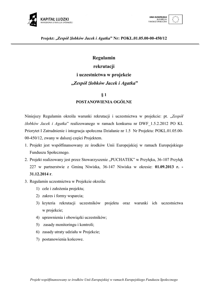 Projekt: „Zespół żłobków Jacek i Agatka” Nr: POKL.01.05.00-00-450/12 Regulamin rekrutacji i uczestnictwa w projekcie „Zespół żłobków Jacek i Agatka” §1 POSTANOWIENIA OGÓLNE Niniejszy Regulamin określa warunki rekrutacji i uczestnictwa w projekcie: pt. „Zespół żłobków Jacek i Agatka” realizowanego w ramach konkursu nr DWF_1.5.2.2012 PO KL Priorytet I Zatrudnienie i integracja społeczna Działanie nr 1.5 Nr Projektu: POKL.01.05.0000-450/12, zwany w dalszej części Projektem. 1. Projekt jest współfinansowany ze środków Unii Europejskiej w ramach Europejskiego Funduszu Społecznego. 2. Projekt realizowany jest przez Stowarzyszenie „PUCHATEK” w Przyłęku, 36-107 Przyłęk 227 w partnerstwie z Gminą Niwiska, 36-147 Niwiska w okresie: 01.09.2013 r. 31.12.2014 r. 3. Regulamin uczestnictwa w Projekcie określa: 1) cele i założenia projektu; 2) zakres i formy wsparcia; 3) kryteria rekrutacji uczestników projektu oraz warunki ich uczestnictwa w projekcie; 4) uprawnienia i obowiązki uczestników; 5) zasady monitoringu i kontroli; 6) zasady utraty udziału w Projekcie; 7) postanowienia końcowe. Projekt współfinansowany ze środków Unii Europejskiej w ramach Europejskiego Funduszu Społecznego Projekt: „Zespół żłobków Jacek i Agatka” Nr: POKL.01.05.00-00-450/12 §2 CELE I ZAŁOŻENIA PROJEKTU 1. Cel główny projektu: 1) Rozwój życia zawodowego u 16 rodziców (10 K i 6 M) dzięki utworzeniu 2 żłobków na terenie gminy Niwiska dla 16 dzieci w okresie 09.2013 do 12.2014 r. 2. Cele szczegółowe: 1) Równoważenie szans zawodowych 16 rodziców (10K i 6 M) poprzez utworzenie 2 żłobków na terenie gminy Niwiska dla 16 dzieci w okresie 09.2013 do 12.2014 r. 2) Rozwój umiejętności godzenia życia zawodowego i rodzinnego 16 rodziców 10K i 6 M) poprzez utworzenie 2 żłobków na terenie gminy Niwiska dla 16 dzieci w okresie 09.2013 do 12.2014 r. 3) Wyrównywanie szans zawodowych 16 rodziców (10K i 6 M) poprzez utworzenie 2 żłobków na terenie gminy Niwiska dla 16 dzieci w okresie 09.2013 do 12.2014 r. §3 ZAKRES I FORMY WSPARCIA 1. Projekt dotyczy wdrożenia i upowszechnienia rozwiązań służących godzeniu życia zawodowego i rodzinnego w zakresie tworzenia ośrodków opieki nad dziećmi. 2. Projekt skierowany jest do 16 mieszkańców Gminy Niwiska powracających oraz wchodzących na rynek pracy po przerwie związanej z urodzeniem dziecka i/lub wychowywaniem dzieci. 3. W ramach projektu zaplanowano adaptację budynków i utworzenie żłobka dla 16 dzieci w wieku od 1 roku do lat 3 w Gminie Niwiska. Żłobek będzie funkcjonował od 09/2013 r. od poniedziałku do piątku w godzinach od 7.00 do 15.00 z wyłączeniem świąt i dni ustawowo wolnych od pracy (przedział godzinowy może ulec zmianie w uzasadnionych przypadkach na wniosek rodziców). Projekt współfinansowany ze środków Unii Europejskiej w ramach Europejskiego Funduszu Społecznego Projekt: „Zespół żłobków Jacek i Agatka” Nr: POKL.01.05.00-00-450/12 4. Zespół żłobków „Jacek i Agatka” składa się z: 1) Żłobka „Jacek” w Siedlance – 10 miejsc. 2) Żłobka „Agatka” w Leszczach – 6 miejsc. §4 KRYTERIA REKRUTACJI UCZESTNIKÓW PROJEKTU ORAZ WARUNKI ICH UCZESTNICTWA W PROJEKCIE 1. Uczestnikiem Projektu może być osoba, która spełnia kryteria obligatoryjne: 1) Kryteria obligatoryjne uczestnictwa w projekcie: - osoby powracające na rynek pracy po przerwie związanej z urodzeniem i/lub wychowaniem dzieci mające miejsce zamieszkania na terenie Gminy Niwiska; 2. Listę rankingową tworzy się na podstawie deklaracji uczestnictwa, złożonych przez osoby spełniające kryteria obligatoryjne. Kolejność osób na liście rankingowej układana jest w oparciu o kryteria fakultatywne. 3. Fakultatywne kryteria rekrutacyjne z wagą punktową: 1) Obydwoje z rodziców dziecka pracują (oświadczenia rodziców) - 1 pkt. 2) Matka lub ojciec samotnie wychowuje dziecko (oświadczenia rodziców) – 1 pkt. 3) Rodzina korzystająca z pomocy Gminnego Ośrodka Pomocy Społecznej (oświadczenie) – 1 pkt. 4. Decyduje uzyskanie największej sumy punktowej. 5. W razie tej samej ilości punktów decydować będzie kolejność zgłoszeń. 6. Rekrutacja odbywa się w sposób ciągły w terminie od 10 września 2013 r. – do 24 września 2013 r. do godz. 1400. 7. Dokumenty rekrutacyjne należy składać osobiście lub za pośrednictwem poczty w siedzibie Partnera Projektu – Gmina Niwiska 36-147 Niwiska 430, pokój nr 14 (tel. 17 22 70 414), od poniedziałku do piątku, w godzinach od 730 do 1530. 8. Rekrutacja do Projektu prowadzona jest w sposób bezstronny z poszanowaniem zasady równości szans i płci. 9. W przypadku nie zrekrutowania planowanej liczby uczestników termin rekrutacji może ulec wydłużeniu do kolejnych 7 dni. Projekt współfinansowany ze środków Unii Europejskiej w ramach Europejskiego Funduszu Społecznego Projekt: „Zespół żłobków Jacek i Agatka” Nr: POKL.01.05.00-00-450/12 10. Lista uczestników zakwalifikowanych do Projektu zostaną wywieszone w biurze Projektu t.j.: siedzibie Stowarzyszenia Puchatek w Przyłęku, 36-107 Przyłęk 227 oraz w siedzibie Partnera –Gmina Niwiska 36-147 Niwiska 430. 11. Osoba ubiegająca się o udział w projekcie zobowiązana jest do złożenia następujących dokumentów (załączników): 1) Formularza zgłoszeniowego, 2) Deklaracji uczestnictwa 3) Oświadczenia uczestnika projektu o wyrażeniu zgody na przetwarzanie danych osobowych, 4) Formularza zgłoszeniowego dziecka, 12. Na każdym komplecie dokumentów zostanie wpisana data i godzina ich złożenia oraz zostanie nadany numer kancelaryjny złożonej deklaracji. 13. Osoba zakwalifikowana do projektu zobowiązuje się do akceptacji regulaminu projektu oraz dostarczenia niezwłocznie treści oświadczenia/dokumentów poświadczających: - zatrudnienie, - pozostawanie w rejestrze osób bezrobotnych poszukujących pracy (tylko w przypadku braku zatr
