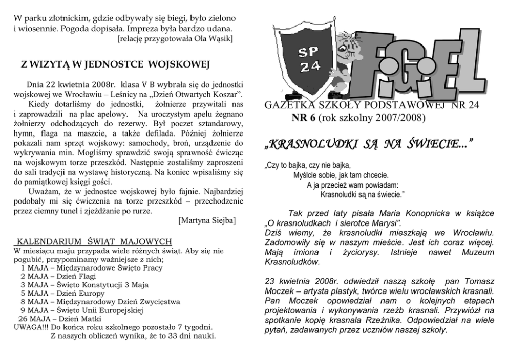 W parku złotnickim, gdzie odbywały się biegi, było zielono i wiosennie. Pogoda dopisała. Impreza była bardzo udana. [relację przygotowała Ola Wąsik] Z WIZYTĄ W JEDNOSTCE WOJSKOWEJ Dnia 22 kwietnia 2008r. klasa V B wybrała się do jednostki wojskowej we Wrocławiu – Leśnicy na „Dzień Otwartych Koszar”. Kiedy dotarliśmy do jednostki, żołnierze przywitali nas i zaprowadzili na plac apelowy. Na uroczystym apelu żegnano żołnierzy odchodzących do rezerwy. Był poczet sztandarowy, hymn, flaga na maszcie, a także defilada. Później żołnierze pokazali nam sprzęt wojskowy: samochody, broń, urządzenie do wykrywania min. Mogliśmy sprawdzić swoją sprawność ćwicząc na wojskowym torze przeszkód. Następnie zostaliśmy zaproszeni do sali tradycji na wystawę historyczną. Na koniec wpisaliśmy się do pamiątkowej księgi gości. Uważam, że w jednostce wojskowej było fajnie. Najbardziej podobały mi się ćwiczenia na torze przeszkód – przechodzenie przez ciemny tunel i zjeżdżanie po rurze. [Martyna Siejba] KALENDARIUM ŚWIĄT MAJOWYCH W miesiącu maju przypada wiele różnych świąt. Aby się nie pogubić, przypominamy ważniejsze z nich; 1 MAJA – Międzynarodowe Święto Pracy 2 MAJA – Dzień Flagi 3 MAJA – Święto Konstytucji 3 Maja 5 MAJA – Dzień Europy 8 MAJA – Międzynarodowy Dzień Zwycięstwa 9 MAJA – Święto Unii Europejskiej 26 MAJA – Dzień Matki UWAGA!!! Do końca roku szkolnego pozostało 7 tygodni. Z naszych obliczeń wynika, że to 33 dni nauki. GAZETKA SZKOŁY PODSTAWOWEJ NR 24 NR 6 (rok szkolny 2007/2008) „KRASNOLUDKI SĄ NA ŚWIECIE...” „Czy to bajka, czy nie bajka, Myślcie sobie, jak tam chcecie. A ja przecież wam powiadam: Krasnoludki są na świecie.” Tak przed laty pisała Maria Konopnicka w książce „O krasnoludkach i sierotce Marysi”. Dziś wiemy, że krasnoludki mieszkają we Wrocławiu. Zadomowiły się w naszym mieście. Jest ich coraz więcej. Mają imiona i życiorysy. Istnieje nawet Muzeum Krasnoludków. 23 kwietnia 2008r. odwiedził naszą szkołę pan Tomasz Moczek – artysta plastyk, twórca wielu wrocławskich krasnali. Pan Moczek opowiedział nam o kolejnych etapach projektowania i wykonywania rzeźb krasnali. Przywiózł na spotkanie kopię krasnala Rzeźnika. Odpowiedział na wiele pytań, zadawanych przez uczniów naszej szkoły. A pytaliśmy o różne sprawy: Którego krasnala lubi Pan najbardziej? Ile kosztuje krasnal? Jak długo powstaje? Które krasnale są zaprojektowane i wykonane przez Pana? Jakie warunki należy spełnić, aby postawić przed szkołą krasnoludka? Właśnie. Bardzo byśmy chcieli, aby w naszej szkole albo przed szkołą zamieszkał taki krasnal. Może Złotnik? ... A teraz proponujemy Wam rozwiązanie „krasnalkowej krzyżówki” i sprawdzenie swoich wiadomości na temat krasnoludków wrocławskich. 1 9. Przed salonem jubilerskim. 10. Pcha ogromną kulę. 11. Z koszem po zakupy. [krzyżówkę opracowali: Marcin Majewski, Julka Majewska, Maciej Bemben] Informacji na temat wrocławskich krasnoludków szukajcie na stronie www.krasnale.pl „WITAJ MAJOWA JUTRZENKO” W tym tygodniu przypada ŚWIĘTO KONSTYTUCJI 3 MAJA. 2 3 4 5 6 7 8 9 10 11 Znaczenia wyrazów: 1. Siedzi i pilnuje wejścia do krainy krasnoludków. 2. Pracz ... 3. Bardzo lubi jeść, leży w Rynku przed pizzerią. 4. Z walizką w ręce. 5. Lubi nurkować. 6. Miłośnik filmów, jeździ na rowerze. 7. Z widelcem i pierogiem. 8. Życzliwy. W maju 1791 roku obradował Sejm Czteroletni zwany również Wielkim. Obrady doprowadziły do uchwalenia konstytucji. Konstytucja 3 Maja była pierwszą w Europie, a drugą na świecie nowożytną ustawą zasadniczą. Jej uchwalenie było doniosłym aktem historycznym, dowodem patriotyzmu narodu polskiego. „Witaj majowa jutrzenko, świeć naszej polskiej krainie. Uczcimy ciebie piosenką, Która w całej Polsce słynie. Witaj maj! Trzeci Maj!” [przygotowała Ada Ostrowska] XX ZŁOTNICKIE BIEGI PRZEŁAJOWE W niedzielę 27 kwietnia 2008r. odbyły się XX Złotnickie Biegi Przełajowe. Uczestnicy zawodów startowali w kategoriach wiekowych, z podziałem na dziewczęta i chłopców. Zwycięzcy poszczególnych dystansów otrzymali medale, dyplomy i upominki. Na wszystkich zawodników czekał ciepły posiłek i herbata.