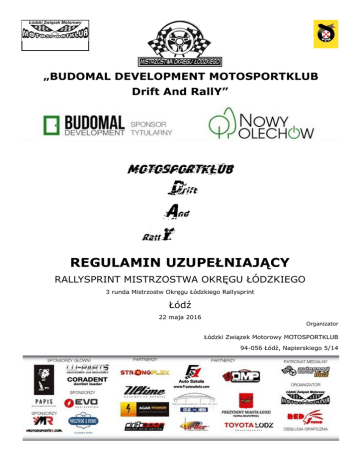 „BUDOMAL DEVELOPMENT MOTOSPORTKLUB Drift And RallY” REGULAMIN UZUPEŁNIAJĄCY RALLYSPRINT MISTRZOSTWA OKRĘGU ŁÓDZKIEGO 3 runda Mistrzostw Okręgu Łódzkiego Rallysprint Łódź 22 maja 2016 Organizator Łódzki Związek Motorowy MOTOSPORTKLUB 94-056 Łódź, Napierskiego 5/14 SPIS TREŚCI: 1. USTALENIA OGÓLNE 2. ORGANIZACJA 3. ZGŁOSZENIA 4. UBEZPIECZENIE 5. NUMERY IDENTYFIKACYJNE 6. REKLAMA 7. ODBIÓR ADMINISTRACYJNY 8. ZAPOZNANIE Z TRASĄ 9. BADANIA KONTROLNE 10. OPONY 11. ODPRAWA UCZESTNIKÓW 12. PRZEBIEG IMPREZY 13. PROCEDURA STARTU 14. POMIAR CZASU 15. META RALLYSPRINTU 16. BEZPIECZEŃSTWO 17. IDENTYFIKACJA OSÓB OFICJALNYCH PODCZAS RALLYSPRINTU 18. NAGRODY 19. PROTESTY 20. KARY 21. POSTANOWIENIA KOŃCOWE Rallysprint zostanie przeprowadzony zgodnie z postanowieniami: Międzynarodowego Kodeksu Sportowego FIA, Regulaminu Ramowy Mistrzostw Okręgu Łódzkiego w Rallysprint wraz z załącznikami, Regulaminu Konkursowej Jazdy Samochodem, Regulaminu Ochrony Środowiska w Sportach Motorowych, Ustawy „Prawo o ruchu drogowym”, niniejszego regulaminu uzupełniającego. Modyfikacje, zmiany i/lub uzupełnienia do niniejszego regulaminu uzupełniającego będą publikowane wyłącznie w numerowanych i datowanych komunikatach ogłaszanych przez organizatora lub ZSS. Otwarcie listy zgłoszeń 09.05.2016 godz. 00:01 Zamknięcie listy zgłoszeń 18.05.2016 godz. 24:00 Odbiór administracyjny 22.05.2016 godz. 6:00-7:30 Badanie kontrolne BK 1 22.05.2016 godz. 6:10-8:10 Pierwsze posiedzenie ZSS 22.05.2016 godz. 8:20 Odprawa uczestników 22.05.2016 godz. 8:40 Publikacja listy załóg dopuszczonych do startu 22.05.2016 godz. 8:50 Start 22.05.2016 godz. 9:00 Meta 22.05.2016 godz. 16:00 Końcowe badanie kontrolne nie przewidziano Opublikowanie końcowej klasyfikacji prowizorycznej 22.05.2016 godz. 17:00 Rozdanie nagród 22.05.2016 godz. 18:00 1. USTALENIA OGÓLNE 1.1. Miejsce i termin imprezy Impreza odbędzie się w dniu 22.05.2016 . na terenie Łodzi. Ulice (oraz kompleks wiaduktów przy nich usytułowany): Maratońska (od ul. Obywatelskiej do Wróblewskiego), Waltera-Janke (od ul. Wyszyńskiego, do wysokości wjazdu do marketu Lidl), Nowe Sady (od ul. Waltera-Janke do wysokości wjazdu do marketu Lidl), Pienista (od ul. WalteraJanke do wysokości końca ogrodzenia firmy Mosty Łódź). 1.2. Nazwa i ranga imprezy Rallysprint MOTOSPORTKLUB Drift And RallY rozgrywany jest jako: 3 runda MOŁ w Rallysprint. 1.3. Numer wizy ZO PZM Numer wizy 10.2016 wydana przez OKSS PZM w Łodzi w dniu 13.04.2016. 1.4. Lokalizacja biura Od dnia otwarcia listy zgłoszeń do 21.05.2016 biuro elektroniczne pod adresem [email protected] Lokalizacja biura w dniu imprezy i godziny działania zostaną opublikowane komunikatem 1.5. Lokalizacja startu, mety Start do zapoznania – Waltera -Janke przy Wyszyńskiego godz. 07:00 Start - Waltera -Janke między Wyszyńskiego a zjazdem z wiaduktu godz. 9:00 Meta – Waltera -Janke przy Wyszyńskiego godz. 18:00 1.6. Charakterystyka Impreza zostanie przeprowadzona w ciągu jednego dnia i składa z 3 przejazdów. Na trasie zlokalizowane będzie jedna próba Nawierzchnia próby : asfalt. Długość próby: 2 km 2. ORGANIZACJA 2.1. Nazwa organizatora Łódzki Związek Motorowy MOTOSPORTKLUB 2.2. Adres 94-056 Łódź, Napierskiego 5/10 tel. 695658456 strona: www.motosportklub.pl e-mail: [email protected] 2.3. Władze Rallysprint 2.3.1. Zespół Sędziów Sportowych Przewodniczący Mirosław Kister 2.3.2. Osoby oficjalne Dyrektor Imprezy Piotr Trześniewski Kierownik trasy i bezpieczeństwa Adam Rzepkowski Kierownik biura Magdalena Rzepkowska Kierownik komisji obliczeń Anna Frątczak Delegat Techniczny ZO PZM w Łodzi Tomasz Łysoniewski Kierownik badań kontrolnych Tomasz Kister Kierownik pomiaru czasu Krzysztof Kwapisz Komisarz ds. Ochrony środowiska zostanie ogłoszony komunikatem 3. ZGŁOSZENIA 3.1. Załoga 3.1.1. Załogę stanowi kierowca z lub bez pilota 3.1.2. Kierowca nie może posiadać jakiejkolwiek licencji kierowcy sportu samochodowego w rozumieniu przepisów Polskiego Związku Motorowego, za wyjątkiem zawodników posiadających licencję, wymienionych w art. 1.1 regulaminu ramowego KJS. 3.1.3. Pilot nie może prowadzić samochodu podczas imprezy. W przypadku stwierdzenia prowadzenia samochodu przez pilota, załoga zostanie wykluczona. 3.2. Obowiązki załogi Do obowiązków załogi należy: 3.2.1. Obecność na odprawie uczestników 3.2.2Przejechania trasy Rallysprint zgodnie z harmonogramem ogłoszonym przez organizatora w kolejności oraz kierunku zgodnym z dokumentami dostarczonymi przez organizatora, Odbycie wszystkich prób w zapiętych pasach bezpieczeństwa, zapiętych kaskach ochronnych, z włączonymi światłami mijania lub światłami do jazdy dziennej oraz zamkniętymi szybami i szyberdachem. Nieprzestrzeganie powyższych przepisów pociągnie za sobą karę do wykluczenia włącznie. 3.2.3. 3.2.4. Na trasie próby sportowej każda załoga jest zobowiązana do bezwarunkowego wykonywania poleceń organizatora, zachowania szczególnej ostrożności a w przypadku widocznego realnego niebezpieczeństwa do przerwania próby. Na terenie imprezy poza trasą próby każda załoga jest zobowiązana do wykonywania poleceń organizatora, zachowania szczególnej ostrożności i bezwzględnego ustępowania pierszeństwa pieszym. Ograniczenie prędkości poza próbą sportową max 30 km/h 3.3. Procedura zgłoszeń 3.3.1. Uczestnik zamierzający wziąć udział w Rallysprincie musi wypełnione zgłoszenie przesłać do dnia 15.05.2016 do godz. 24:00 na adres: [email protected] i złożyć w dniu imprezy w biurze zawodów w miejscu i czasie ogłoszonym komunikatem 3.3.2. Jeżeli zgłoszenie wysłane jest pocztą e-mail, oryginał musi dotrzeć do organizatora najpóźniej w dniu odbioru administracyjnego. Oryginał zgłoszenia musi być czytelny i podpisany przez obydwu członków załogi. 3.3.3. Zgłoszenie zostanie przyjęte tylko w przypadku, gdy towarzyszyć mu będz