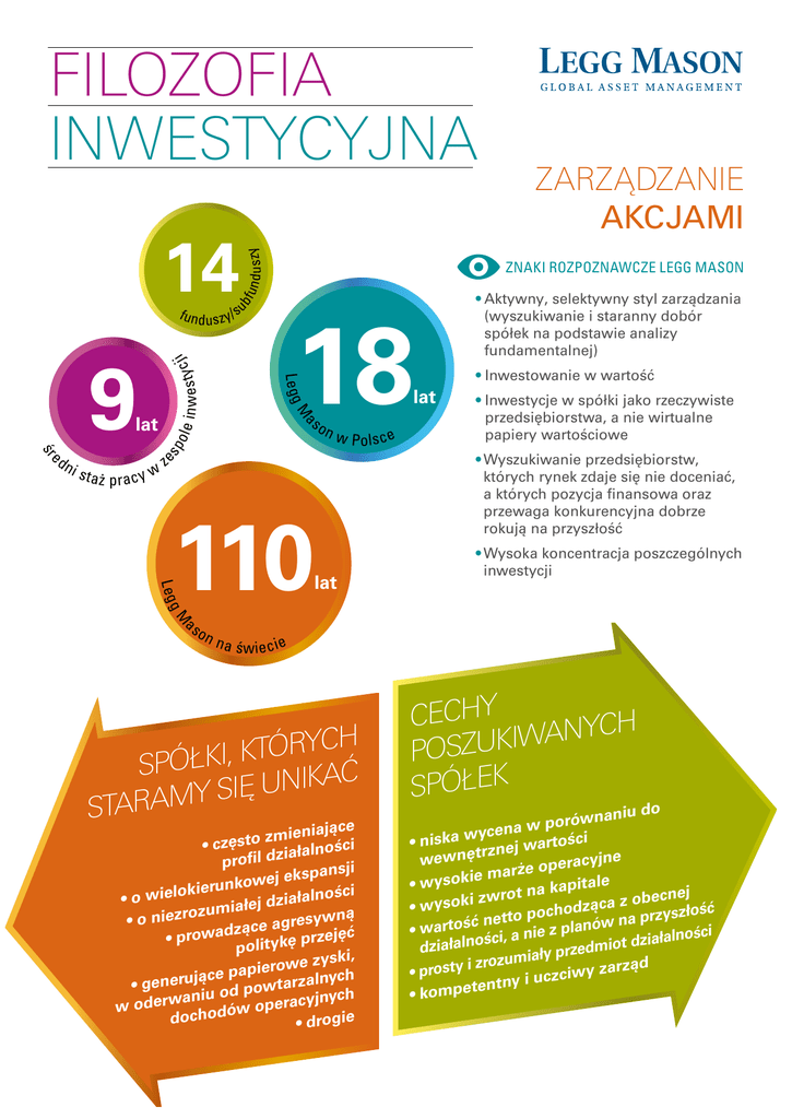 ub so nw Polsce staż pracy w z Leg 110 gM as on • Aktywny, selektywny styl zarządzania (wyszukiwanie i staranny dobór spółek na podstawie analizy fundamentalnej) • Inwestowanie w wartość • Inwestycje w spółki jako rzeczywiste przedsiębiorstwa, a nie wirtualne papiery wartościowe • Wyszukiwanie przedsiębiorstw, których rynek zdaje się nie doceniać, a których pozycja finansowa oraz przewaga konkurencyjna dobrze rokują na przyszłość es po a ni lat M śr ed 18 Legg lat le inwestycji fu n du s z y/ s 9 ZARZĄDZANIE AKCJAMI ZNAKI ROZPOZNAWCZE LEGG MASON fun 14 duszy FILOZOFIA INWESTYCYJNA lat • Wysoka koncentracja poszczególnych inwestycji na świecie CH Y R Ó T K , I SPÓŁK IKAĆ N U Ę I S Y STARAM jące zmienia o t s ę z c ci • iałalnoś z d l fi o r p nsji ej ekspa w o k n u r kie ści • o wielo ziałalno d j łe ia ozum • o niezr resywną g a e c ą z d • prowa przejęć politykę ki, owe zys r ie p a p jące ych • generu wtarzaln h o p d o aniu jnyc w oderw hodów operacy doc • drogie CECHY H C Y N A W I POSZUK SPÓŁEK iu do równan o p w a ycen • niska w nej wartości rz yjne wewnęt e operac ż r a m ie ale • wysok na kapit t o r w z i obecnej z a c ą z • wysok d ć to pocho ów na przyszłoś t e n ć ś o art z plan •w ości ci, a nie ś o ln t działaln ła io ia m d dz e z r iały p i zrozum ząd • prosty ciwy zar z c u i y n tent • kompe ŚCISŁA SPECJALIZACJA plany emerytalne fundusze akcyjne i z udziałem akcji regularne oszczędzanie praca zespołowa i etyka działania Niezależność myślenia - kontrarianizm „W jaki sposób można zarobić pieniądze na giełdzie? Dla mnie istnieje tylko jeden – trzeba postawić inaczej niż większość uczestników rynku i mieć rację. Nie ma innej drogi! Jeżeli podąża się za ogólnie przyjętym tokiem rozumowania, nie można zarobić więcej niż inni. Źródłem ponadprzeciętnego zarobku jest zawsze niezgadzanie się z innymi.” Tomasz Jędrzejczak, CFA prezes zarządu Legg Mason Towarzystwo Funduszy Inwestycyjnych SA ZESPÓŁ ZARZĄDZAJĄCY LEGG MASON Od lewej strony: Tomasz Płatek, Paweł Dolegacz, Piotr Rzeźniczak, Krzysztof Socha, Mieszko Żakiewicz, Zenon Łyś. WAŻNE INFORMACJE - PRZECZYTAJ UWAŻNIE Informacje na temat funduszy zarządzanych przez Legg Mason TFI SA („fundusze”) zawarte są w prospektach informacyjnych oraz w kluczowych informacjach dla inwestorów, które są dostępne na stronie internetowej www.leggmason.pl, w poszczególnych punktach dystrybucji funduszy, jak również w formie pisemnej w siedzibie funduszy. Prospekty informacyjne funduszy i kluczowe informacje dla inwestorów zawierają informacje niezbędne do oceny inwestycji, wskazują ryzyko uczestnictwa w funduszach, koszty, opłaty i informacje o podatkach. Przed zainwestowaniem w wybrany fundusz/subfundusz należy zapoznać się z kluczowymi informacjami dla inwestorów dotyczącymi wybranej kategorii jednostki uczestnictwa funduszu/subfunduszu, którego będzie dotyczyć zlecenie, jak również z prospektem informacyjnym funduszu. Dotychczasowe wyniki funduszy nie stanowią gwarancji osiągnięcia podobnych wyników w przyszłości. Wyniki funduszy nie uwzględniają podatku od dochodów kapitałowych oraz opłat związanych z nabywaniem jednostek uczestnictwa. Indywidualna stopa zwrotu zależy od dnia nabycia oraz odkupienia jednostek uczestnictwa, a także od wielkości pobranych opłat manipulacyjnych i wysokości należnego podatku. Fundusze nie gwarantują realizacji założonego celu inwestycyjnego, ani uzyskania określonego wyniku inwestycyjnego. Uczestnik funduszy musi liczyć się z możliwością utraty przynajmniej części wpłaconych środków. Fundusze mogą lokować więcej niż 35% wartości aktywów w papiery wartościowe emitowane przez Skarb Państwa, Narodowy Bank Polski, Europejski Bank Odbudowy i Rozwoju lub Europejski Bank Inwestycyjny oraz w papiery wartościowe emitowane przez państwo członkowskie, jednostkę samorządu terytorialnego, jednostkę samorządu terytorialnego państwa członkowskiego. LM Senior FIO oraz LM Parasol FIO w odniesieniu do aktywów LM Subfunduszu Strateg i LM Subfunduszu Obligacji mogą ponadto lokować więcej niż 35% wartości aktywów w papiery wartościowe emitowane, poręczane lub gwarantowane przez Europejski Bank Centralny i Unię Europejską. Wartość aktywów netto LM Subfunduszu Akcji i LM Subfunduszu Strateg, wydzielonych w ramach LM Parasol FIO, może cechować się znaczną zmiennością ze względu na skład portfela inwestycyjnego. Niniejszy materiał ma wyłącznie charakter promocyjny, a wykresy i zestawienia w nim zawarte należy traktować jako ilustrację, nie prognozę. Materiał ten nie stanowi oferty w rozumieniu Kodeksu cywilnego, doradztwa inwestycyjnego, ani rekomendacji w zakresie nabycia lub sprzedaży jakichkolwiek instrumentów finansowych. X 2015