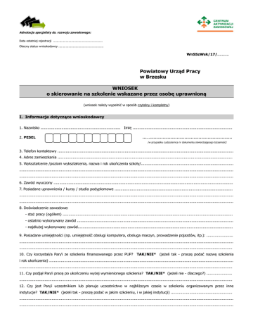 Adnotacje specjalisty ds. rozwoju zawodowego: Data ostatniej rejestracji ....................................................... Obecny status wnioskodawcy .................................................. WnSSzWsk/17/.......... Powiatowy Urząd Pracy w Brzesku WNIOSEK o skierowanie na szkolenie wskazane przez osobę uprawnioną (wniosek należy wypełnić w sposób czytelny i kompletny) I. Informacje dotyczące wnioskodawcy 1. Nazwisko ..................................................................... Imię ...................................................................................... 2. PESEL ...…................................................................ /w przypadku cudzoziemca nr dokumentu stwierdzającego tożsamość/ 3. Telefon kontaktowy ........................................................................................................................................................ 4. Adres zamieszkania ....................................................................................................................................................... 5. Wykształcenie /poziom wykształcenia, nazwa i rok ukończenia szkoły/................................................................................ ......................................................................................................................................................................................... ......................................................................................................................................................................................... 6. Zawód wyuczony ........................................................................................................................................................... 7. Posiadane uprawnienia / kursy / studia podyplomowe ...................................................................................................... ......................................................................................................................................................................................... ......................................................................................................................................................................................... 8. Doświadczenie zawodowe: - staż pracy (ogółem) ................................................................................................................................................... - ostatnio wykonywany zawód ....................................................................................................................................... - najdłużej wykonywany zawód...................................................................................................................................... 9. Posiadane umiejętności (np. umiejętność obsługi komputera, obsługa maszyn, prowadzenie pojazdów, itp.): ....................... ......................................................................................................................................................................................... ........................................................................................................................................................................................ 10. Czy korzystał/a Pan/i ze szkolenia finansowanego przez PUP? TAK/NIE* (jeżeli tak - proszę podać nazwę szkolenia i rok ukończenia) ............................................................................................................................................................... ........................................................................................................................................................................................ 11. Czy podjął Pan/i pracę po ukończeniu wyżej wymienionego szkolenia? TAK/NIE* (jeżeli nie - dlaczego?) ...................... ........................................................................................................................................................................................ 12. Czy jest Pan/i uczestnikiem lub planuje uczestnictwo w najbliższym czasie w szkoleniu organizowanym przez inne instytucje? TAK/NIE* (jeżeli tak - proszę podać w jakim szkoleniu, i w jakiej instytucji) ..................................................... ......................................................................................................................................................................................... ......................................................................................................................................................................................... II. Informacje dotyczące szkolenia: 1. Nazwa szkolenia o jakie ubiega się osoba składająca wniosek .................................................................................. ...................................................................................................................................................................... ....................................................................................................................................................................... 2. Uzasadnienie celowości ukończenia szkolenia ....................................................................................................... .......................................................................................................................................................................... ...................................................................................................................................................................... ...................................................................................................................................................................... ......