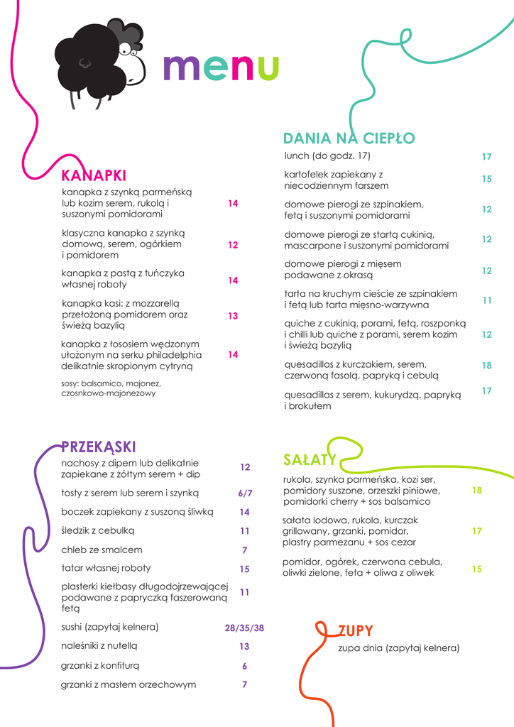 menu DANIA NA CIEPŁO KANAPKI kanapka z szynką parmeńską lub kozim serem, rukolą i suszonymi pomidorami klasyczna kanapka z szynką domową, serem, ogórkiem i pomidorem kanapka z pastą z tuńczyka własnej roboty 14 12 14 kanapka kasi: z mozzarellą przełożoną pomidorem oraz świeżą bazylią 13 kanapka z łososiem wędzonym ułożonym na serku philadelphia delikatnie skropionym cytryną 14 sosy: balsamico, majonez, czosnkowo-majonezowy PRZEKĄSKI nachosy z dipem lub delikatnie zapiekane z żółtym serem + dip 12 tosty z serem lub serem i szynką 6/7 boczek zapiekany z suszoną śliwką 14 śledzik z cebulką 11 chleb ze smalcem 7 tatar własnej roboty 15 plasterki kiełbasy długodojrzewającej podawane z papryczką faszerowaną fetą sushi (zapytaj kelnera) lunch (do godz. 17) 17 kartofelek zapiekany z niecodziennym farszem 15 domowe pierogi ze szpinakiem, fetą i suszonymi pomidorami 12 domowe pierogi ze startą cukinią, mascarpone i suszonymi pomidorami 12 domowe pierogi z mięsem podawane z okrasą 12 tarta na kruchym cieście ze szpinakiem i fetą lub tarta mięsno-warzywna 11 quiche z cukinią, porami, fetą, roszponką i chilli lub quiche z porami, serem kozim i świeżą bazylią 12 quesadillas z kurczakiem, serem, czerwoną fasolą, papryką i cebulą 18 quesadillas z serem, kukurydzą, papryką i brokułem 17 SAŁATY rukola, szynka parmeńska, kozi ser, pomidory suszone, orzeszki piniowe, pomidorki cherry + sos balsamico 18 sałata lodowa, rukola, kurczak grillowany, grzanki, pomidor, plastry parmezanu + sos cezar 17 pomidor, ogórek, czerwona cebula, oliwki zielone, feta + oliwa z oliwek 15 11 28/35/38 naleśniki z nutellą 13 grzanki z konfiturą 6 grzanki z masłem orzechowym 7 ZUPY zupa dnia (zapytaj kelnera) menu ŚWIEŻE SOKI NAPOJE coca-cola coca-cola zero coca-cola light fanta sprite nestea cytrynowa nestea brzoskwiniowa cappy pomarańczowe cappy jabłkowe cappy porzeczkowe woda niegazowana woda gazowana tonic redbull KAWY 6 6 6 6 6 6 6 6 6 6 5 5 6 10 KOKTAJLE mleko, ananas, wanilia, kokos, czekolada 11 mleko, banan, wanilia, czekolada 11 mleko, żurawina, kokos 11 mleko, mango, wanilia 11 mleko, truskawka, banan, czekolada LEMONIADY cytryna, mięta limonka, mango limonka, mięta cytryna, truskawka 11 9 9 9 9 espresso espresso doppio espresso macchiato americano cappucino latte latte smakowe syropy: wanilia, migdał, kokos, czekolada, orzech laskowy, cynamon, cukier trzcinowy, banan, grenadine, truskawka, żurawina, mango frappe 7 9 8 8 9 9 10 10 HERBATY czarna earl grey supreme organic english breakfast paris ceylon darjeeling zielona organic green organic bangkok dragon pearl jasmine japanese sencha cherry biała white vanilla & grapefruit 10 10 10 10 10 10 10 10 10 10 10 marchew, cytryna dynia, jabłko pomarańcza grejpfrut pomarańcza, grejpfrut SMOOTHIES ananas i marakuja borówka i jeżyna banan brzoskwinia mango malina truskawka owoce egzotyczne owoce lata SHAKE’I ananas i marakuja borówka i jeżyna banan brzoskwinia mango malina truskawka owoce egzotyczne owoce lata 12 12 12 12 12 12 12 12 12 12 12 12 12 12 13 13 13 13 13 13 13 13 13 menu DRINKI black sheep 16 martini 17 martini drink 17 cuba libre 18 manhattan 19 rob roy 17 blavod black vodka, blue curacao, syrop truskawkowy, sour mix, pianka z ananasa vodka, dry vermouth gin, dry vermouth light rum, cola american whiskey, sweet vermouth WINA ALKOHOLE wódka żołądkowa de luxe żołądkowa gorzka żołądkowa miętowa żubrówka żubrówka biała blavod black vodka finlandia finlandia lime finlandia cranberry krupnik cytrynowy lubelsla cytrynowa lubelska grejpfrutowa lubelska wiśniowa soplica orzechowa cachasa tequila sierra silver sierra gold olmeca gin seagram’s rum bacardi superior bacardi black havana club anejo 3 anos havana club anejo 7 anos wermuth martini bianco martini extra dry martini rosso american whiskey jack daniels bourbon jim beam scotch whisky ballantine’s brandy metaxa 5 likiery advocat baileys malibu amaretto campari ramblasreales 10/60 negroni 18 chateau d’encoste 10/60 cosmopolitan 18 cataregia 9/50 metropolitan 18 beauvillon 11/65 madras 16 los pagos 10/60 sex on the beach 18 tequila sunrise 17 t.n.t 16 godfather 16 godmother 16 white russian 14 black russian 14 blue lagoon 16 łysy jeleń 19 bmw 23 long island iced tea 25 szarlotka 13 monte 12 margarita 19 margarita truskawkowa 19 caipirinha 18 mojito 19 daiquiri 19 daiquiri truskawkowe 19 jack & cola gin & tonic vodka & redbull jagermeister & redbull malibu z mlekiem malibu z sokiem pomarańczowym 18 13 16 18 12 13 czerwone, wytrawne, hiszpańskie 5 5 5 5 5 6 7 7 7 5 5 5 5 5 7 8 9 11 7 14 15 15 16 11 11 11 12 12 10 14 czerwone, wytrawne, francuskie czerwone, wytrawne, hiszpańskie różowe, chilijskie, półwytrawne białe, wytrawne, chilijskie two ocenas białe, półwytrawne, afrykańskie 9/50 gin, campari, sweet vermouth lime vodka, triple sec, sok żurawinowy cranberry vodka, triple sec, sok żurawinowy vodka, sok żurawinowy, sok pomarańczowy vodka, peach schnapps, sok żurawinowy, sok pomarańczowy tequila, sok pomarańczowy, grenadine tequila, tonic PIWA scotch whisky, amaretto carlsberg 0,5l 8 carlsberg 0,5l but. 9 carlsberg 0,3l 7 kasztelan niepast. 0,5l 8 kasztelan niepast. 0,5l but. 9 kasztelan niepast. 0,3l 7 somersby 0,4l 9 okocim porter 0,5l 12 okocim pszeniczne 0,5l 11 ciechan miodowy 0,5l 11 karmi 0,5l 9 vodka, amaretto vodka, kahlua, mleko vodka, kahlua vodka, blue curacao, sour mix jagermeister, syrop kokosowy, redbull baileys, malibu, american whiskey vodka, tequila, gin, light rum, triple sec, sour mix, cola żubrówka bison grass, sok jabłkowy SHOTY black sheep shot blavod black vodka, blue curacao, syrop truskawkowy, sour mix, pianka z ananasa soplica orzechowa, mleko, kakao 8 b52 16 wściekły pies 10 kahlua, baileys, triple sec vodka, syrop malinowy, tabasco pszczółka 7 żuczek 7 vodka, syrop imbirowy, sour mix vodka, syrop malinowy, sour mix sambuca 11 kamikaze 15 kamikaze truskawkow