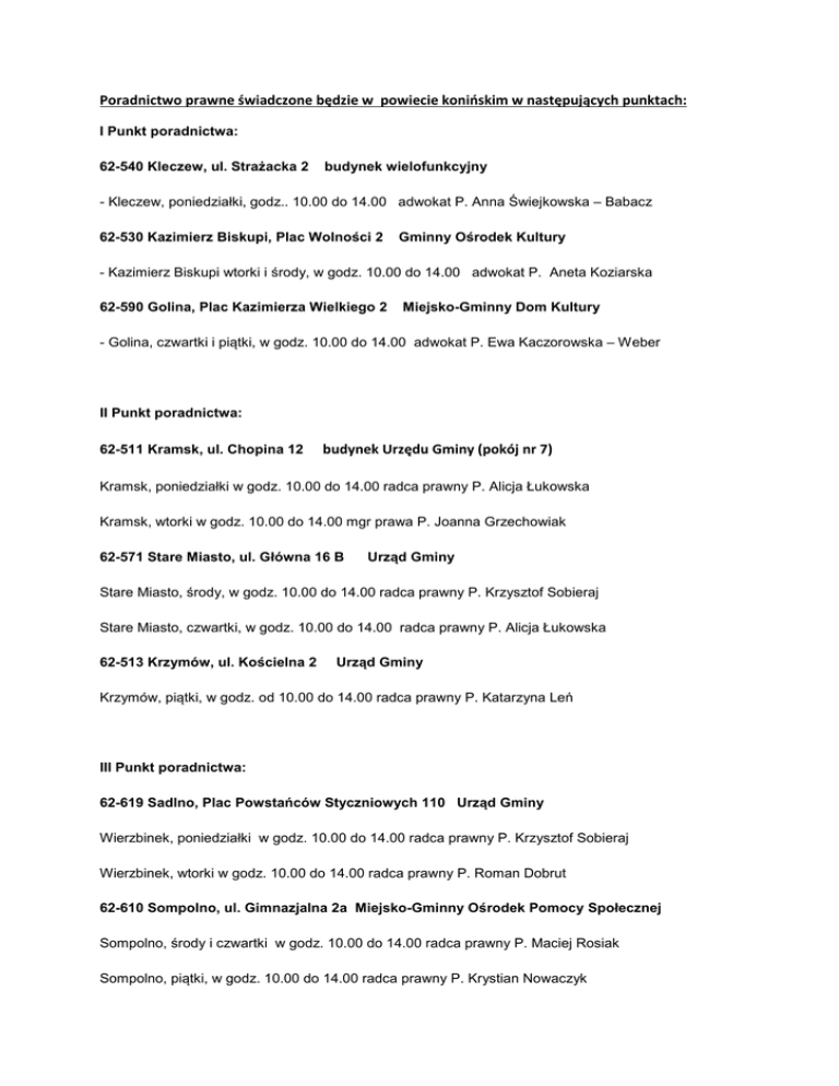 Poradnictwo prawne świadczone będzie w powiecie konińskim w następujących punktach: I Punkt poradnictwa: 62-540 Kleczew, ul. Strażacka 2 budynek wielofunkcyjny - Kleczew, poniedziałki, godz.. 10.00 do 14.00 adwokat P. Anna Świejkowska – Babacz 62-530 Kazimierz Biskupi, Plac Wolności 2 Gminny Ośrodek Kultury - Kazimierz Biskupi wtorki i środy, w godz. 10.00 do 14.00 adwokat P. Aneta Koziarska 62-590 Golina, Plac Kazimierza Wielkiego 2 Miejsko-Gminny Dom Kultury - Golina, czwartki i piątki, w godz. 10.00 do 14.00 adwokat P. Ewa Kaczorowska – Weber II Punkt poradnictwa: 62-511 Kramsk, ul. Chopina 12 budynek Urzędu Gminy (pokój nr 7) Kramsk, poniedziałki w godz. 10.00 do 14.00 radca prawny P. Alicja Łukowska Kramsk, wtorki w godz. 10.00 do 14.00 mgr prawa P. Joanna Grzechowiak 62-571 Stare Miasto, ul. Główna 16 B Urząd Gminy Stare Miasto, środy, w godz. 10.00 do 14.00 radca prawny P. Krzysztof Sobieraj Stare Miasto, czwartki, w godz. 10.00 do 14.00 radca prawny P. Alicja Łukowska 62-513 Krzymów, ul. Kościelna 2 Urząd Gminy Krzymów, piątki, w godz. od 10.00 do 14.00 radca prawny P. Katarzyna Leń III Punkt poradnictwa: 62-619 Sadlno, Plac Powstańców Styczniowych 110 Urząd Gminy Wierzbinek, poniedziałki w godz. 10.00 do 14.00 radca prawny P. Krzysztof Sobieraj Wierzbinek, wtorki w godz. 10.00 do 14.00 radca prawny P. Roman Dobrut 62-610 Sompolno, ul. Gimnazjalna 2a Miejsko-Gminny Ośrodek Pomocy Społecznej Sompolno, środy i czwartki w godz. 10.00 do 14.00 radca prawny P. Maciej Rosiak Sompolno, piątki, w godz. 10.00 do 14.00 radca prawny P. Krystian Nowaczyk
