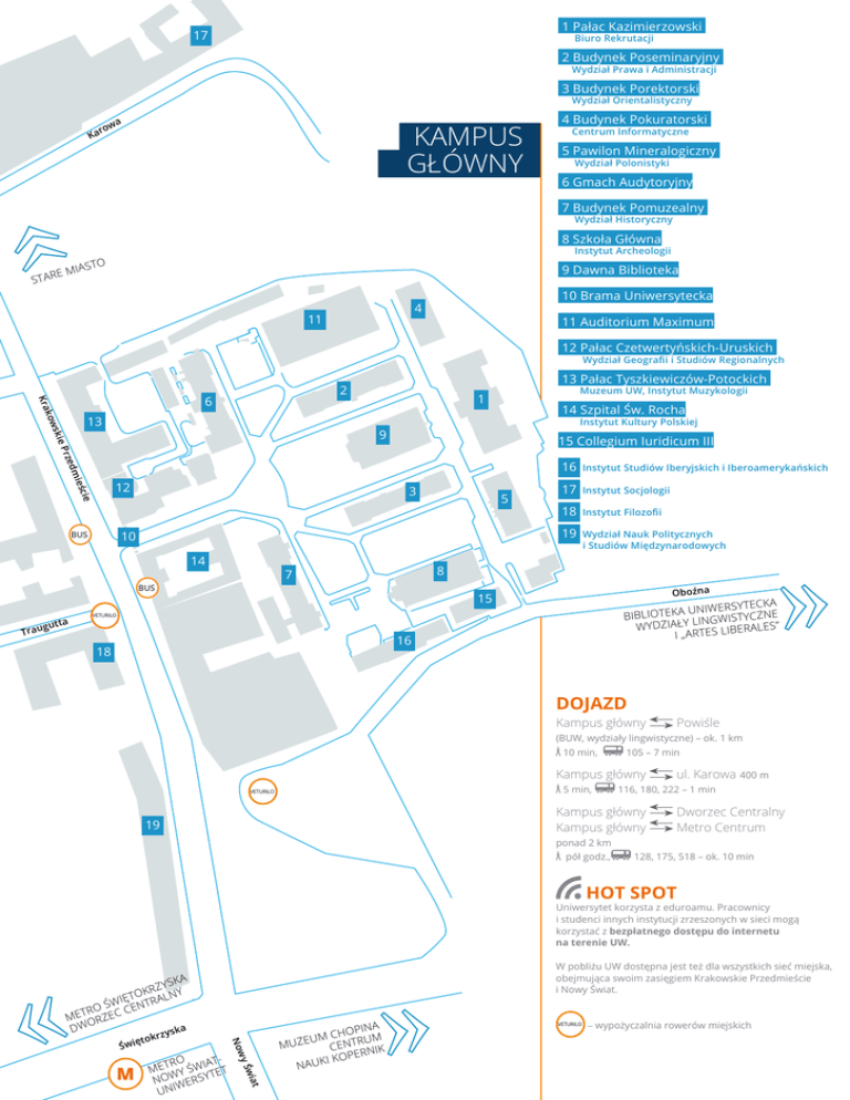 1 Pałac Kazimierzowski 17 Biuro Rekrutacji 2 Budynek Poseminaryjny Wydział Prawa i Administracji 3 Budynek Porektorski Wydział Orientalistyczny Ka ro wa KAMPUS GŁÓWNY 4 Budynek Pokuratorski Centrum Informatyczne 5 Pawilon Mineralogiczny Wydział Polonistyki 6 Gmach Audytoryjny 7 Budynek Pomuzealny Wydział Historyczny 8 Szkoła Główna STAR E Instytut Archeologii TO MIAS 9 Dawna Biblioteka 10 Brama Uniwersytecka 4 11 11 Auditorium Maximum 12 Pałac Czetwertyńskich-Uruskich Wydział Geografii i Studiów Regionalnych 13 Pałac Tyszkiewiczów-Potockich 2 Kra 6 kow ski 13 Muzeum UW, Instytut Muzykologii 1 14 Szpital Św. Rocha Instytut Kultury Polskiej eP 9 15 Collegium Iuridicum III rze dm ieś cie 12 3 10 BUS 14 Trau Instytut Studiów Iberyjskich i Iberoamerykańskich 17 Instytut Socjologii 18 Instytut Filozofii 19 Wydział Nauk Politycznych i Studiów Międzynarodowych 8 7 BUS a gutt 5 16 Oboźna 15 TECKA UNIWERSY BIBLIOTEKA LINGWISTYCZNE WYDZIAŁY BERALES” I „ARTES LI VETURILO 16 18 DOJAZD Kampus główny Powiśle (BUW, wydziały lingwistyczne) – ok. 1 km 10 min, 105 – 7 min Kampus główny 5 min, VETURILO Kampus główny Kampus główny 19 ul. Karowa 400 m 116, 180, 222 – 1 min Dworzec Centralny Metro Centrum ponad 2 km pół godz., 128, 175, 518 – ok. 10 min HOT SPOT Uniwersytet korzysta z eduroamu. Pracownicy i studenci innych instytucji zrzeszonych w sieci mogą korzystać z bezpłatnego dostępu do internetu na terenie UW. W pobliżu UW dostępna jest też dla wszystkich sieć miejska, obejmująca swoim zasięgiem Krakowskie Przedmieście i Nowy Świat. SKA RZY TOK RALNY Ę I ŚW ENT C TRO ME ORZEC DW ska Św iat RO IATMET Y ŚW TET W NO WERSY UNI wy M zy No Św kr ięto A HOPIN UM C NTRUM E MUZE C ERNIK I KOP NAUK VETURILO – wypożyczalnia rowerów miejskich