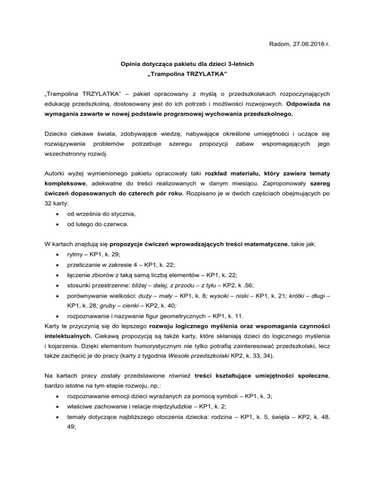 Radom, 27.06.2016 r. Opinia dotycząca pakietu dla dzieci 3-letnich „Trampolina TRZYLATKA” „Trampolina TRZYLATKA” – pakiet opracowany z myślą o przedszkolakach rozpoczynających edukację przedszkolną, dostosowany jest do ich potrzeb i możliwości rozwojowych. Odpowiada na wymagania zawarte w nowej podstawie programowej wychowania przedszkolnego. Dziecko ciekawe świata, zdobywające wiedzę, nabywające określone umiejętności i uczące się rozwiązywania problemów potrzebuje szeregu propozycji zabaw wspomagających jego wszechstronny rozwój. Autorki wyżej wymienionego pakietu opracowały taki rozkład materiału, który zawiera tematy kompleksowe, adekwatne do treści realizowanych w danym miesiącu. Zaproponowały szereg ćwiczeń dopasowanych do czterech pór roku. Rozpisano je w dwóch częściach obejmujących po 32 karty: od września do stycznia, od lutego do czerwca. W kartach znajdują się propozycje ćwiczeń wprowadzających treści matematyczne, takie jak: rytmy – KP1, k. 29; przeliczanie w zakresie 4 – KP1, k. 22; łączenie zbiorów z taką samą liczbą elementów – KP1, k. 22; stosunki przestrzenne: bliżej – dalej, z przodu – z tyłu – KP2, k .56; porównywanie wielkości: duży – mały – KP1, k. 8; wysoki – niski – KP1, k. 21; krótki – długi – KP1, k. 28; gruby – cienki – KP2, k. 40; rozpoznawanie i nazywanie figur geometrycznych – KP1, k. 11. Karty te przyczynią się do lepszego rozwoju logicznego myślenia oraz wspomagania czynności intelektualnych. Ciekawą propozycją są także karty, które skłaniają dzieci do logicznego myślenia i kojarzenia. Dzięki elementom humorystycznym nie tylko potrafią zainteresować przedszkolaki, lecz także zachęcić je do pracy (karty z tygodnia Wesołe przedszkolaki KP2, k. 33, 34). Na kartach pracy zostały przedstawione również treści kształtujące umiejętności społeczne, bardzo istotne na tym etapie rozwoju, np.: rozpoznawanie emocji dzieci wyrażanych za pomocą symboli – KP1, k. 3; właściwe zachowanie i relacje międzyludzkie – KP1, k. 2; tematy dotyczące najbliższego otoczenia dziecka: rodzina – KP1, k. 5, święta – KP2, k. 48, 49; karty związane z bezpieczeństwem (przechodzenie przez ulicę, sygnalizacja świetlna) – KP1, k. 6. Autorki proponują także ćwiczenia odwołujące się do 11. i 12. obszaru podstawy programowej, dotyczących edukacji przyrodniczej i ekologicznej, np.: zmieniających się pór roku: dary jesieni – KP1, k. 4; pogoda – KP1, k. 10; konieczność dbania o zwierzęta – KP1, k. 18; dbanie o przyrodę – KP2, k. 45; niezaśmiecanie jej – KP1, k. 53; podejmowania świadomych decyzji dotyczących własnego zdrowia: dostosowywanie ubioru do pogody – KP1, k. 9, KP2 k. 37; zdrowe odżywianie – KP2, k. 54, 55. Wielkim atutem pakietu jest również przygotowanie dużej liczby różnorodnych ćwiczeń grafomotorycznych: rysowanie po śladzie, kończenie rysunku – KP1, k. 14, 23; KP2, k. 39, 41; ćwiczenia rozwijające spostrzegawczość: różnice – KP1, k. 5; KP2, k. 44; szukanie ukrytych elementów – KP1, k.16; skojarzenia KP1, k. 1; labirynty KP1, k. 13, 25, 31. Karty te z pewnością przyczynią się do rozwoju analizy i syntezy wzrokowo-słuchowej, koordynacji wzrokowo-ruchowej oraz motoryki małej i wielkiej. Bardzo trafną propozycją jest „Kącik artysty”, który składa się z 20 kart do: wypychania, wycinania, sklejania, kolorowania, ozdabiania, tworzenia prac plastycznych i technicznych, obejmujących formy płaskie i przestrzenne. Taka różnorodność technik pozwoli przedszkolakom na gruntowne przygotowanie się do podjęcia nauki w szkole. Szczególnie przydatnymi ćwiczeniami są „wypychanki”, które usprawniają dłoń małego dziecka, jednocześnie przygotowując je do prawidłowego trzymania narzędzia piśmienniczego z odpowiednim napięciem mięśniowym. Całościowym uzupełnieniem pakietu są „Zabawy z Trampolinkiem”. To zestaw 10 kart do wykorzystania przez cały rok. Zawierają propozycje typu: memo, puzzle, liczmany oraz historyjki obrazkowe: 1 – liczmany – owoce, 2 – liczmany – zwierzęta egzotyczne, 3 – memory – zabawki, 4 – pary kartoników z obrazkami, zdjęcia, których nazwy się rymują, 5 – historyjka obrazkowa, 6 – historyjka obrazkowa, 7 – puzzle z Trampolinkiem, 8 – puzzle, 9 – obrazki do przewlekania, 10 – nalepki z Trampolinkiem do dowolnego wykorzystania przez dziecko. Na szczególną uwagę zasługują historyjki obrazkowe, kartoniki z obrazkami oraz puzzle, które pozwolą na wspomaganie rozwoju mowy dziecka, poszerzą jego wyobraźnię i działania twórcze. Szczegółowe opisy ilustracji oraz zaplanowane nalepki zapowiadają atrakcyjną szatę graficzną, która będzie dodatkową zachętą do dziecięcych działań. Na podstawie analizy rozkładu materiału dla 3- i 4-latków można stwierdzić, że treści pakietów „Trampolina TRZYLATKA” i „Trampolina CZTEROLATKA” będą ze sobą spójne i będą stanowiły wzajemnie uzupełniającą się całość. Będzie je można wykorzystywać do pracy w grupach mieszanych wiekowo. Sugestie recenzentów, które wypłynęły podczas konsultacji, zostały uwzględnione przez redakcję podczas przygotowywania ostatecznej wersji kart. Po wnikliwej analizie treści przewidzianych w pakiecie „Trampolina TRZYLATKA” możemy stwierdzić, że autorki opracowały ciekawy, dostosowany do potrzeb i możliwości, bogaty w różnorodne metody i formy pracy materiał do realizacji z dziećmi 3-letnimi. Pakiet ten proponujemy i polecamy nauczycielom wychowania przedszkolnego. Opinię przygotowały: Danuta Chrzanowska doradca metodyczny wychowania przedszkolnego i edukacji wczesnoszkolnej Katarzyna Kozłowska nauczyciel dyplomowany wychowania przedszkolnego