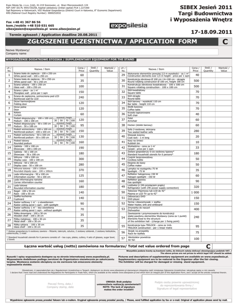 Expo Silesia Sp. z o.o. (Ltd), 41-219 Sosnowiec, ul. Braci Mieroszewskich 124 NIP (VAT ID) PL 9591726258, Kapitał zakładowy (Initial capital) PLN 1.227.000 Sąd Rejonowy w Katowicach, VIII Wydział Gospodarczy (District Court in Katowice, 8th Economic Department) KRS (National Court Registry Number) 0000252032 SIBEX Jesień 2011 Targi Budownictwa i Wyposażenia Wnętrz Fax +48 41 367 86 56 kom./mobile +48 510 031 665 [email protected] www.sibexjesien.pl 17-18.09.2011 Termin zgłoszeń / Application deadline 20.08.2011 C ZGŁOSZENIE UCZESTNICTWA / APPLICATION FORM Nazwa Wystawcy/ Company name WYPOSAŻENIE DODATKOWE STOISKA / SUPPLEMENTARY EQUIPMENT FOR THE STAND LP. / No. 1 2 3 4 5 6 7 8 9 10 11 12 Nazwa / Item Ściana biała do zaplecza - 100 x 250 cm White panel wall - 100 x 250 cm Ściana biała do zaplecza - 50 x 250 cm White panel wall - 50 x 250 cm Ściana szklana - 100 x 250 cm Glass wall - 100 x 250 cm 2 Ściana z plexi - za 1 m Plexiglass wall - price per 1 sqm Ściana do zapleczna, wzmocniona pod LCD Reinforced wall for LCD Drzwi harmonijkowe Folding door Drzwi pełne Door Kotara Curtain wysokość /height Podest ekspozycyjny - 100 x 100 cm 30 50 70 100 Podium - 100 x 100 cm wysokość /height Podest ekspozycyjny - 50 x 100 cm 30 50 70 100 Podium - 50 x 100 cm wysokość /height Podest wzmocniony - 100 x 100 cm 30 50 70 100 Reinforced podium - 100 x 100 cm wysokość /height Podest wzmocniony - 50 x 100 cm 30 50 70 100 Reinforced podium - 50 x 100 cm Cena / Price Wykonanie elementów powyżej 2,5 m wysokości - za 1 m Construction elements over 2,5 m height - price per 1 sqm 60 36 120 37 Konstrukcja obrotowa Ø 100 cm i H=100 cm - okrągła Round rotating construction Ø 100 cm, height 100 cm Konstrukcja obrotowa kwadratowa - 100 x 100 cm Square rotating construction - 100 x 100 cm Stół kwadratowy Square table Stół okrągły Round table Stół barowy - wysokość 110 cm Bar table - height 110 cm Stolik kawowy Coffee table Krzesło tapicerowane Soft chair Fotel Armchair 95 38 Hocker (stołek barowy) 150 39 130 40 Sofa 2-osobowa, skórzana Two seated leather sofa Wieszak ścienny Coat rack - 1 m long Kosz na śmieci Rubbish bin 2 Wykładzina - cena za 1 m Carpet - price per 1 sqm Zestaw gospodarczy 6-cio osobowy typowy* Standard household utensils for 6 persons* Czajnik bezprzewodowy Cordless kettle Ekspres do kawy Coffee maker Lampka na wysięgniku 75 W Spotlight - 75 W Reflektor halogenowy 150 W Halogen spotlight - 150 W Reflektor gazowy Gas spotlight Lodówka (z 24h przyłączem prądu) Refrigerator (with 24h power supply connection) Telewizor Plazmowy lub LCD do 42’’ Plasma or LCD TV up to 42’’ Odtwarzacz DVD DVD player Terma i zlewozmywak + szafka Water heater, sink and sinkboard Zmywarka do naczyń Dishwasher Zawieszenie i przymocowanie do konstrukcji stałej pawilonu elementów Wystawcy (cena za 1 punkt) Elements fixed to the structure of the exhibition hall - (charge per 1 fixing point) 35 30 100 31 150 32 240 33 120 34 120 35 Półka metalowa - 100 x 30 cm Metal shelf - 100 x 30 cm 35 28 Półka szklana - 100 x 30 cm Glass shelf - 100 x 30 cm 35 16 17 18 19 20 21 22 23 24 25 Cena / Price Nazwa / Item 29 27 15 LP. / No. 60 26 13 Wartość / Value Ilość / Quantity Wartość / Value 2 wysokość /height Podest łukowy 30 50 70 100 Rounded podium Gablota - 100 x 100 cm Showcase - 100 x 100 cm Gablota - 50 x 100 cm Showcase - 50 x 100 cm Witryna - 100 x 100 cm Display case - 100 x 100 cm Witryna - 50 x 100 cm Display case - 50 x 100 cm Witryna łukowa - 100 x 100cm Rounded dispaly case - 100 x 100cm Lada informacyjna - 50 x 100 cm Information counter - 50 x 100 cm Lada informacyjna narożna Corner information counter Lada łukowa Rounded information counter Regał - 100 x 50 cm Rack - 100 x 50 cm Szafka kuchenna Cupboard 2 Raster sufitowy 1 m - z oświetleniem Raster ceiling panel 1 sqm - with spotlight 2 Raster sufitowy 1 m - bez oświetlenia Raster ceiling panel 1 sqm - without spotlight Półka drewniana - 100 x 30 cm Wooden shelf - 100 x 30 cm 14 Ilość / Quantity 160 41 190 42 180 43 300 44 280 45 370 46 125 47 160 48 180 49 140 50 140 51 90 52 70 53 35 54 55 * Zestaw gospodarczy 6 osobowy zawiera – filiżanki, talerzyki, sztućce, 2 zestawy szklanek, 2 zestawy kieliszków, cukierniczka, 2 miski * Standard household utensils for 6 persons consists of – tea cups, plates, cutlery, 4 sets of glasses, sugar bowl, 2 bowls 56 57 40 500 500 70 70 70 70 40 60 60 Konstrukcja typu TRILOCK - cena za 1mb. TRILOCK construction - per 1 linear metre Stojak na prospekty Rack for leaflets Wentylator powietrza Air fan 280 20 10 33 180 50 50 35 60 90 320 1 000 150 150 400 240 95 75 100 Łączna wartość usług (netto) zamówiona na formularzu/ Total net value ordered from page C Wszystkie podane kwoty są kwotami netto, do których należy doliczyć obowiązujący podatek VAT. / The above prices are net prices to which legal VAT should be added. Rysunki i opisy wyposażenia dostępne są na stronie internetowej www.exposilesia.pl. Wyposażenie dodatkowe podlega zwrotowi do Organizatora niezwłocznie po zakończeniu targów. Wystawca zostanie obciążony za nie zwrócone lub zniszczone elementy wyposażenia stoiska. Pictures and descriptions of supplementary equipment are available on www.exposilesia.pl. Supplementary equipment are to be restored to the Organizer after the fair closing. The Exhibitor will be charged for damaged or missing stand equipment. Oświadczam, iż zapoznałem/łam się z Regulaminem Uczestnictwa w Targach, dostępnym na stronie www.sibexjesien.pl stanowiącym integralną część niniejszego Zgłoszenia Uczestnictwa i akceptuję zapisy w nim zawarte I declare that I have read and understood the Regulations for Participants in Trade Fairs, which are available at the website www.sibexjesien.pl and which form an integral part of this Application Form, and I accept all the articles contained therein. Pieczęć firmy, data / Company stamp, date UWAGA